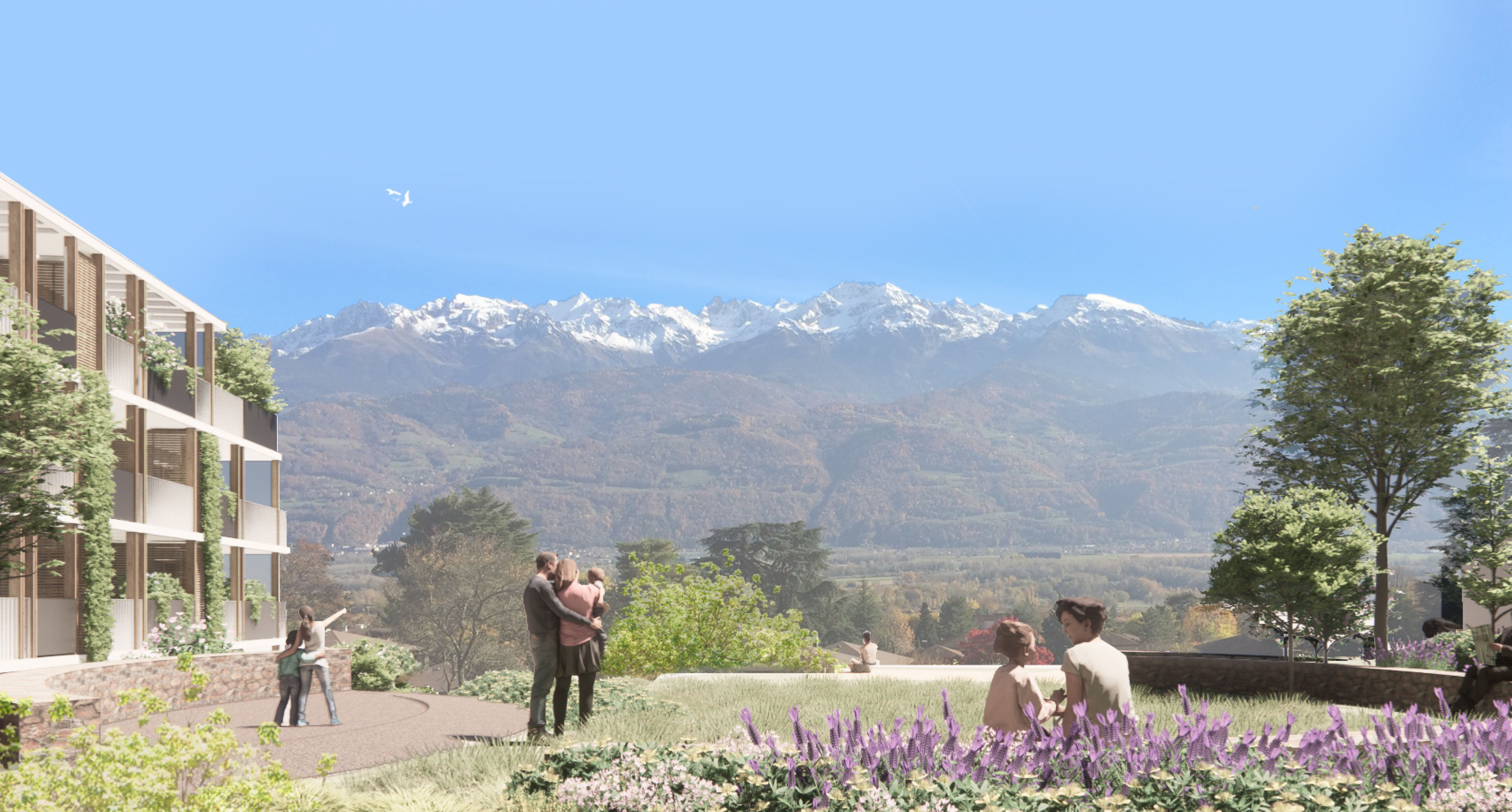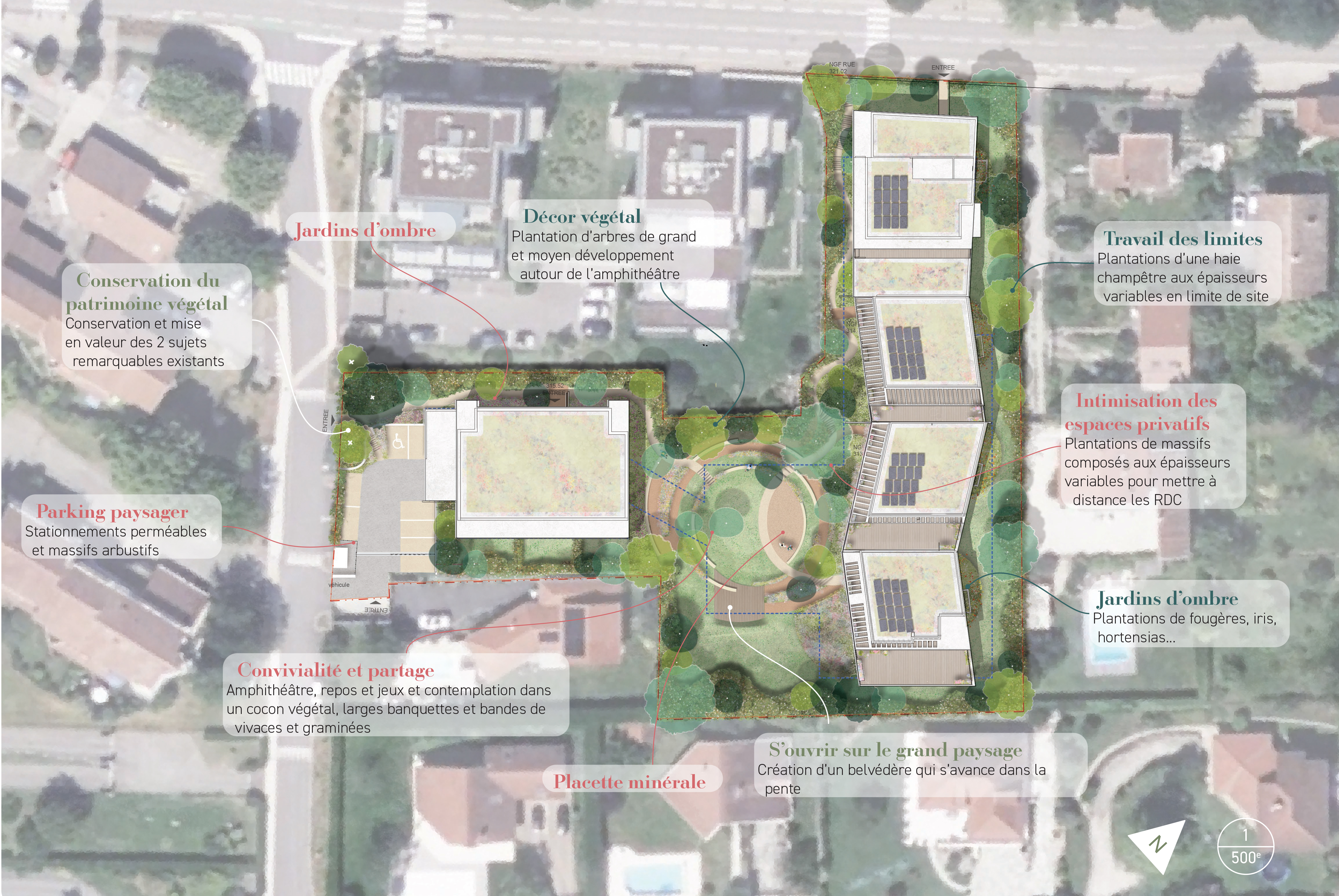 Le projet s’intègre dans la topographie naturelle du terrain. Au cœur de la parcelle, un vaste belvédère paysager s’ouvre et propose un espace d’échange, encourageant le vivre-ensemble.
