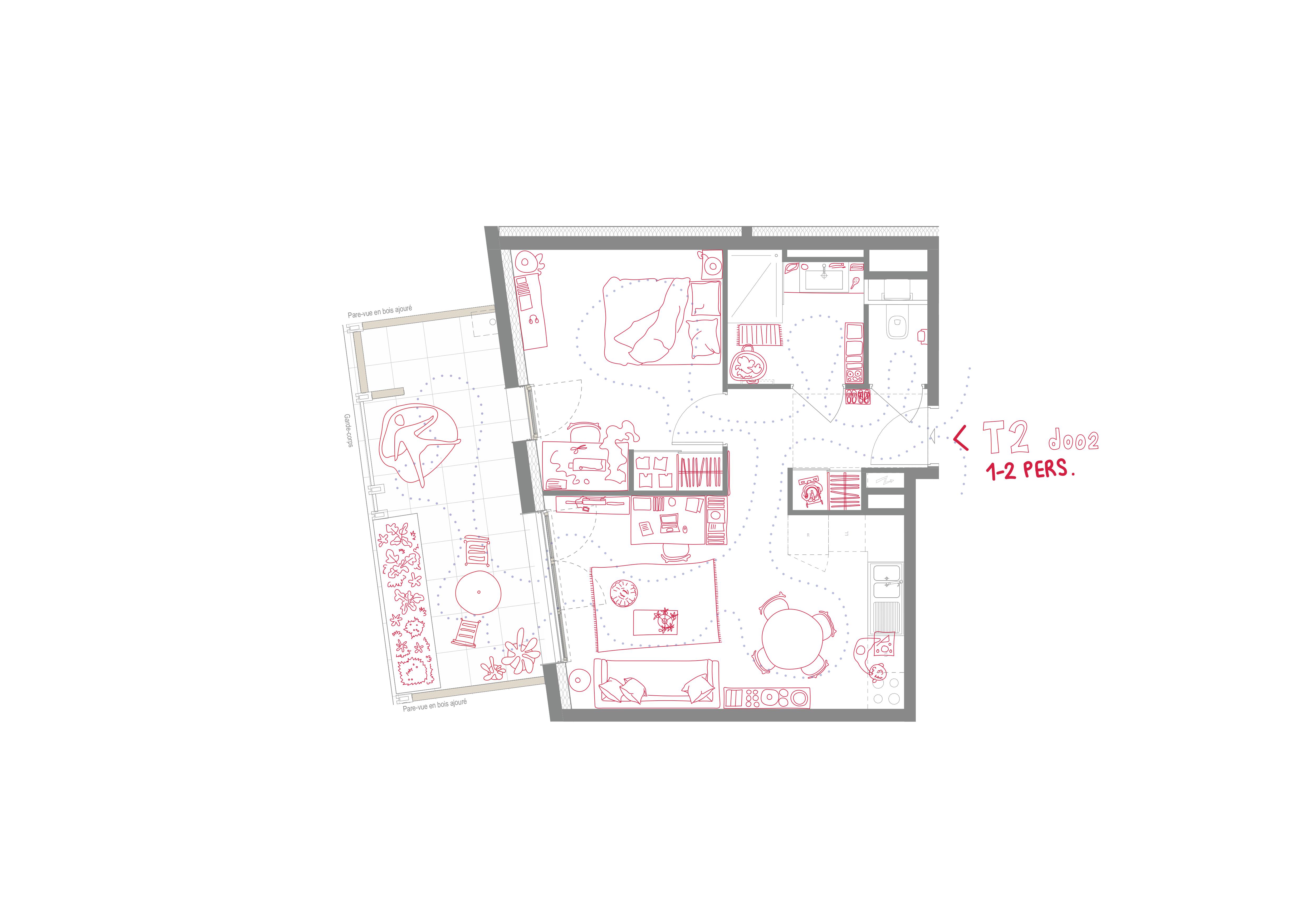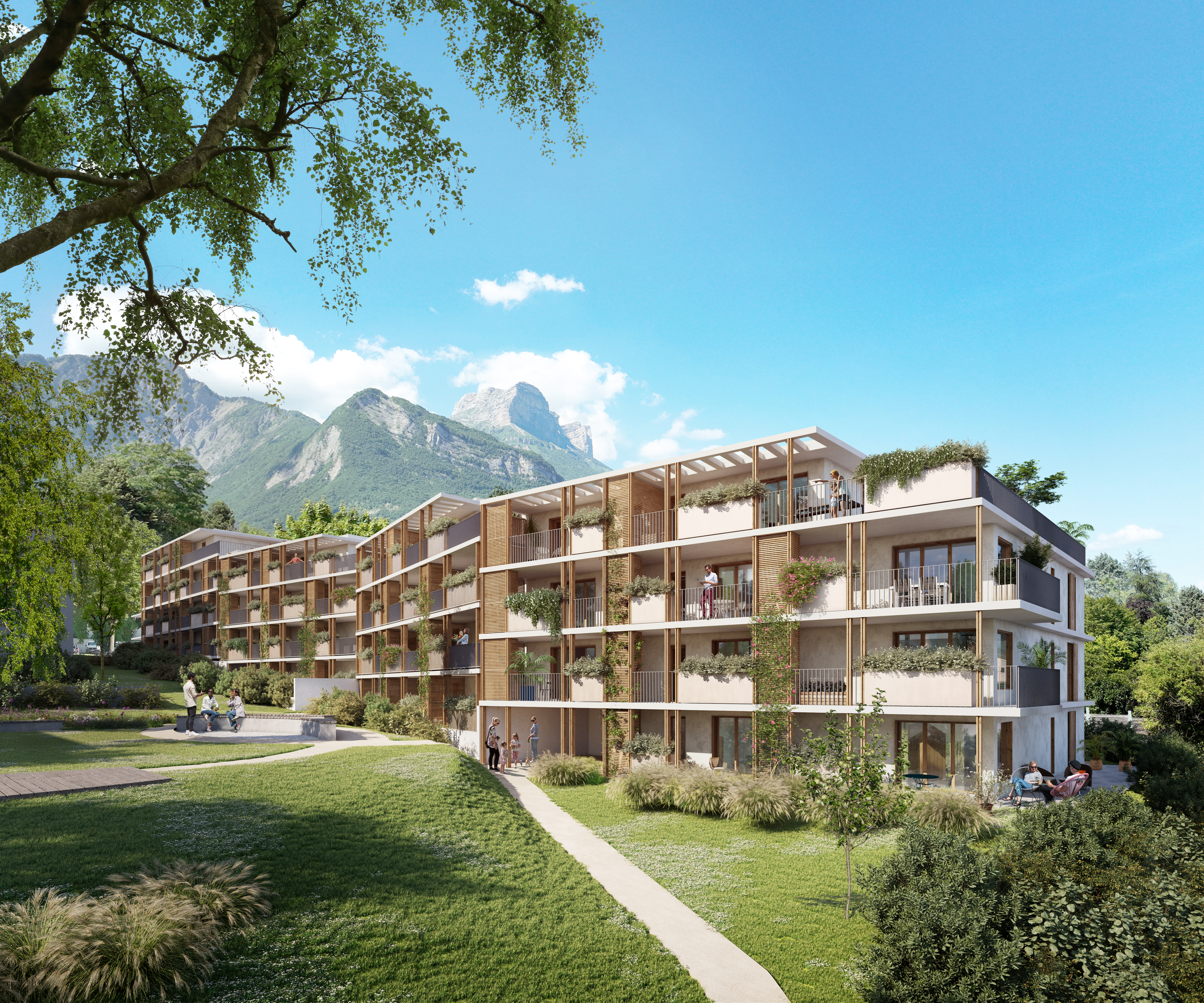 Le bois naturel, intégré dans le système structurel des balcons désolidarisés, permet d’améliorer la performance thermique grâce à des rupteurs intégrés au niveau des planchers, tout en réduisant le bilan carbone du projet. Il contribue également à mieux gérer l’intimité entre les logements, tout en maintenant un dialogue avec la nature.