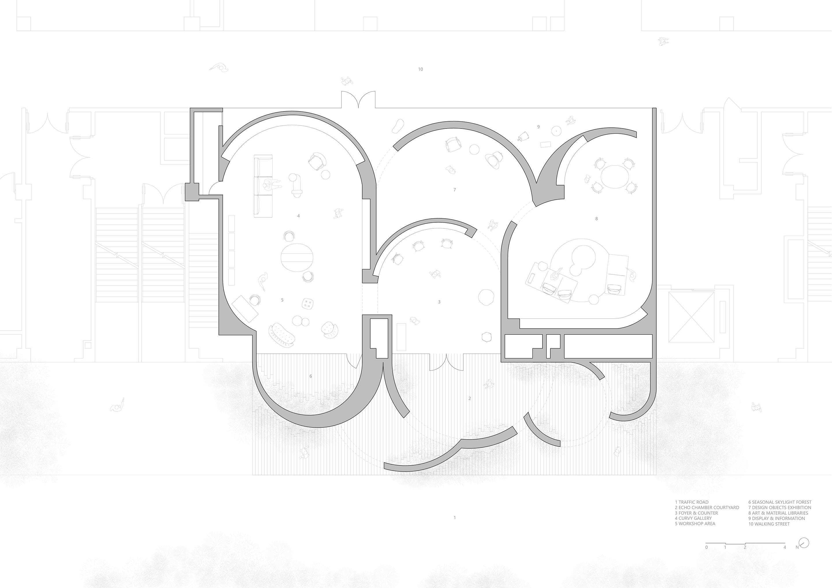 The echo chamber courtyard in front of the museum attracts insects and animals such as cicadas and birds from the natural environment during the day through the fragrant landscape greenery. This brings visitors a rich and diverse auditory feast and introduces a refreshing and natural micro-ecosystem to the noisy surroundings, providing city residents with a different sense of relaxation. In the afternoon, the curved walls block the harsh western sunlight, allowing partial sunlight to filter into the echo chamber courtyard, creating a sacred space reminiscent of a church. This adds a sense of extraordinary ritual to the otherwise mundane city life. The internal space is influenced by the external architecture, with its curved walls extending from the outside to the inside, creating a dynamic and flowing effect that subtly merges the interior and exterior spaces. Visitors pass through the foyer to reach the curvy gallery, where the towering walls of the exterior seasonal skylight forest garden have no openings, except for a five-meter-high skylight. This forest area, in coordination with the movement of the sun, casts unique light and shadows on the seasonal trees below, giving the space a timeless and eternal feeling. On the other side, the art and materials library features continuous and unending walls that combine art collections with handcrafted wooden furniture, providing visitors with a relaxed and unpressured viewing experience.