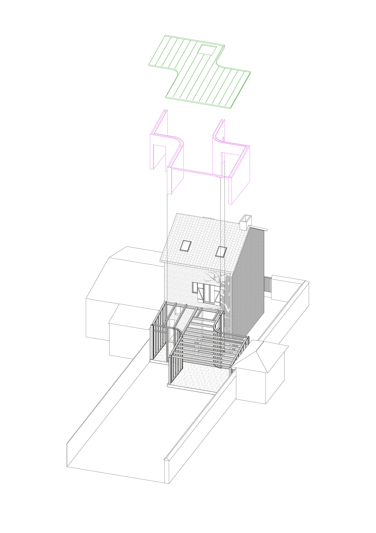 Le projet d’extension 028MLJ expérimente les frontières avec son environnement, le traditionnel et le minimalisme, la courbe et le vif. Son implantation dans le jardin contourne la réglementation urbaine Mantaise. En effet, celle-ci exige la création d’un volume strictement aligné et dans le prolongement de la maison qui aurait alors renforcé l’effet de couloir du passage latéral et restreint le nombre d’ouvertures. Or, les deux parcelles voisines présentent en mitoyenneté de petites constructions adossées aux murets séparatifs qui justifient une désolidarisation de l’extension à l'existant.