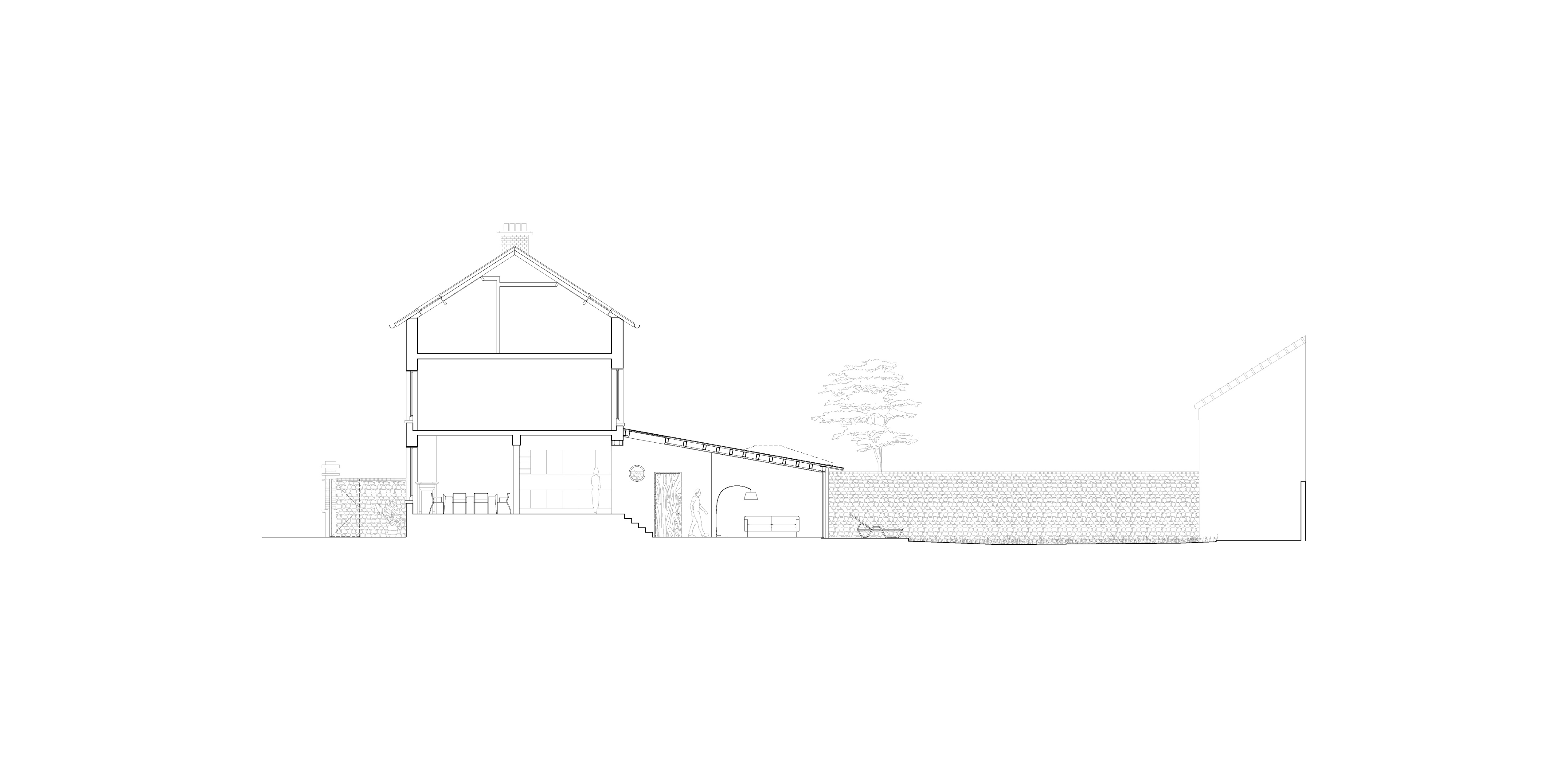 Dans l’alignement du muret mitoyen en pierre, les baies coulissantes ouvertes sur le patio et celles sur le jardin se répondent. Le muret file, se reflétant dans les baies d'aluminium brut. Celles-ci contribuent à conserver la dimension traversante de la parcelle. Le puits de lumière procure, lui, une vue émergente sur la façade en pierre de la maison. Toutes les ouvertures s’organisent autour d’un axe principal entre le rez-de-chaussée haut de l’existant et le rez-de-chaussée bas créé par le projet. Cet axe offre une percée allant de la rue jusqu’au jardin, aucun cul de sac physique ou visuel. Véritable colonne vertébrale qui traverse l’extension, il construit un lieu scindé en deux espaces, contenus par les bras courbes. La structure hybride mise en place libère les nouveaux espaces de tout point porteur et d’une organisation déterminée. Une identité forte, sans usages préconçus, où quel que soit le point de vue, le lieu change et évolue. Exempte de toute symétrie et répétition, la perception de la surface construite s’en retrouve étendue. La dalle de béton qui s'épanouit du patio à la terrasse du jardin, finit ce continuum extérieur-intérieur. La neutralité des matériaux employés laisse opérer les ombres portées de la toiture anguleuse aux murs courbes blancs et sol de béton poreux.