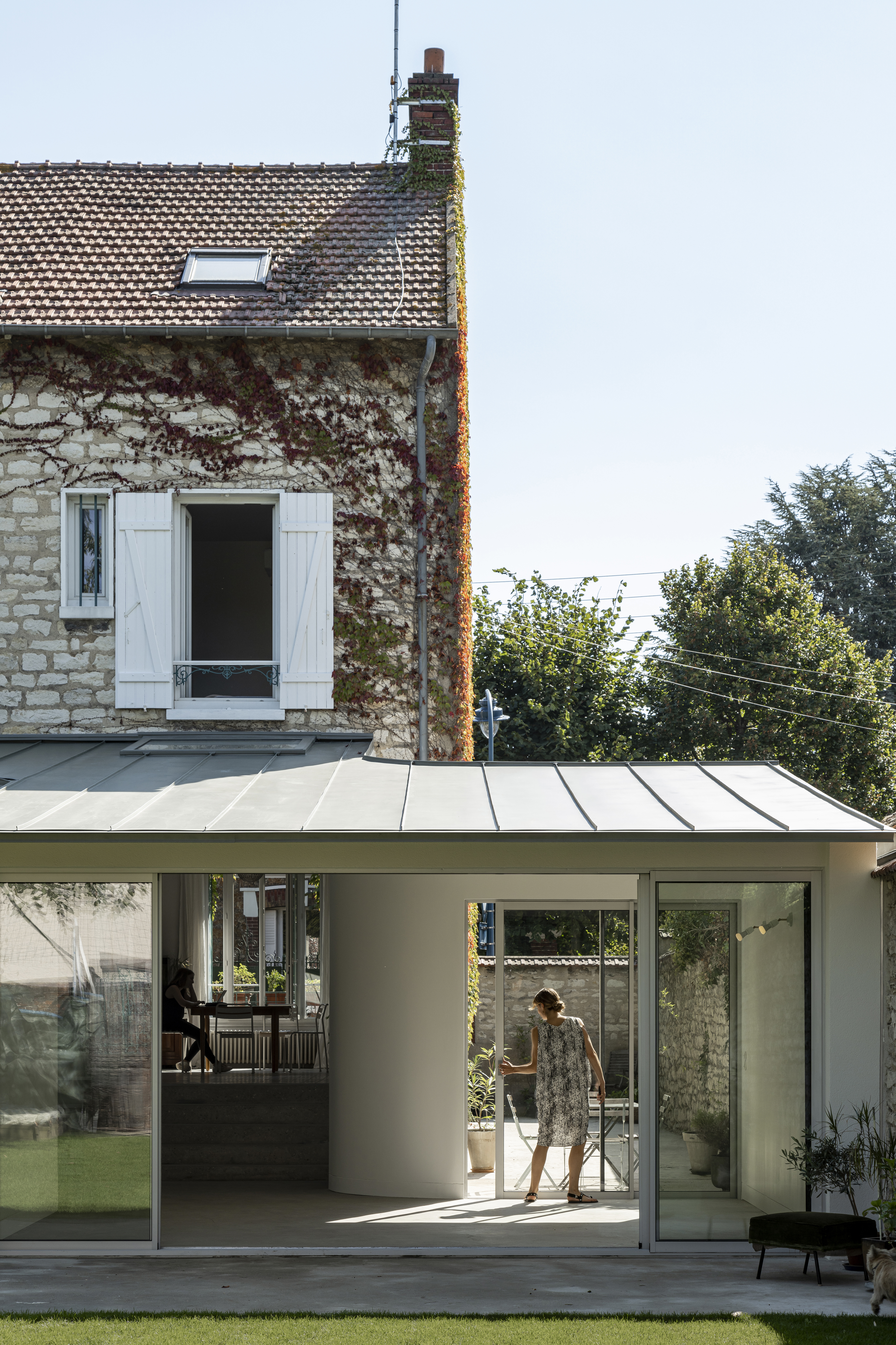 Au niveau du pignon végétalisé de la maison, le retrait de l’extension préserve les éléments en angle de la façade existante tels que sa vigne vierge et la gouttière. Composant avec les hauteurs de celles voisines, une fine toiture en zinc vert se lit depuis les étages comme une continuité du jardin. L’utilisation de joints debouts renforce les arêtes de cette feuille unificatrice conférant l’aspect contemporain du projet. En débord sur le jardin avec une sous face en chêne, elle rase les murs du patio. Aucune orientation n’est privilégiée. Portes fenêtres, baies coulissantes, puits de lumière, oculus, la variété des ouvertures, en plus de faire entrer la lumière en tous points, offre autant de rapports diversifiés avec l’existant et de percées visuelles.