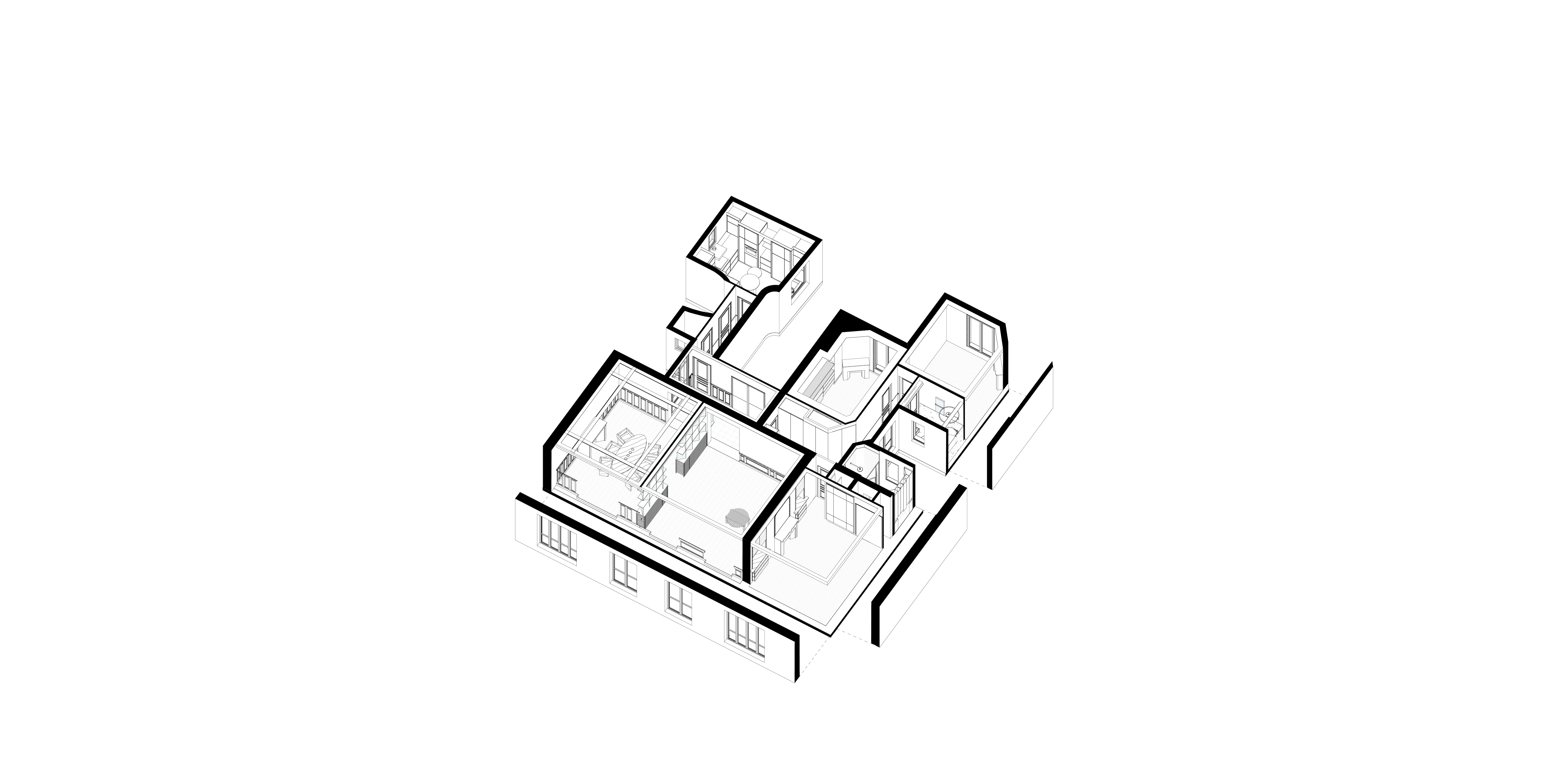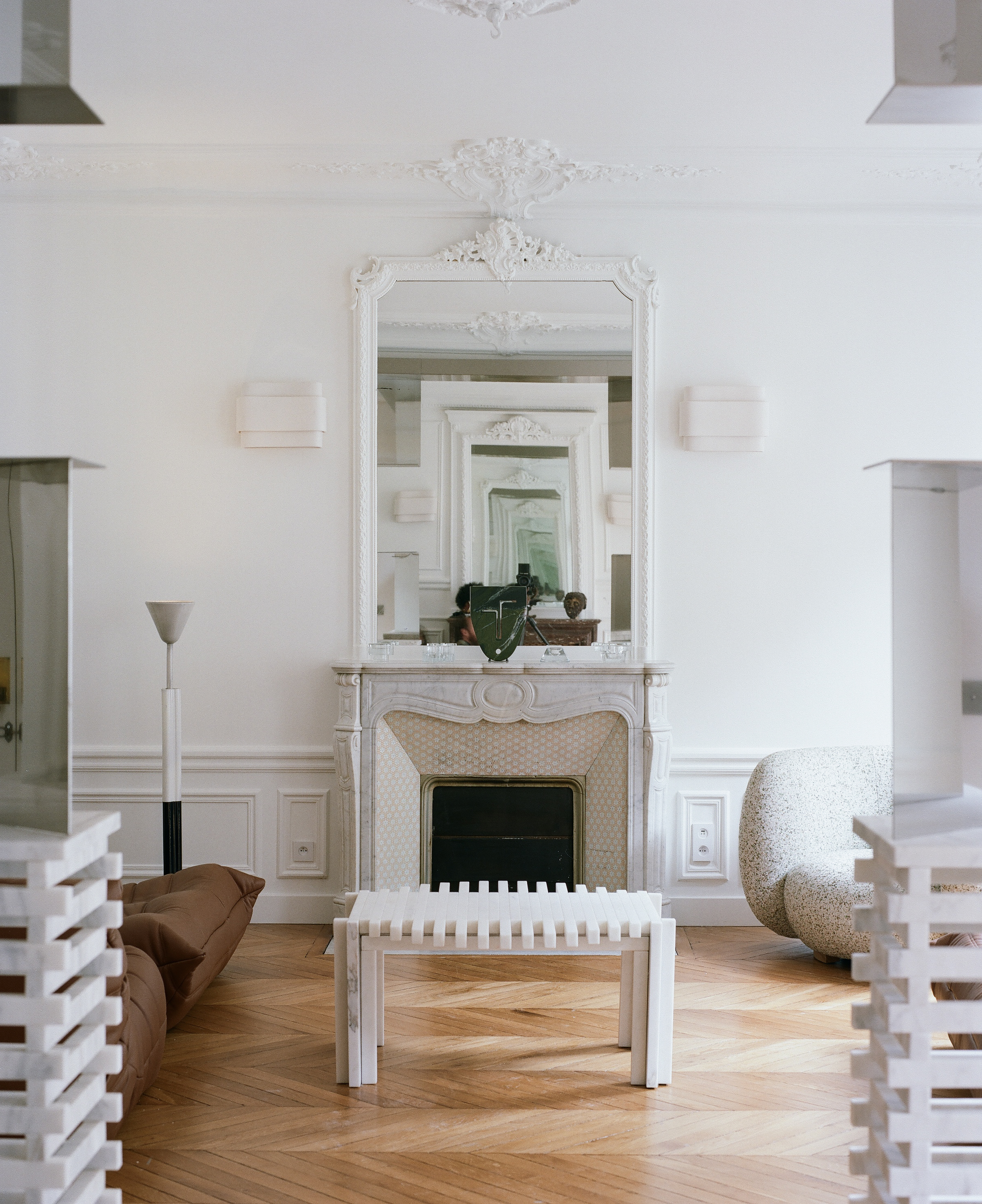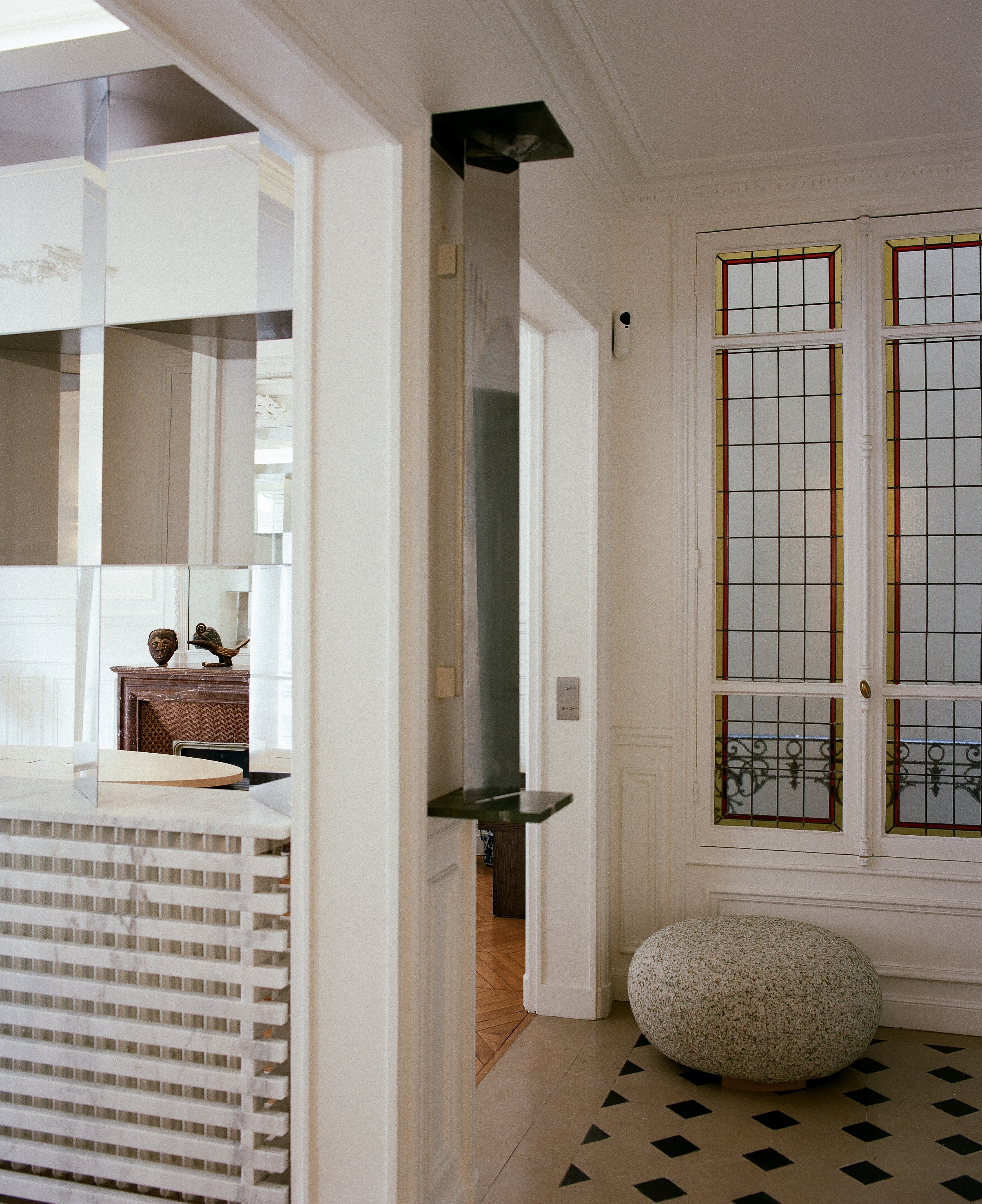 L’intervention conserve le caractère haussmannien de l’appartement, avec ses boiseries sculptées, vitraux, parquets en chevrons, grandes baies vitrées et sa déclinaison de manteaux de cheminée en marbre. Afin d’adapter l’espace à ses nouveaux occupants, le projet a d'abord permis le décloisonnement de la pièce de vie principale.