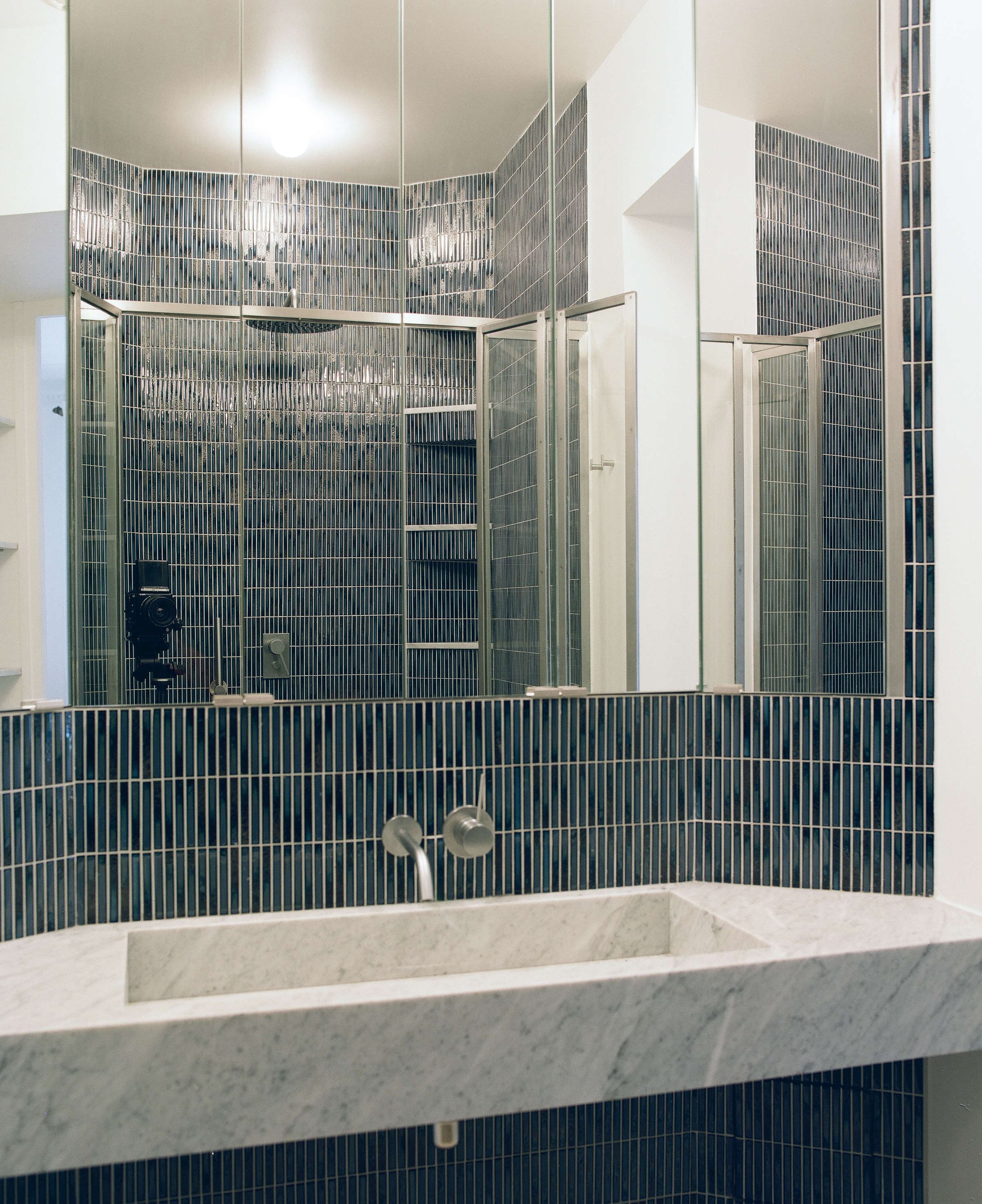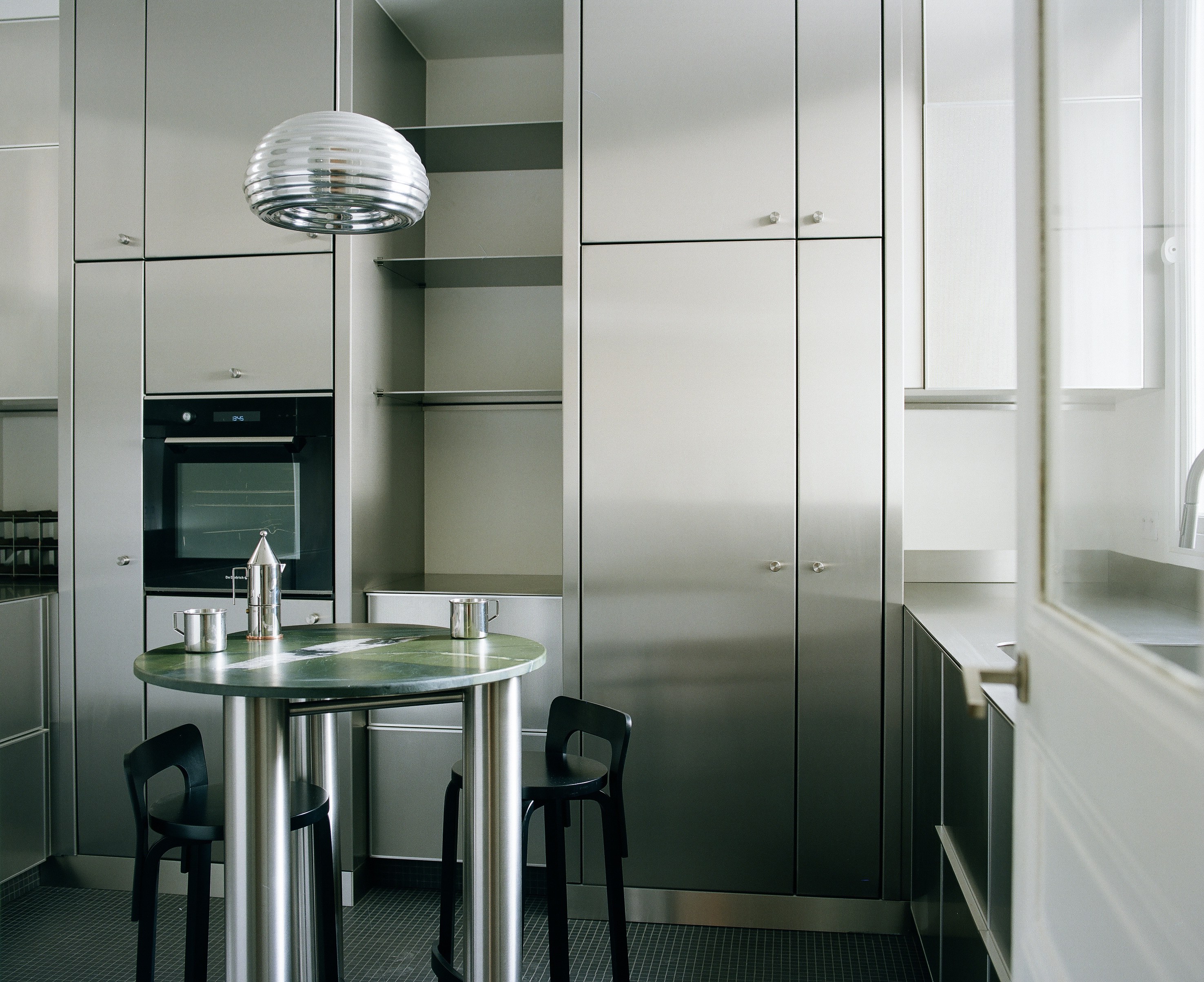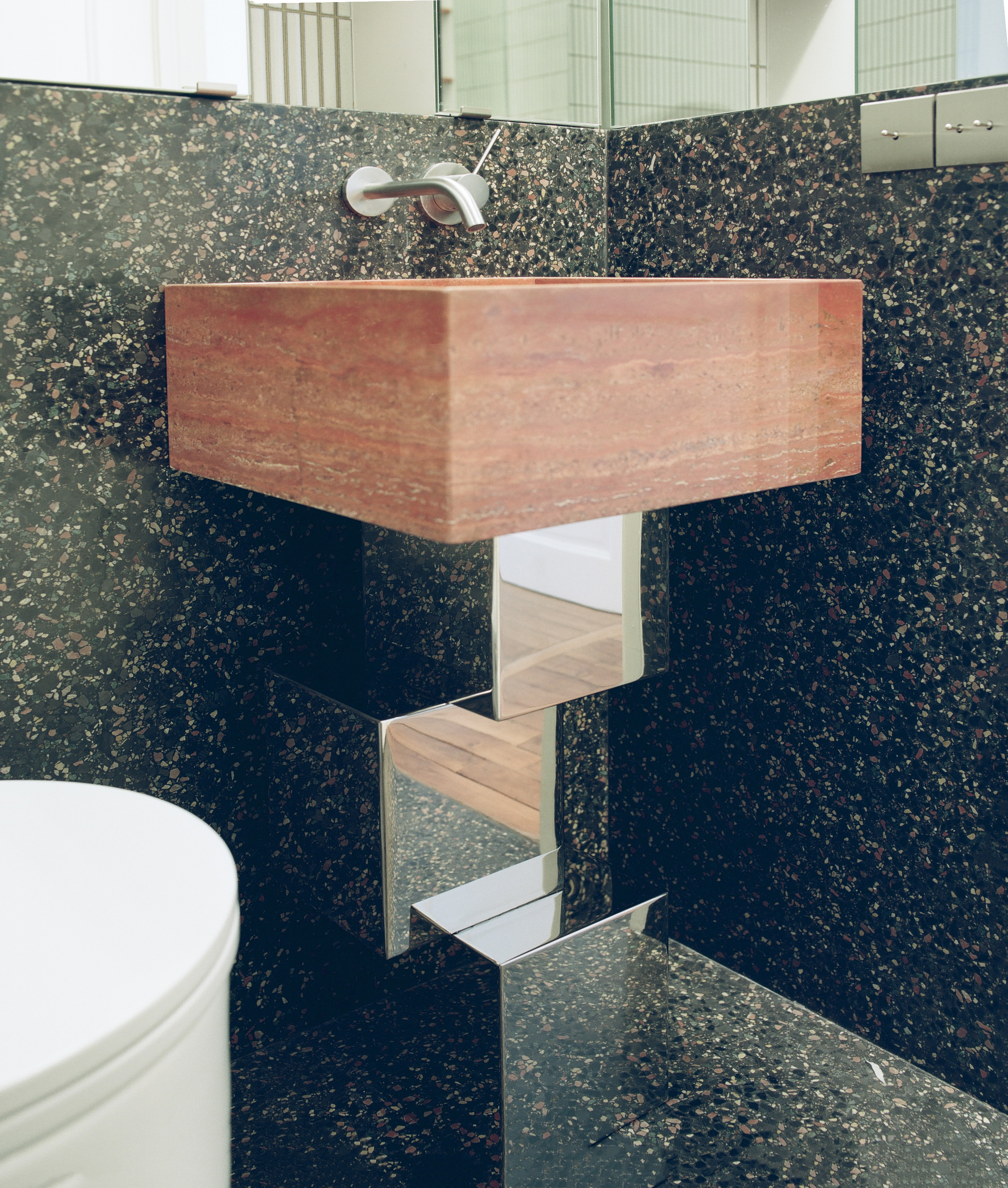 En parallèle à ce travail spatial, l’intervention sur la cuisine offre une nouvelle identité à l’espace grâce à son esthétique distinctive, avec l’amalgame de l’inox, du sol carrelé et de l'îlot circulaire au plateau en marbre vert. Ce travail d’agencement des matières se retrouve également dans le traitement des salles de bains, où la composition est renforcée par la singularité des surfaces en terrazzo de pierres précieuses combinées aux fins carrelages japonais.