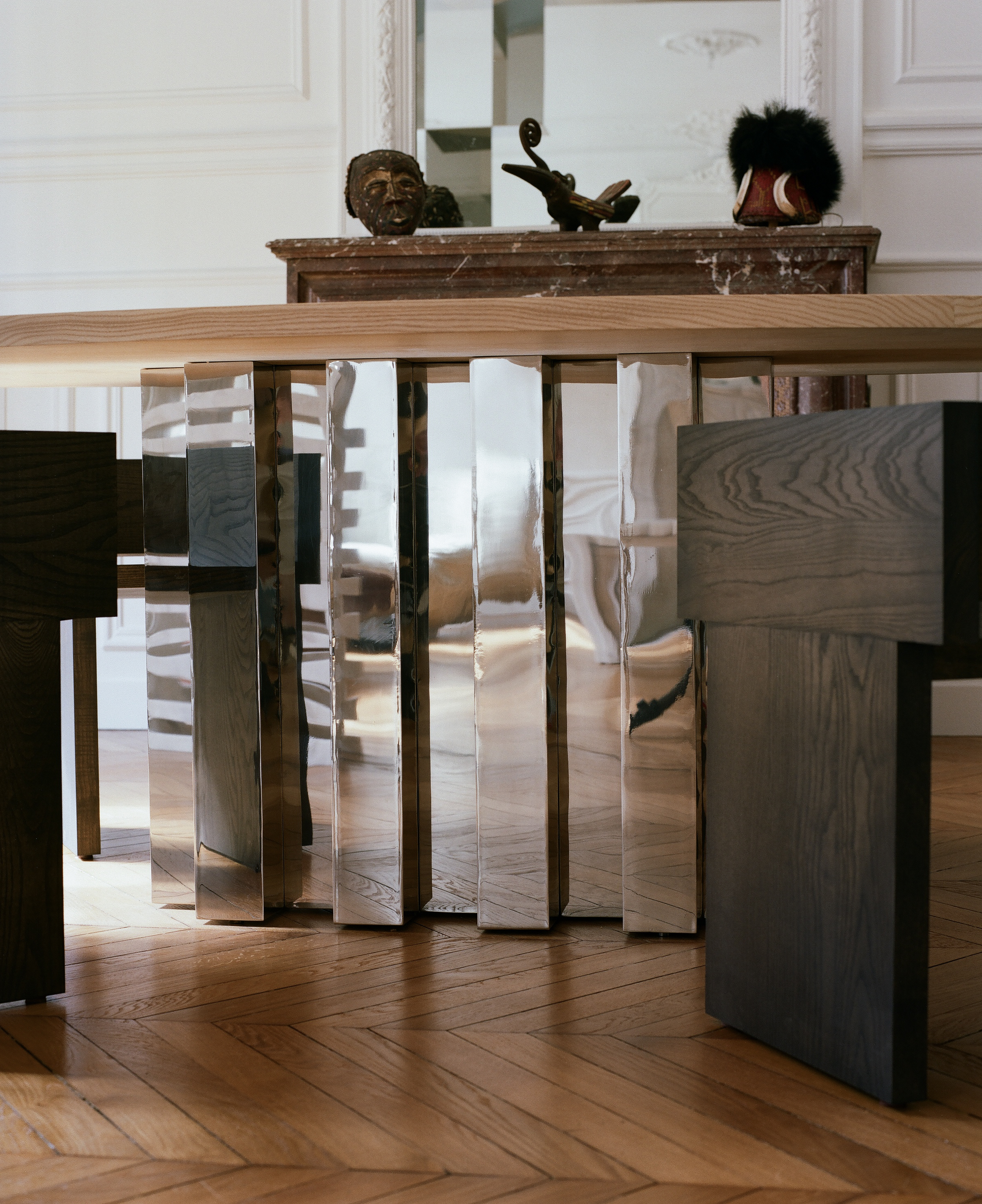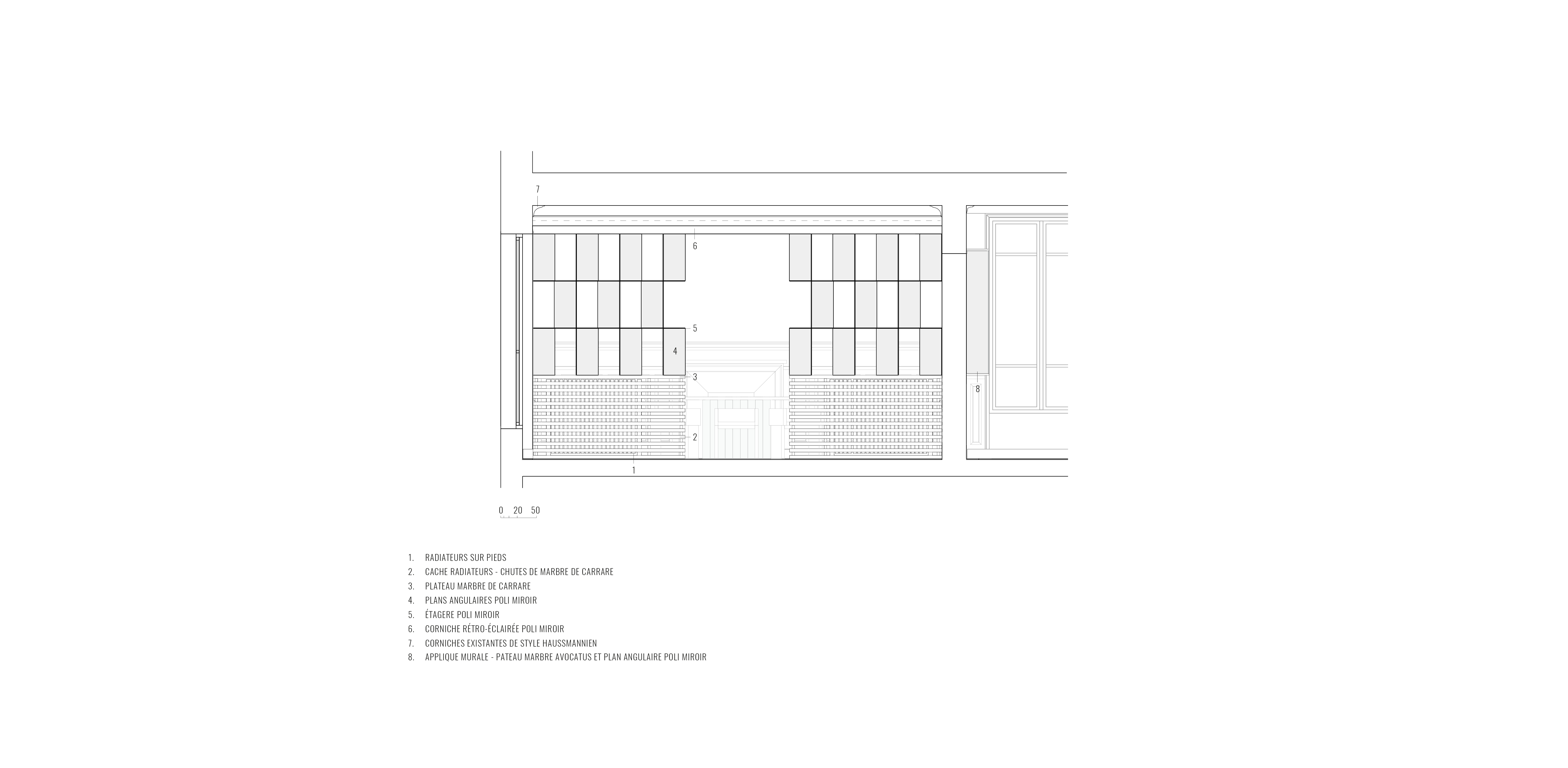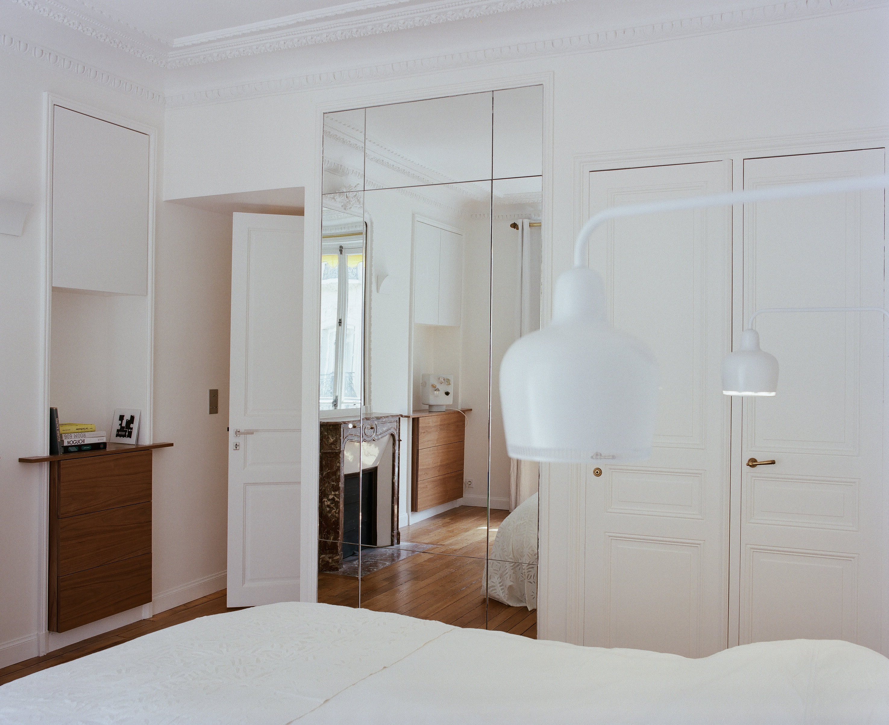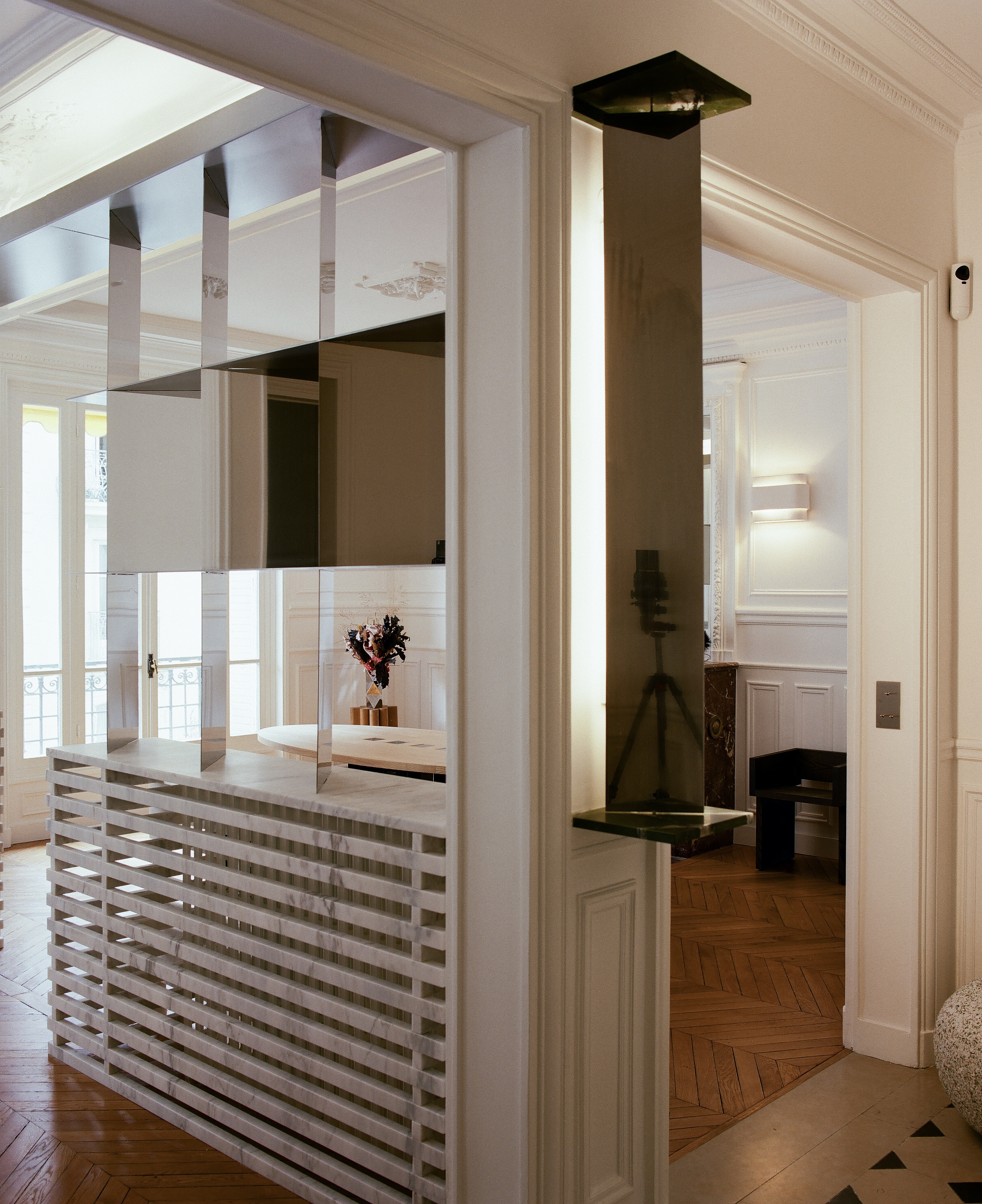 Au-delà de cette approche des matières, le projet tire son essence du mobilier conçu spécifiquement pour l’unité afin d’assurer une totale cohésion entre son cadre patrimonial et l’intervention contemporaine. Cette série de pièces artisanales exprime une logique cohérente fondée sur une recherche entre fonction et esthétique. Ces objets, qui font partie intégrante de la démarche, s’expriment notamment dans la conception de la partition du séjour qui remplit un double rôle en tant que cache-radiateur et cloison spatiale réfléchissante. Réalisé en tasseaux de marbre de Carrare et en poli miroir, cet objet sculptural vient dialoguer avec l’espace en offrant une série de tableaux par les réflexions de ses 18 facettes inclinées.