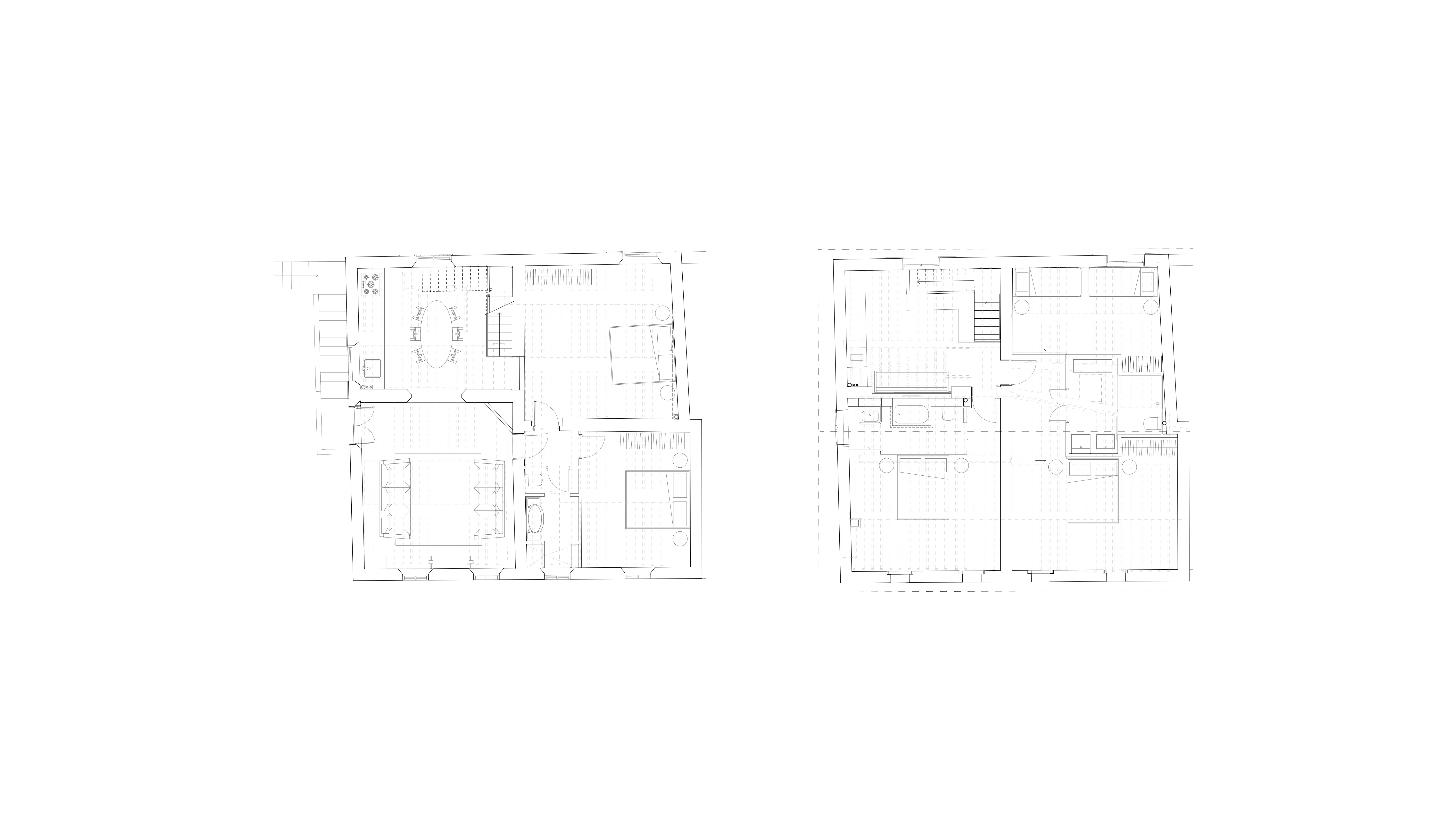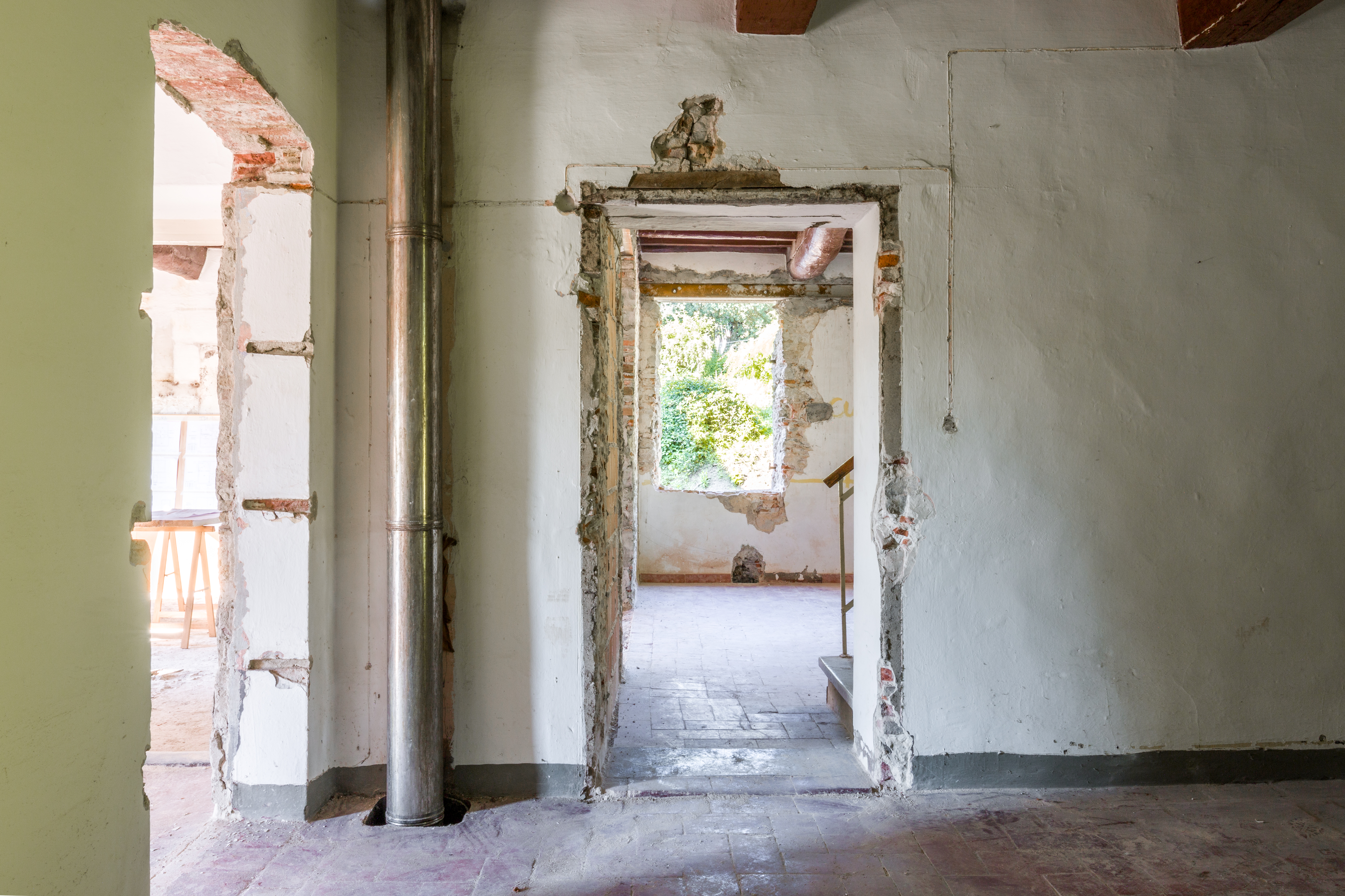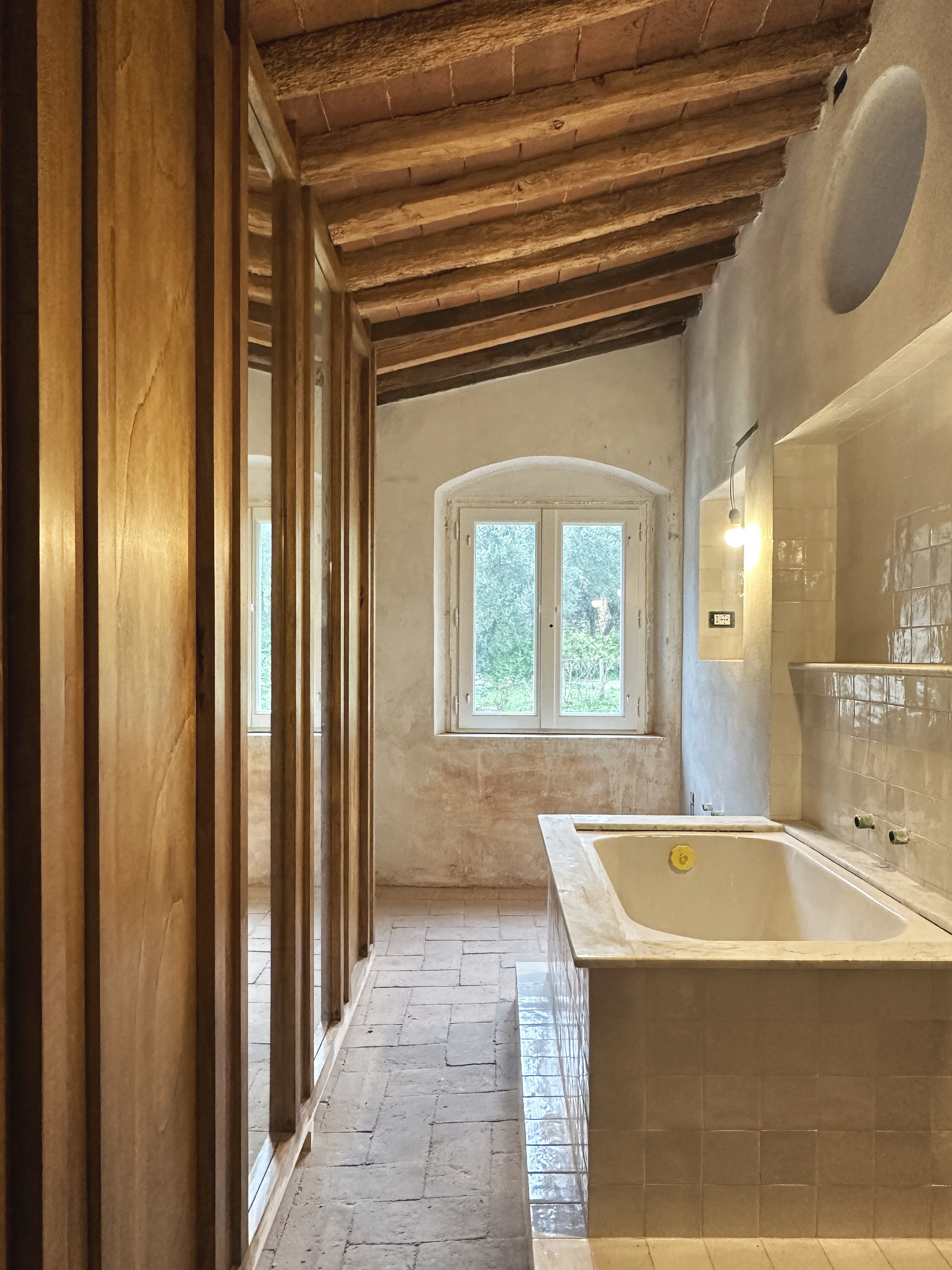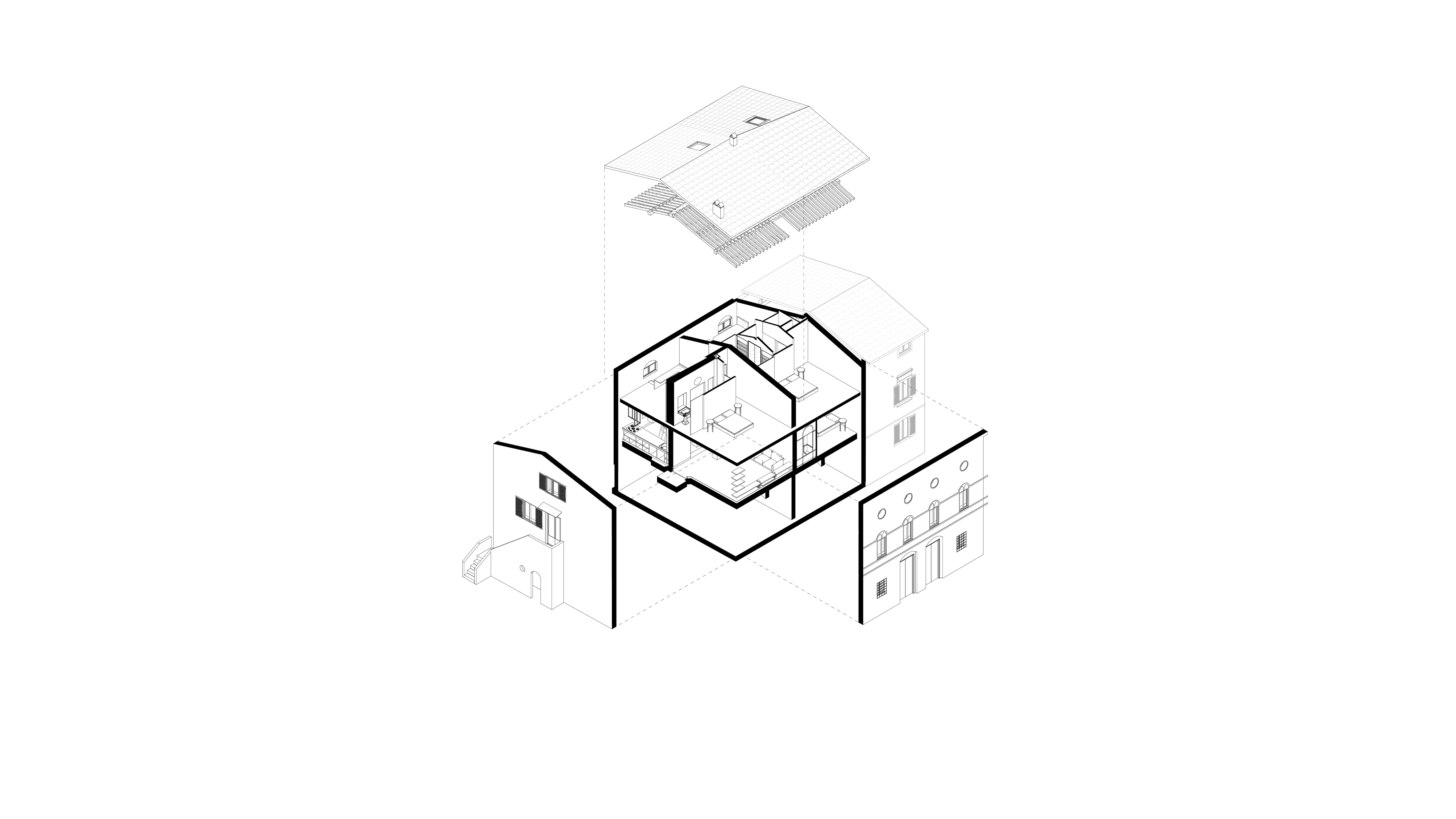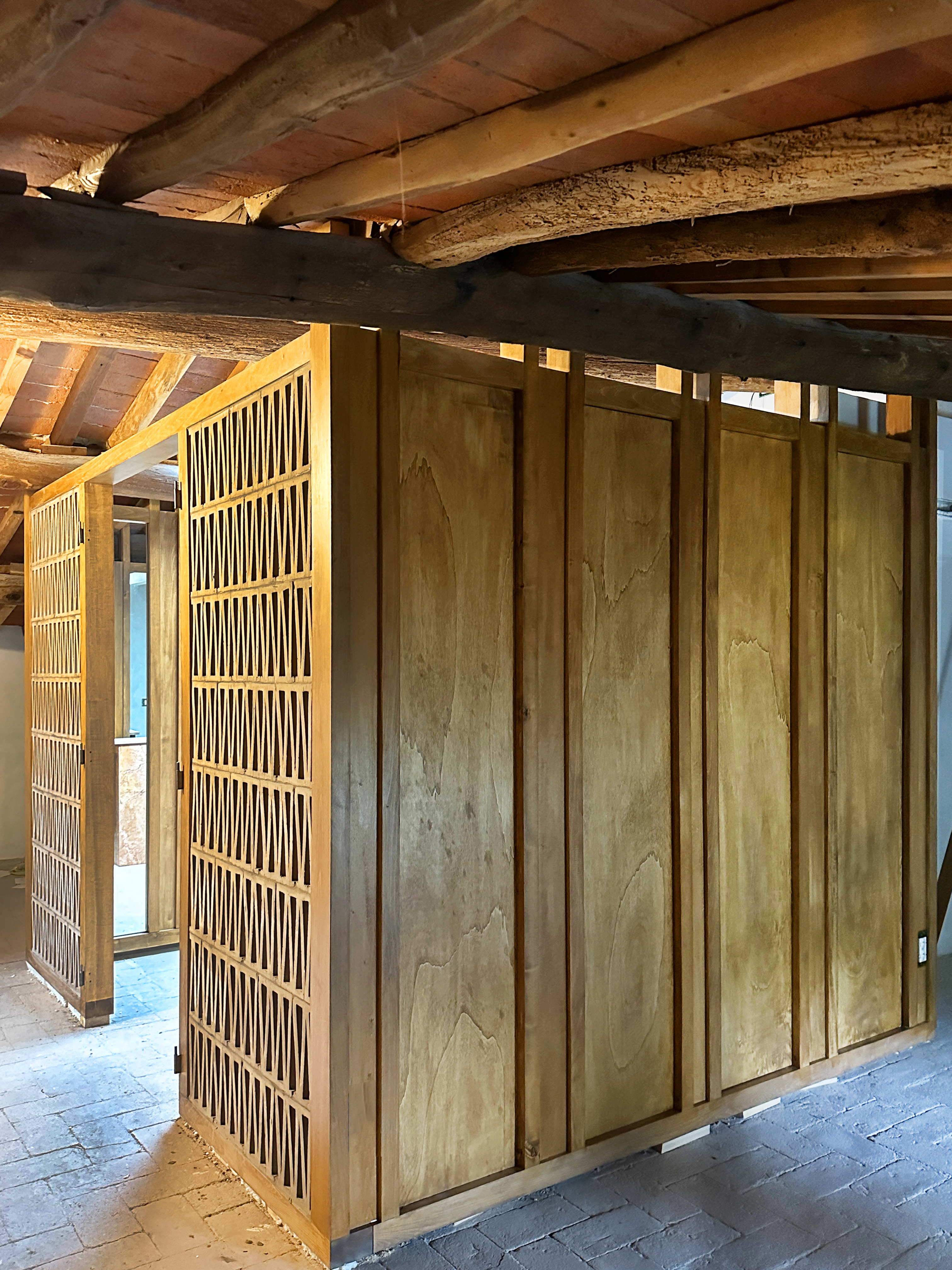 Cette phase de mise à niveau et restauration est suivie d'une intervention de restructuration et transformations de Custode afin de valoriser ces espaces intérieurs inexploités. Ce volet du projet vient ainsi révéler tout le caractère de cette portion de la propriété grâce à la restitution des oculus condamnés et de l'ouverture latérale ainsi que le percement de la toiture afin d'y intégrer une ouverture zénithale supplémentaire. En complément à ce travail d'enveloppe, l'intervention redéfinit la lecture des espaces intérieurs grâce à une réorganisation spatiale complète au profit de la fluidité des circulations entre les fonctions. Le niveau soffitto est quant à lui investi afin d'y concevoir des pièces atypiques ou est mis en évidence la charpente en bois de la toiture.