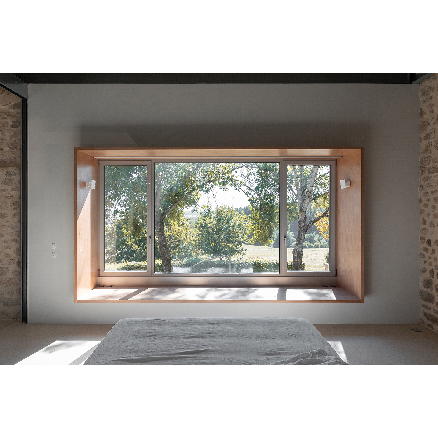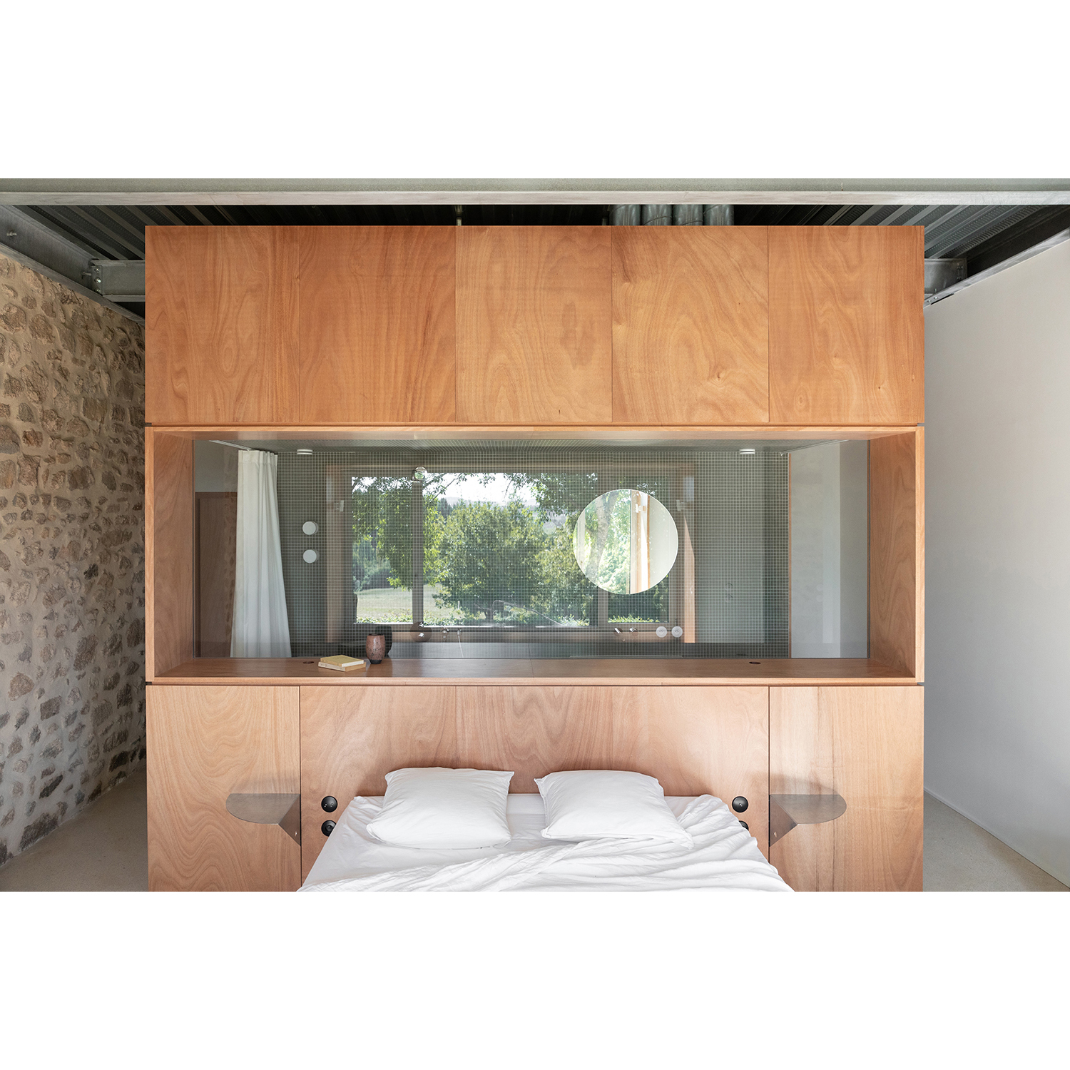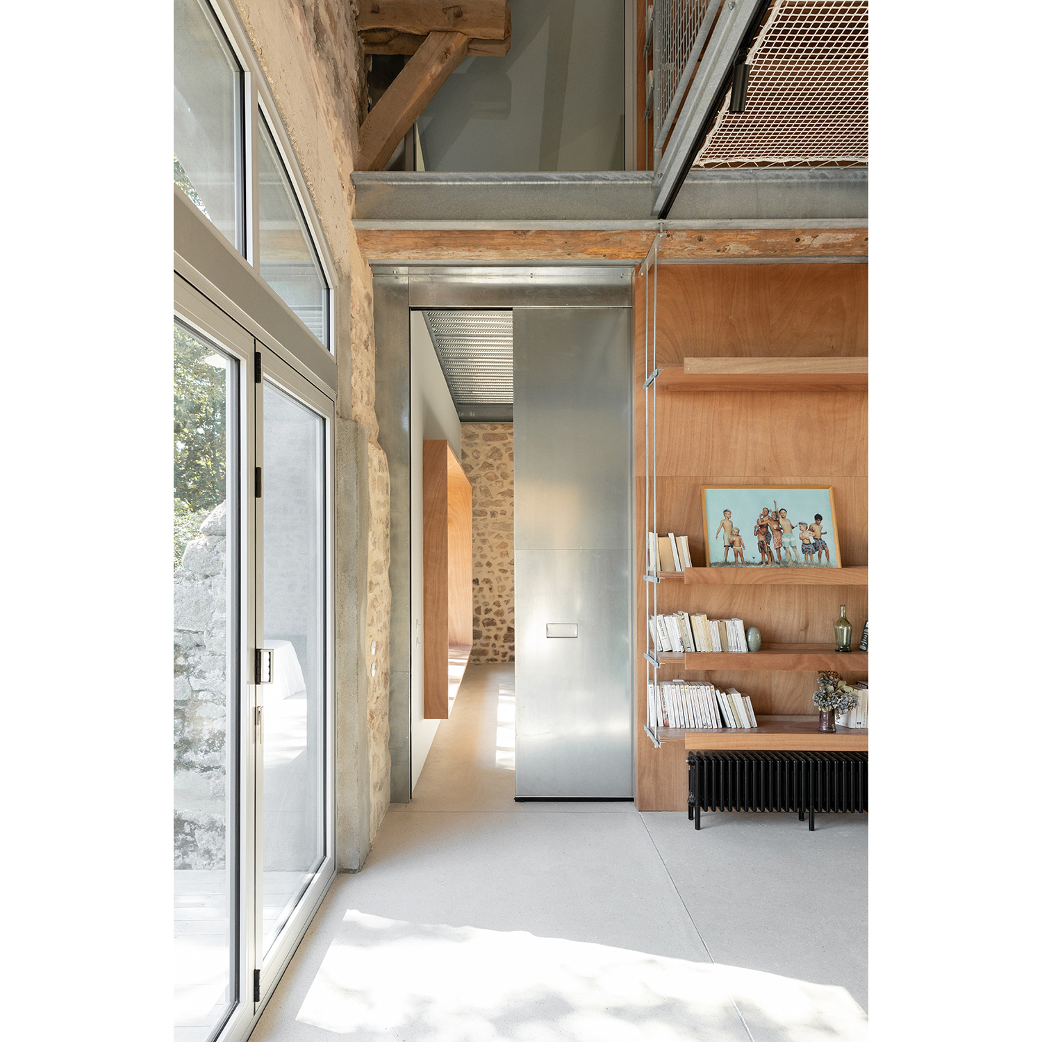 Les murs en pierre sont rénovés, et mis en valeur par l’usage de seulement deux matériaux, l’acier galvanisé et le contreplaqué. L’intervention se veut légère, afin de révéler le contraste entre sa contemporanéité et l’édifice rural.