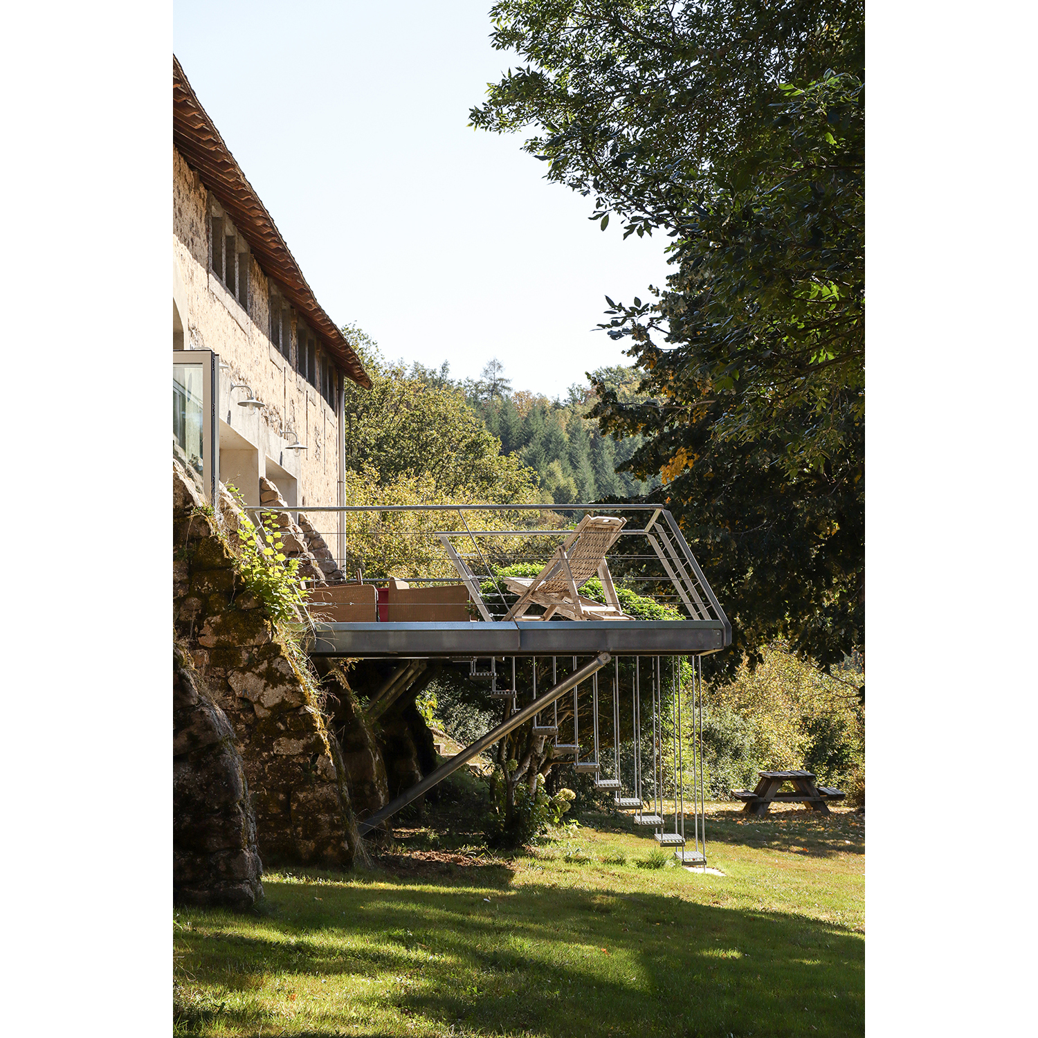 Le second volet de l’intervention consiste à ouvrir des baies de grandes dimensions, trouvant chacune leur spécificité technique : portes accordéons ouvrant sur une terrasse suspendue, boite de lecture dans la chambre, porte cochère en acier, etc. Qu’il s’agisse de la structure de la terrasse, des escaliers, tablettes de nuit ou étagères, le projet cherche à minimiser les points porteurs, exploitant les qualités structurelles du métal à travers des principes de tenségrité ou des assemblages mécaniques. La majorité des éléments sont préfabriqués en atelier, permettant une mise en œuvre rapide sur site tout en rendant lisible l’ensemble du dispositif constructif, son fonctionnement et ses composantes.