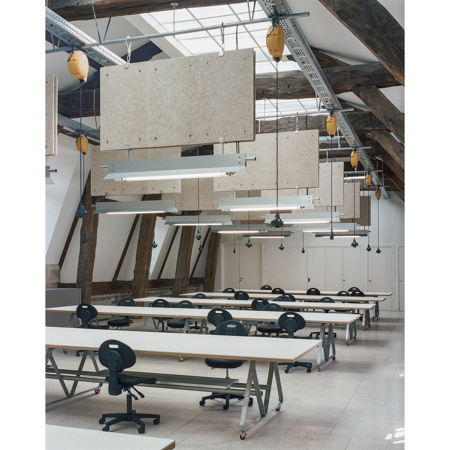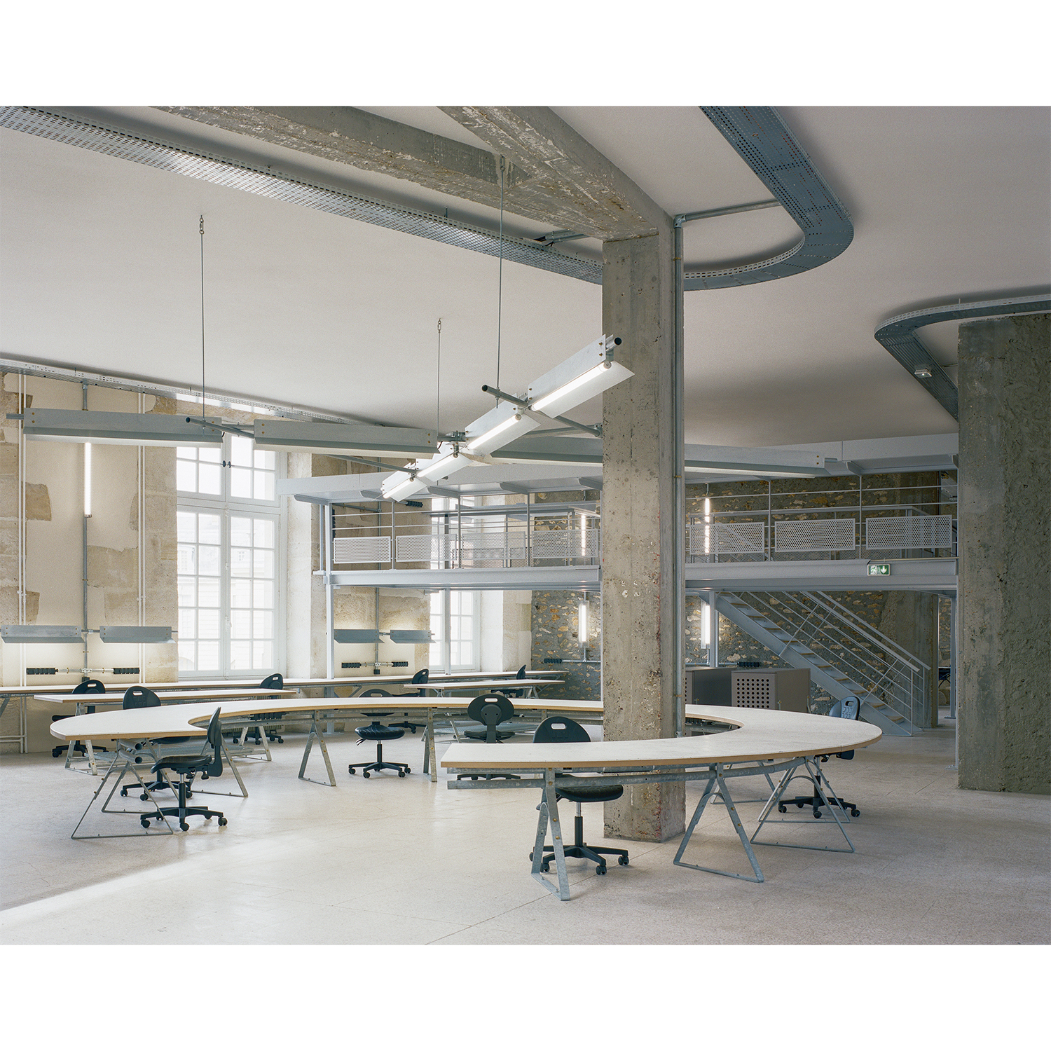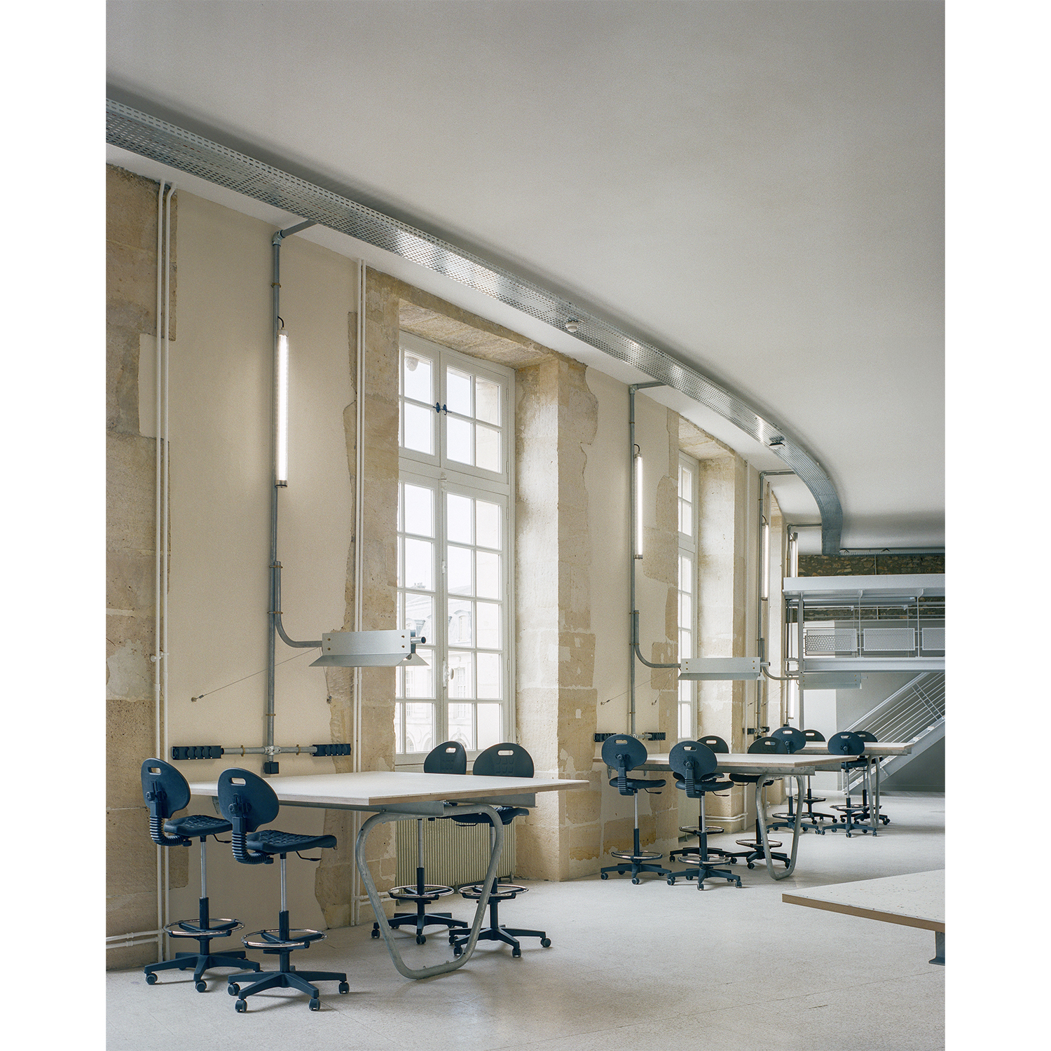 Face au Château de Versailles, dans les Petites Écuries du Roi, l’École Nationale Supérieure d’Architecture de Versailles accueille plus de 1200 étudiants. En raison de l’évolution de l’enseignement et de l’usure des lieux, l’administration a décidé de procéder à une rénovation complète d’une partie de l’école : ses ateliers de travail. Le site, classé et partiellement occupé, nécessitait une intervention rapide, ce qui a orienté la conception vers une approche synthétique. Pour répondre aux multiples enjeux, le projet a réorganisé l’ensemble des réseaux, en y intégrant luminaires et mobiliers, aussi bien fixes que