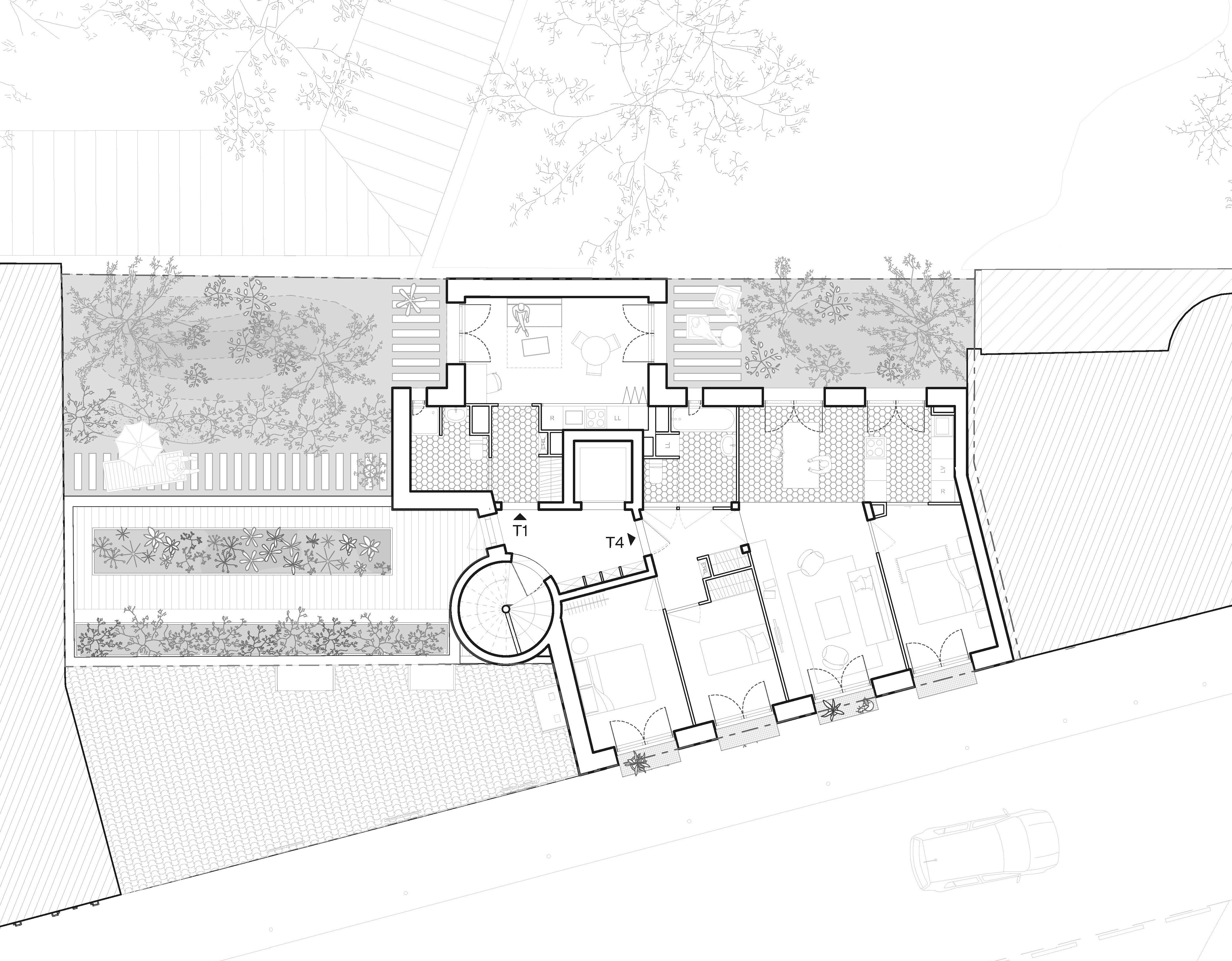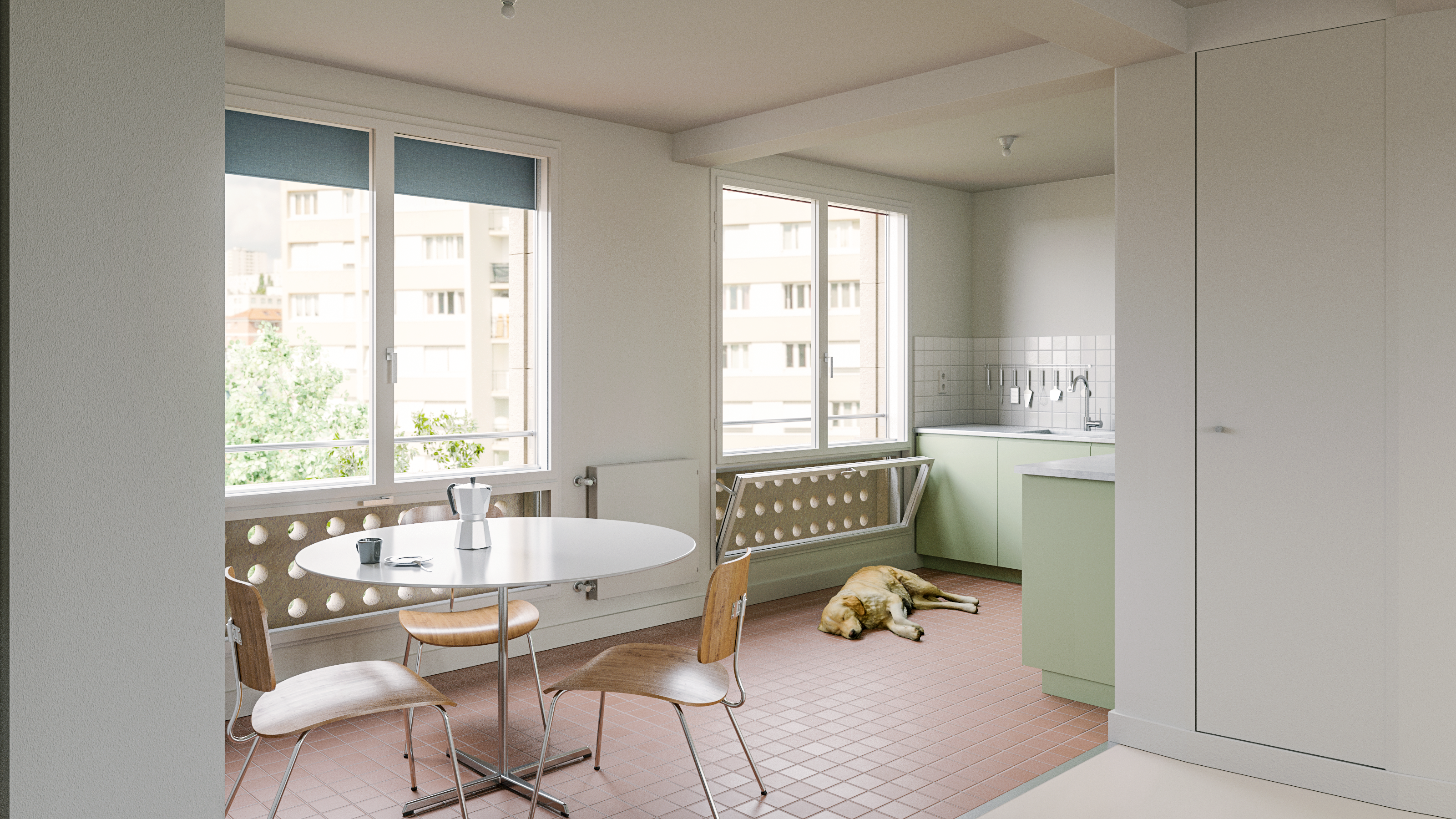 Située au 46 rue Beaunier, dans le 14ème arrondissement de Paris, le bâtiment est implanté de façon privilégier le recouvrement et la prolongation des masses bâties attenantes, et la recherche d’orientations multiples favorisant la circulation de l’air. Ainsi, la totalité des pièces du bâtiment est éclairée et ventilée naturellement, et offre en outre 80% de logements traversants, du T1 au T4. Le projet se décompose en plusieurs volumes programmatiques, avec d’une part 3 d’entre eux destinés aux pièces de vie des logements, et d’autre part 2 volumes regroupant les verticalités : l’escalier et le volume rassemblant toutes les pièces d’eau. L’assemblage que produit cette composition propose une lecture verticale et élancée, minimisant l’effet de masse, et offrant une respiration au sein de ce tissu urbain dense. Le choix d’élever le bâtiment, et ainsi d’habiller l’héberge voisine, constitue un parti pris fort du projet ; cette morphologie concentrant la densité en hauteur libère de larges zones de pleine terre en rez de chaussée. Ces surfaces accueillent des jardins de pluie qui participent au rafraîchissement naturel de l’air.