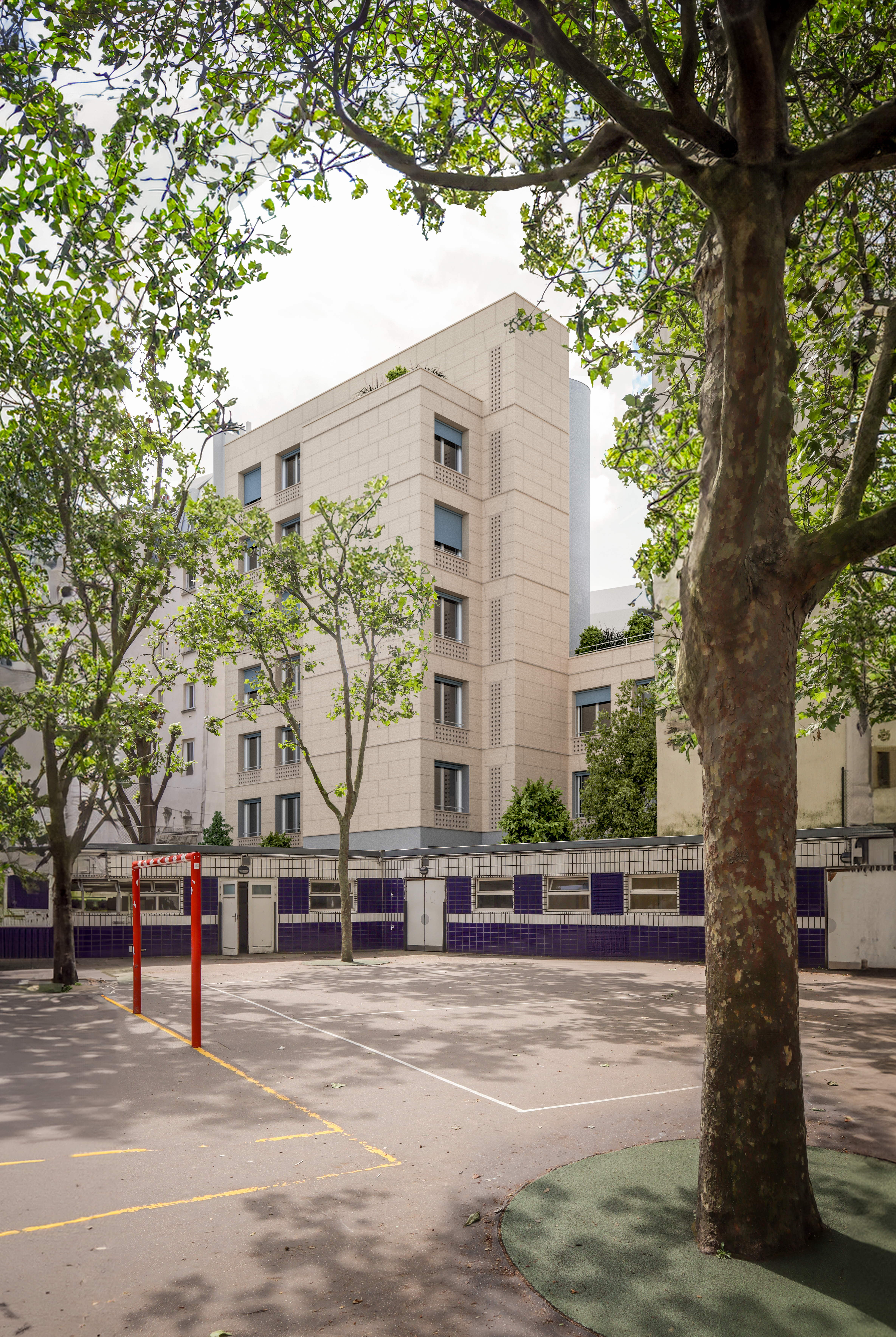 Récompensé par le prix de l’APEx (Architectures Parisiennes Exemplaires) de la Ville de Paris en février 2025, le bâtiment fait le lien avec les constructions anciennes en réinterprétant les systèmes constructifs traditionnels, notamment haussmanniens. Les façades en pierre de taille porteuse (25 et 35cm d’épaisseurs), extraite des carrières de Noyant, soutiennent des planchers en bois solivés, repris au cœur du bâtiment par une structure poteaux poutres en bois. Un système de moucharabieh en pierre de Beaulieu occupe partiellement les baies pour apporter de l’intimité, ainsi qu’une entrée d’air dédiée à la ventilation en partie basse pour un effet de tirage optimal. L’ensemble de ce dispositif, comme le bâtiment dans son entier, tire parti de l’inertie thermique de la pierre et de la simplicité de ses modes d’assemblage.