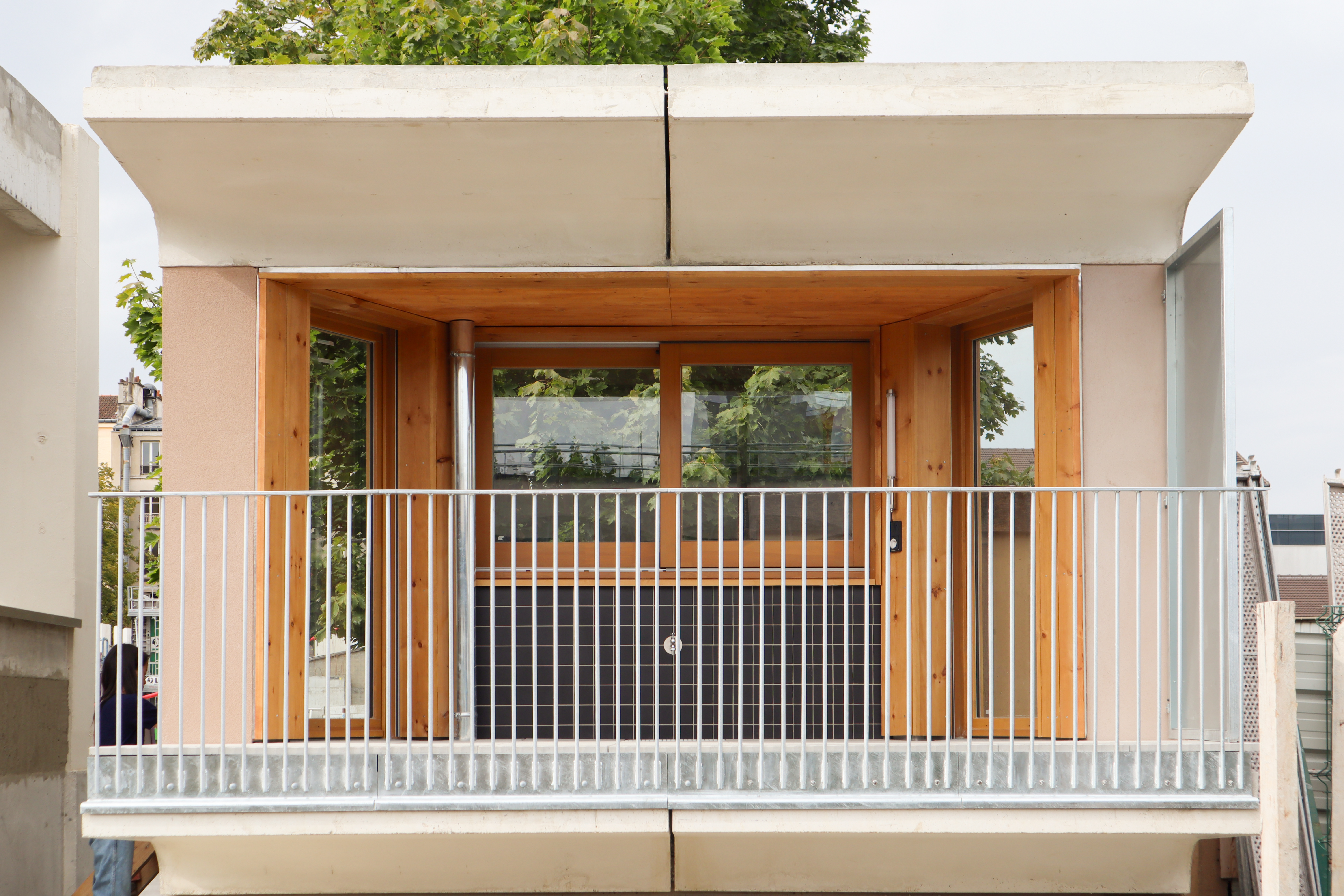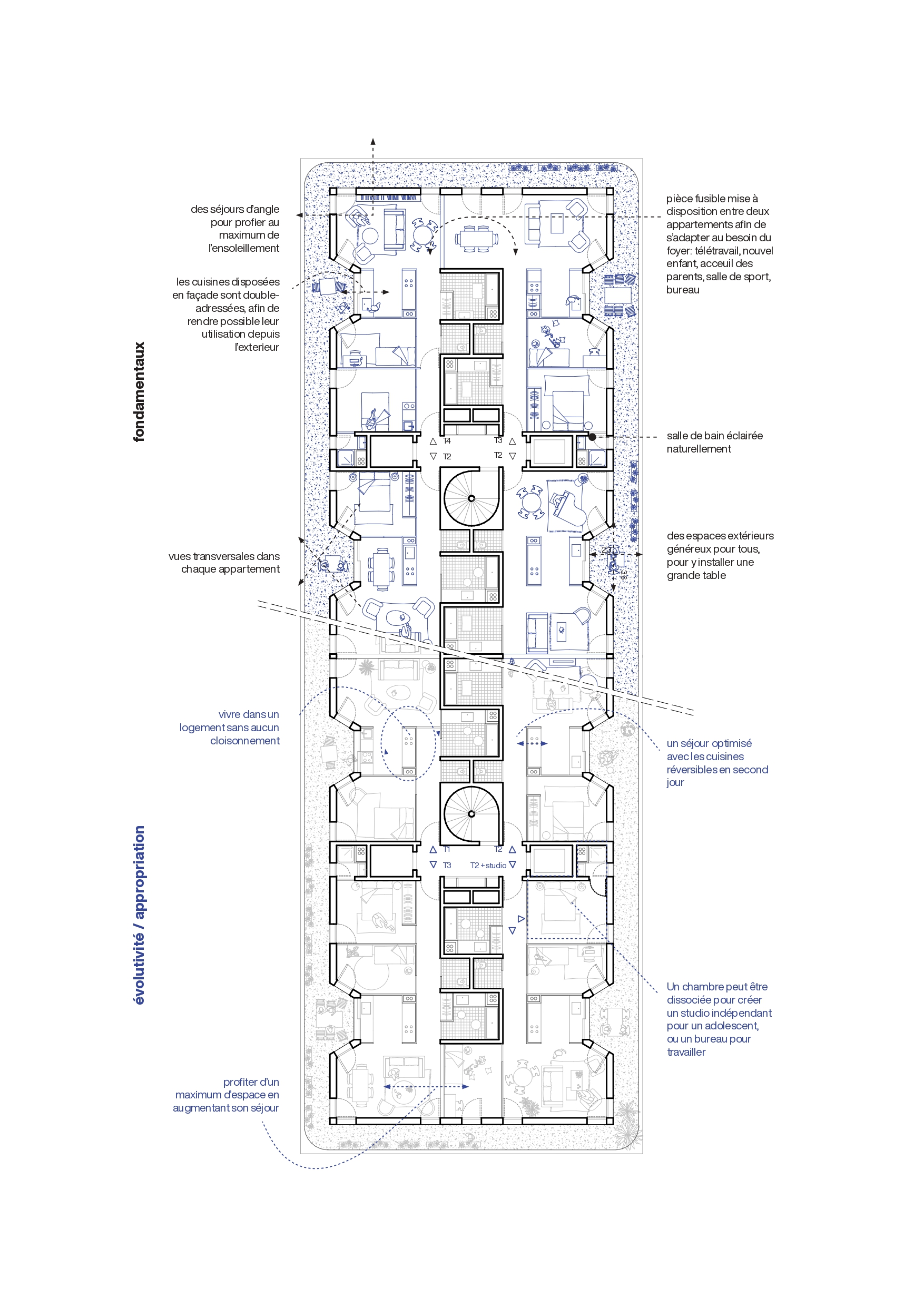 Les 73 logements s'organisent dans une morphologie en barre d'une épaisseur de 14 m, orientée est-ouest. Tous les logements y sont organisés autour d’une cuisine centrale en premier jour donnant sur un espace extérieur filant de grandes dimensions. Cet ensemble cuisine-loggia agit comme une rotule autour de laquelle s’organisent tous les espaces de l’appartement. Ces dispositions offrent aux usagers un rapport privilégié à l’extérieur permettant de cuisiner depuis son balcon. Les façades porteuses sont en brique monomur isolées, finie par un enduit à la chaux traditionnel et percées par des encadrements en bois. Le bâtiment est conçu en plan sur un système rationnel permettant de limiter l’usage du béton mais également de simplifier les passages de réseaux et les descentes de charges. Des systèmes de doubles portes ouvrant la cuisine sur les autres espaces amplifient le caractère central de celle-ci.