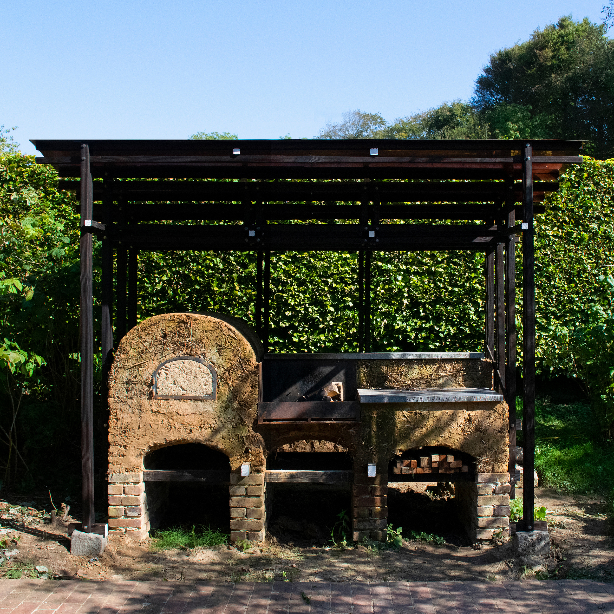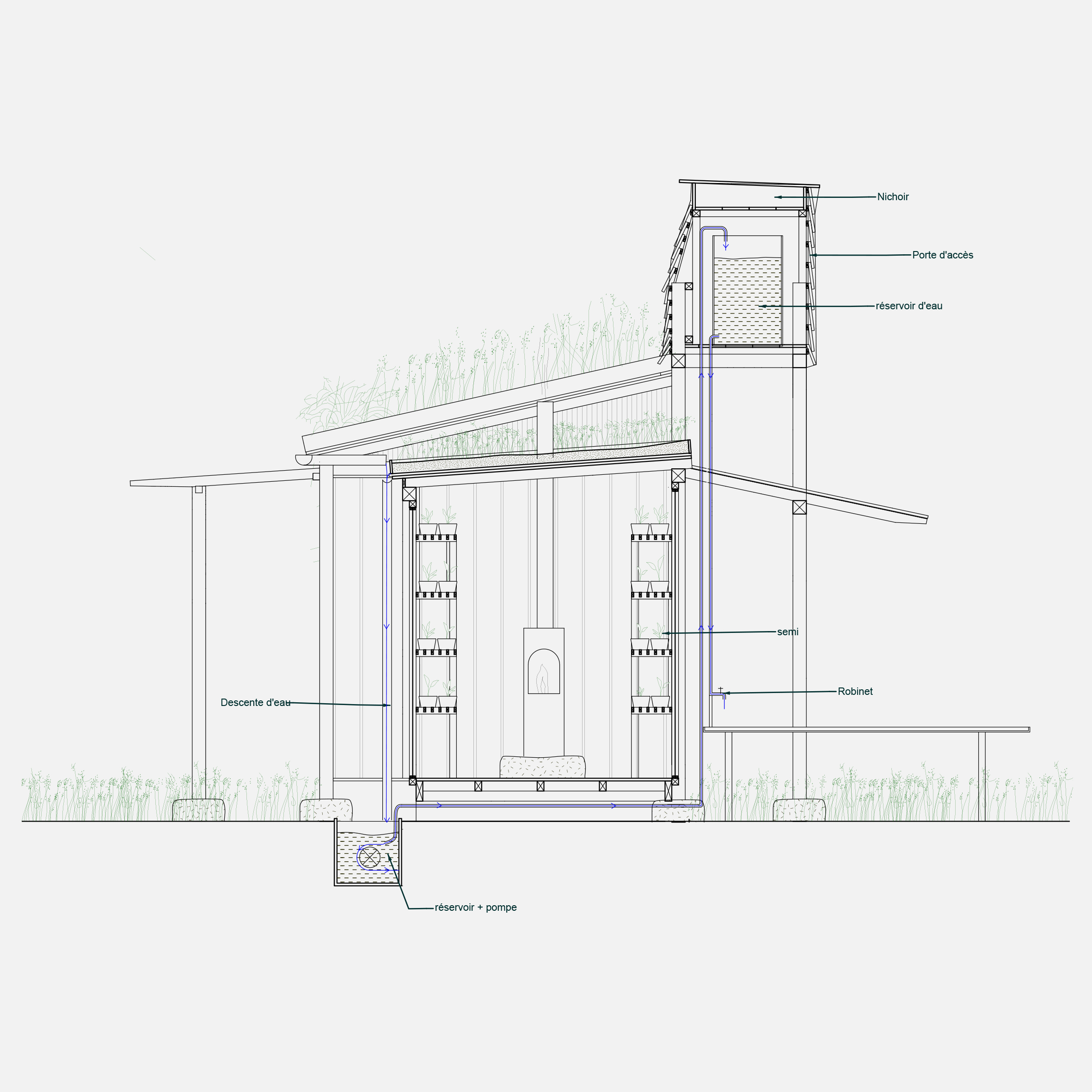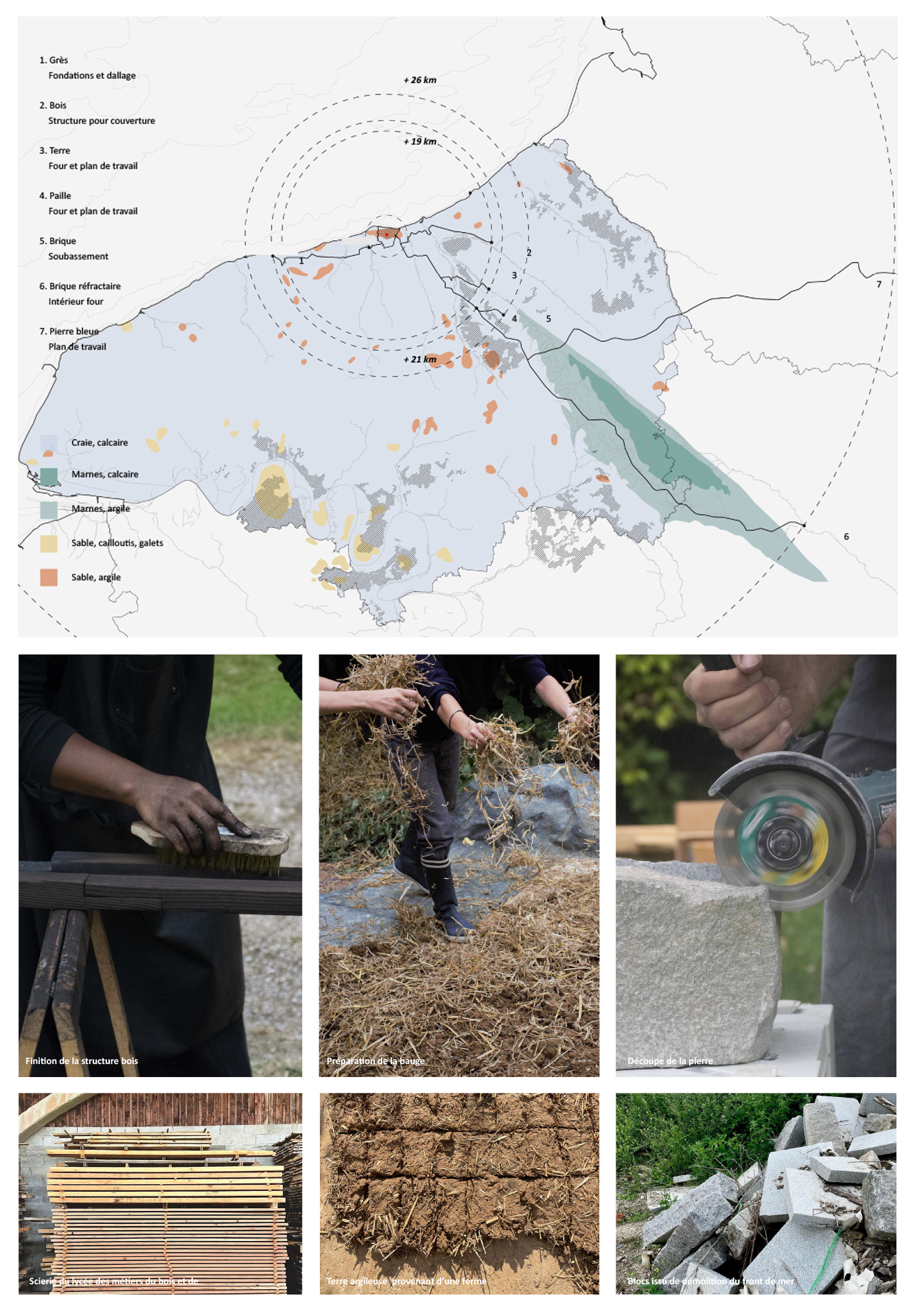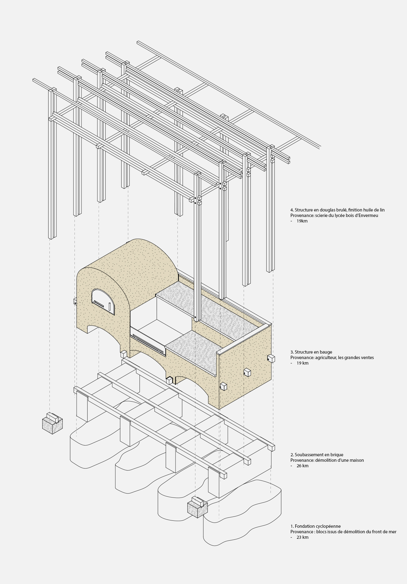 Situé dans un village d’horticulteurs, près du Bois des Moutiers, le projet oscille entre un dispositif de permaculture et un aménagement paysager avec la construction d’une cuisine d’été. Lieu de stockage et de production, le pavillon s’adapte aux saisons : l’utilisation d’un poêle de masse permet de chauffer l’espace pendant l’hiver afin de s’assurer que les boutures ne gèlent pas, et est supplée par une toiture végétalisée qui renforce l’isolation thermique. Souvent exposé aux intempéries et aux périodes de sécheresse, le projet intègre un système de récupération des eaux de pluie, telle une citerne en toiture qui recycle l’eau pour alimenter continuellement les graines en culture, et plus largement, le jardin. Si le complexe de la toiture devient un dispositif architectural au service d’un écosystème, la structure en douglas et goudron de pin, est aussi un élément qui interagit avec l’environnement, en protégeant naturellement le bois du froid et de l’humidité du site, tout intégrant le bâtiment à son ensemble paysager, semi-forestier. A côté, la cuisine en bauge offre un espace minimum extérieur protégé à l’échelle de l’abri de jardin. Dans une approche éco-responsable, la cuisine d’été est construite dans une forme d’économie de proximité : les fondations en béton cyclopéen extraits de bâtiments démolis, les arches conçues en bauge, la structure en bois brûlé, et le soubassement en brique issue du démontage d’une ancienne maison, dessinent un cercle de 26 km d’approvisionnement des matériaux autour du site du projet. Implanté localement, le projet suit également une démarche participative et associative, guidée par un maçon spécialisé en terre crue, dont la formation d’archéologue permet une attention particulière aux sciences des sols et à leur exploitation. L’expertise technique se mêle ainsi à la géologie du lieu, où il s’agit d’intégrer les données naturelles du territoire pour les façonner avec savoir-faire.