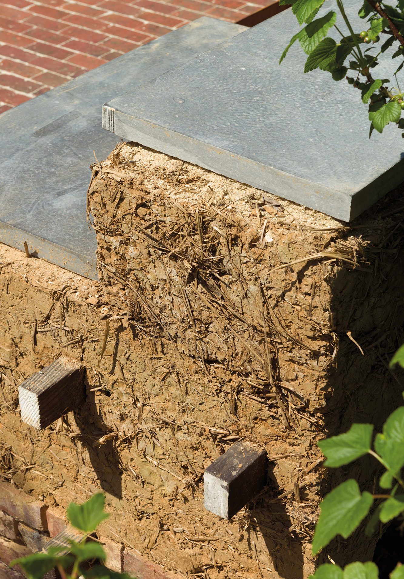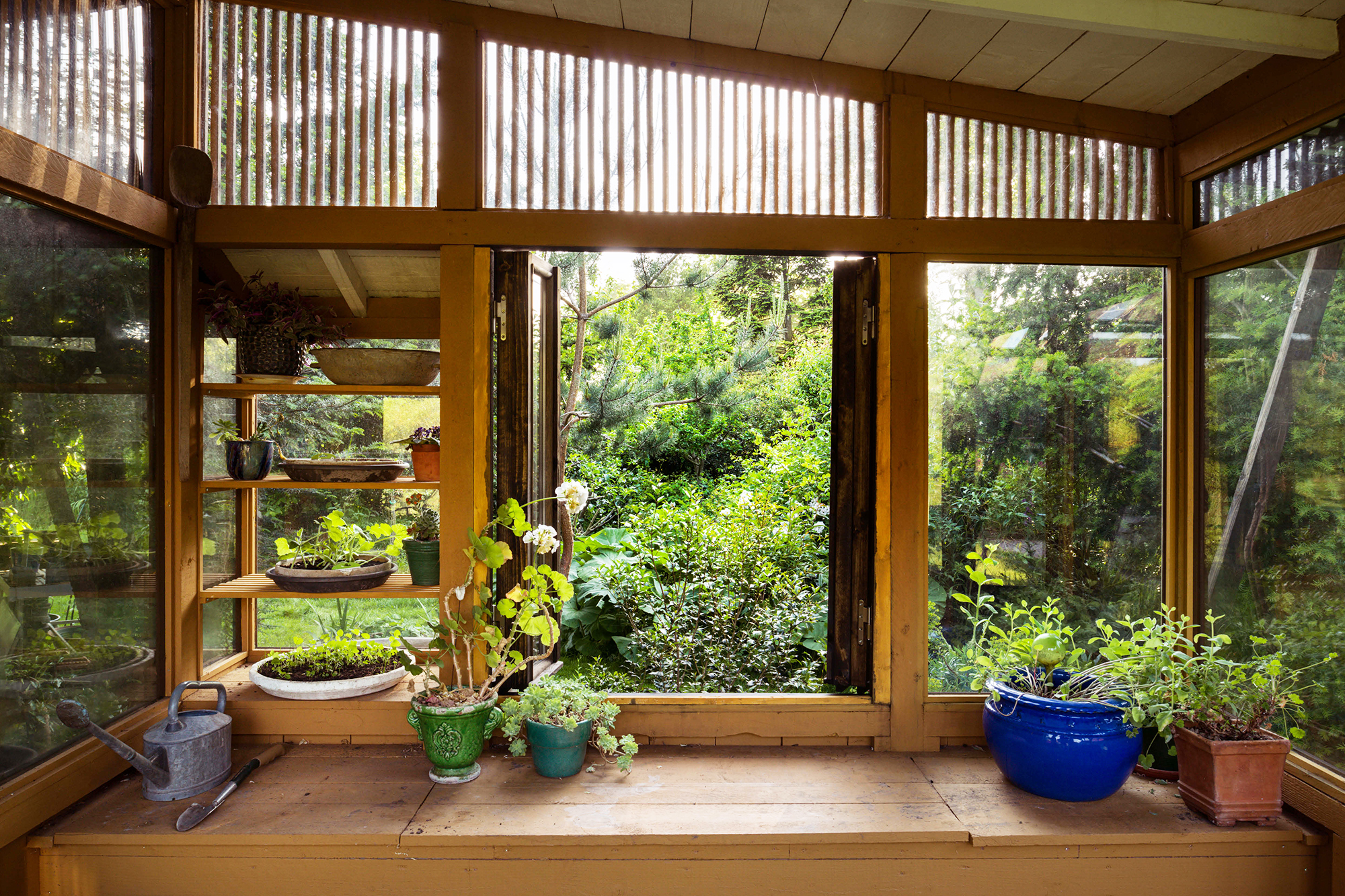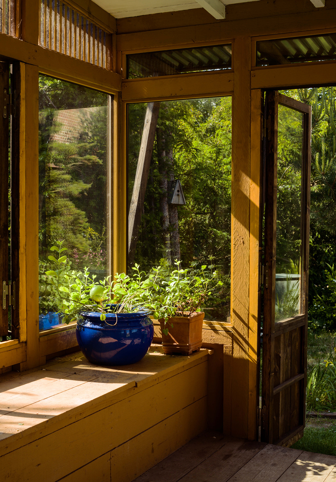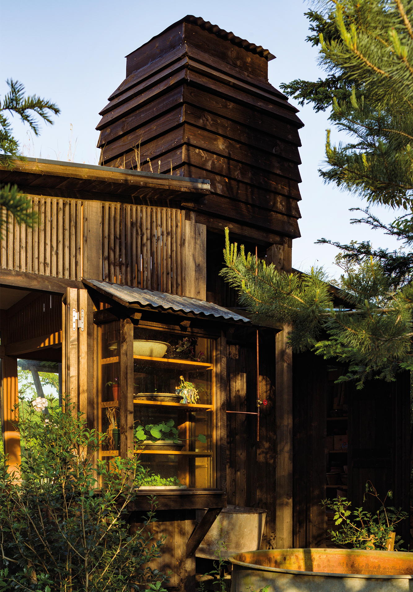 Situé dans un village d’horticulteurs, près du Bois des Moutiers, le projet oscille entre un dispositif de permaculture et un aménagement paysager avec la construction d’une cuisine d’été. Lieu de stockage et de production, le pavillon s’adapte aux saisons : l’utilisation d’un poêle de masse permet de chauffer l’espace pendant l’hiver afin de s’assurer que les boutures ne gèlent pas, et est supplée par une toiture végétalisée qui renforce l’isolation thermique. Souvent exposé aux intempéries et aux périodes de sécheresse, le projet intègre un système de récupération des eaux de pluie, telle une citerne en toiture qui recycle l’eau pour alimenter continuellement les graines en culture, et plus largement, le jardin. Si le complexe de la toiture devient un dispositif architectural au service d’un écosystème, la structure en douglas et goudron de pin, est aussi un élément qui interagit avec l’environnement, en protégeant naturellement le bois du froid et de l’humidité du site, tout intégrant le bâtiment à son ensemble paysager, semi-forestier. A côté, la cuisine en bauge offre un espace minimum extérieur protégé à l’échelle de l’abri de jardin. Dans une approche éco-responsable, la cuisine d’été est construite dans une forme d’économie de proximité : les fondations en béton cyclopéen extraits de bâtiments démolis, les arches conçues en bauge, la structure en bois brûlé, et le soubassement en brique issue du démontage d’une ancienne maison, dessinent un cercle de 26 km d’approvisionnement des matériaux autour du site du projet. Implanté localement, le projet suit également une démarche participative et associative, guidée par un maçon spécialisé en terre crue, dont la formation d’archéologue permet une attention particulière aux sciences des sols et à leur exploitation. L’expertise technique se mêle ainsi à la géologie du lieu, où il s’agit d’intégrer les données naturelles du territoire pour les façonner avec savoir-faire.