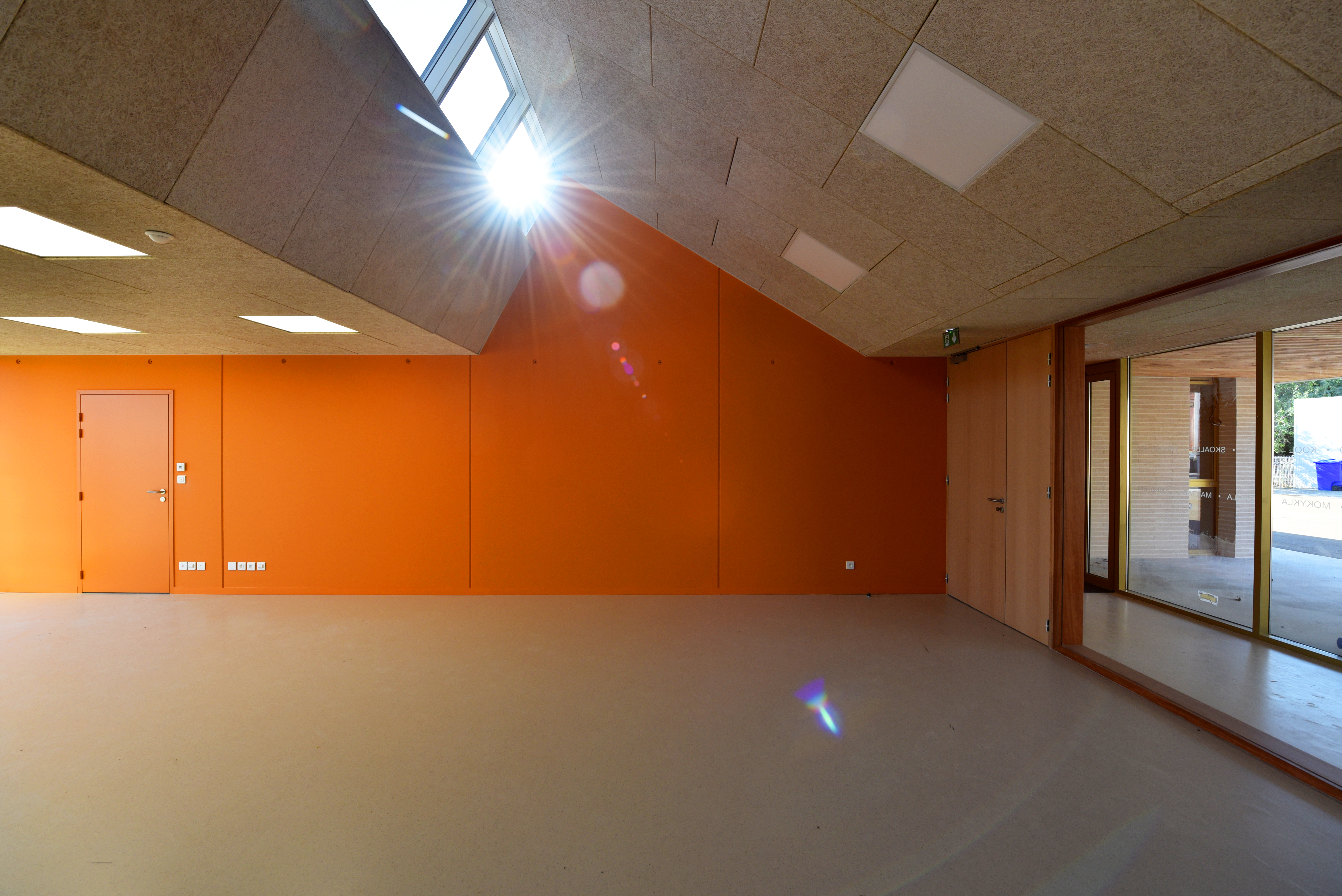 Le nouvel équipement a été conçu à énergie positive, et intègre pour cela en toiture des panneaux photovoltaïques (autoconsommation d’électricité), des ouvertures stratégiquement position- nées, ainsi qu’une isolation renforcée.