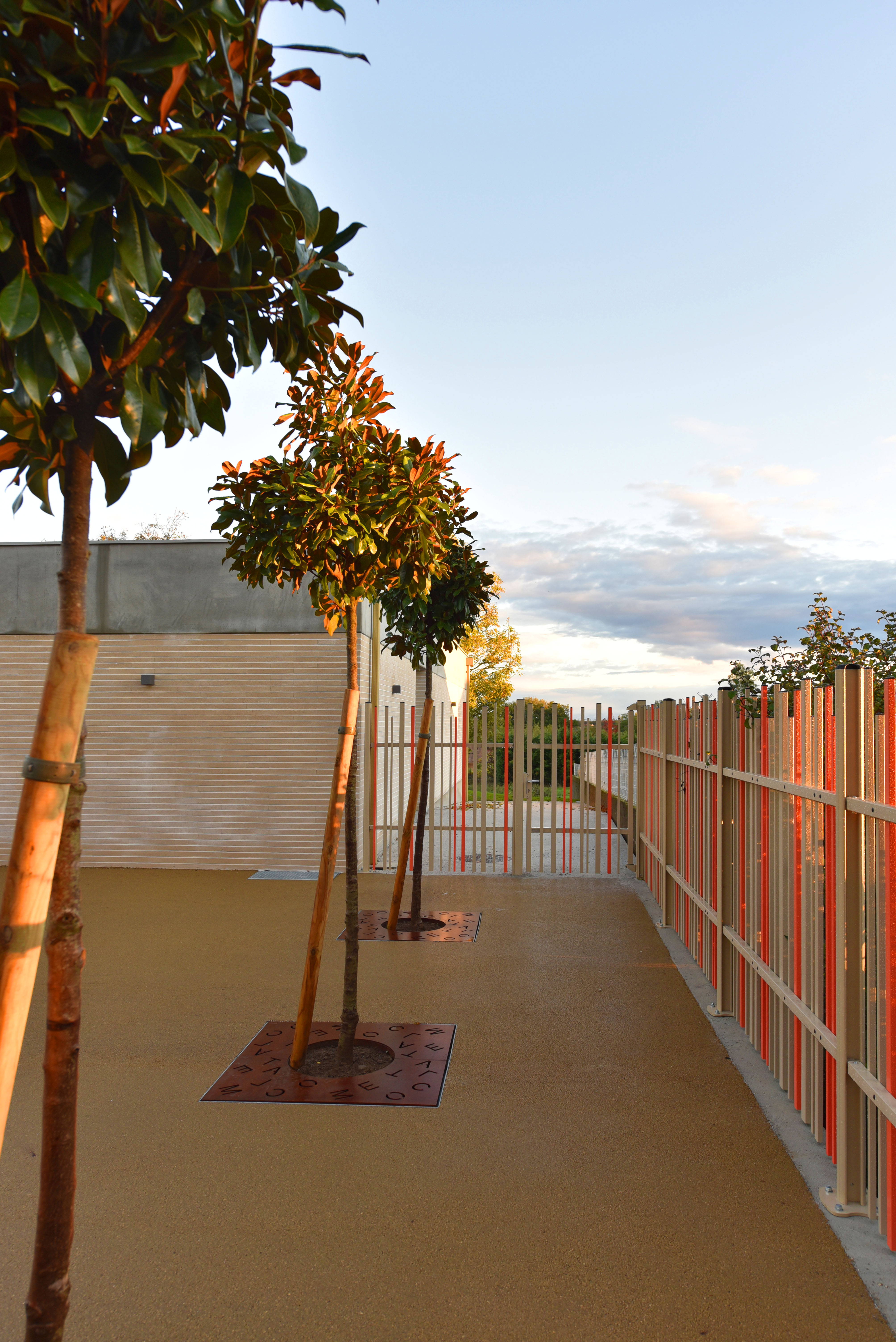 Nous avons retenu l’idée de réaliser une frontalité affirmée par ce jeu de volumes pleins en béton architectonique en façade principale, mais avons souhaité conserver des percées visuelles et des transparences transversalesNord-Sudafindevaloriserles espaces attenant à la parcelle : près, clocher Eglise, parvis mairie..., et les faire dialoguer entre eux.
