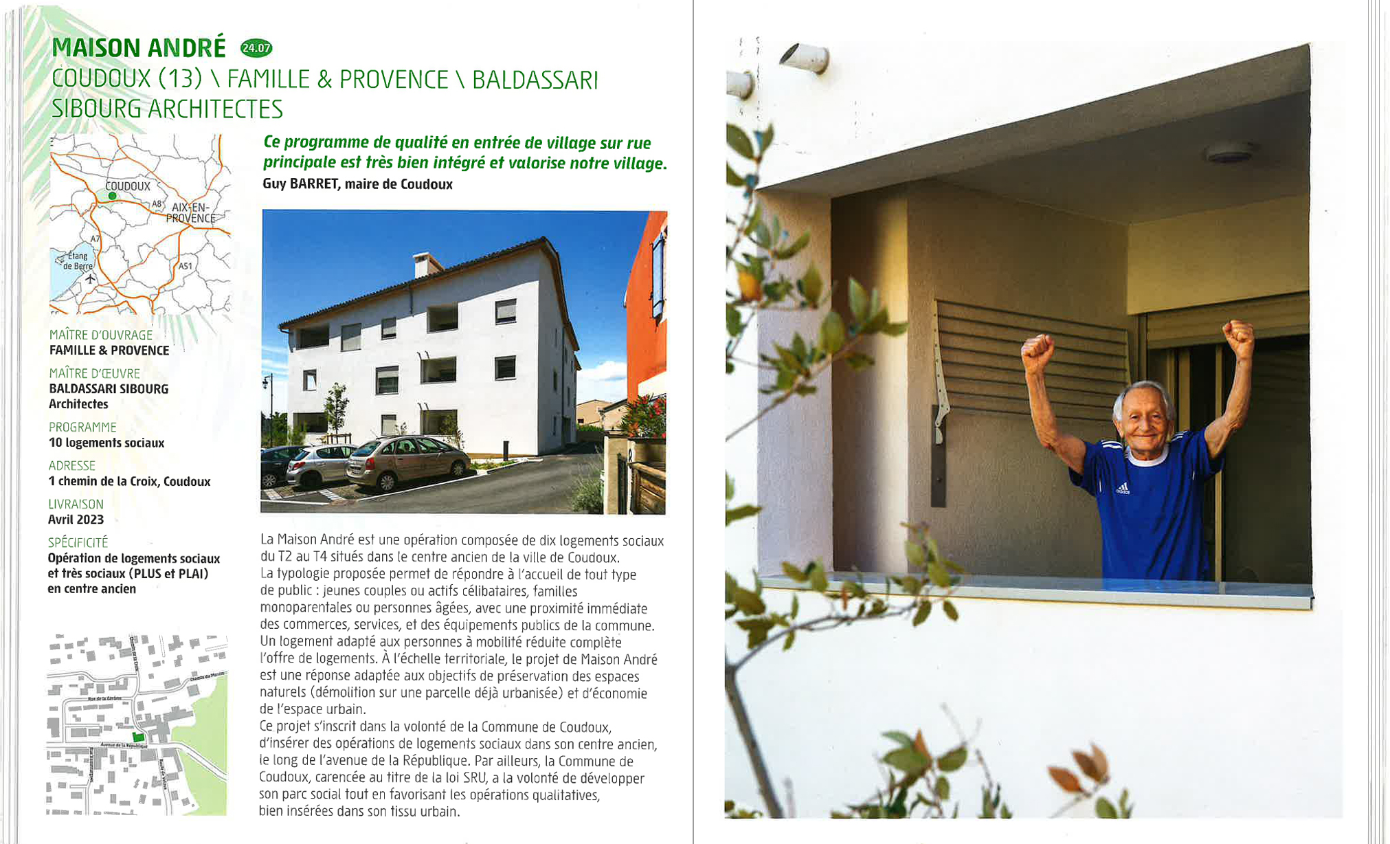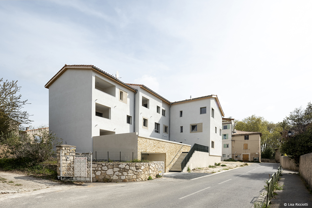 Le projet s’inscrit dans le tissu villageois du centre ancien de Coudoux, sur un terrain présentant une forte déclivité. Il prévoit démolition d'une maison individuelle pour la construction d’un petit immeuble collectif en R+2 de 10 logements locatifs sociaux.