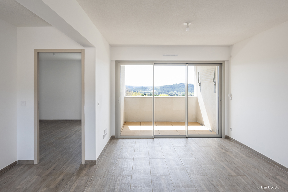 Les logements sont traversants ou bi orientés et bénéficient tous d'épaisses loggia pour vivre dehors, façe au paysage.