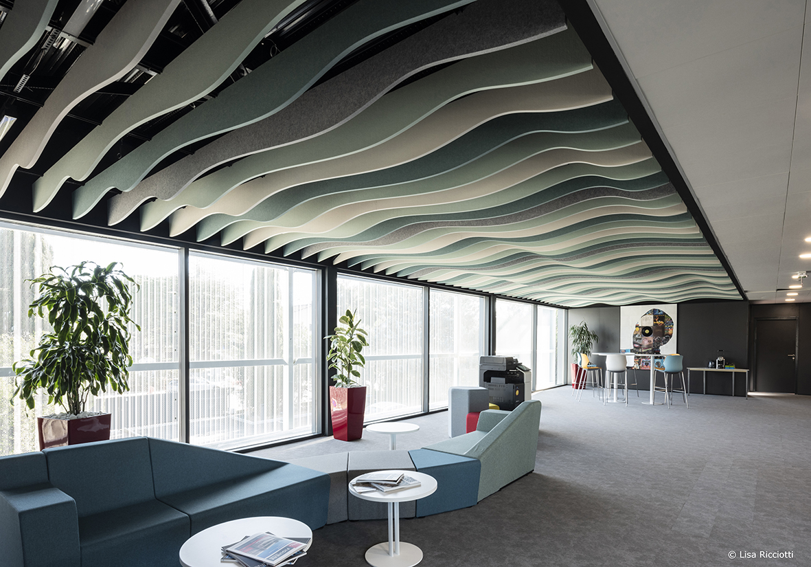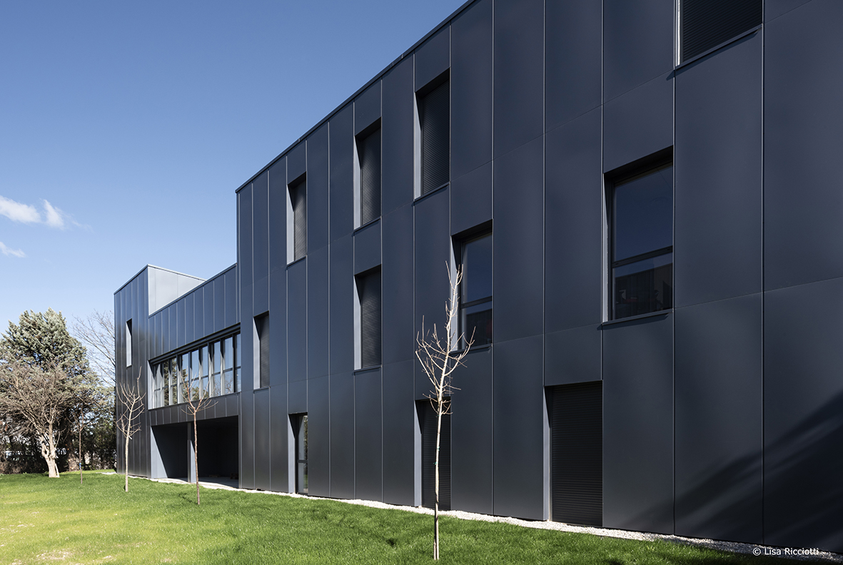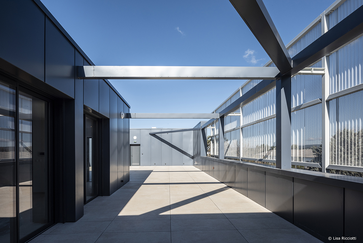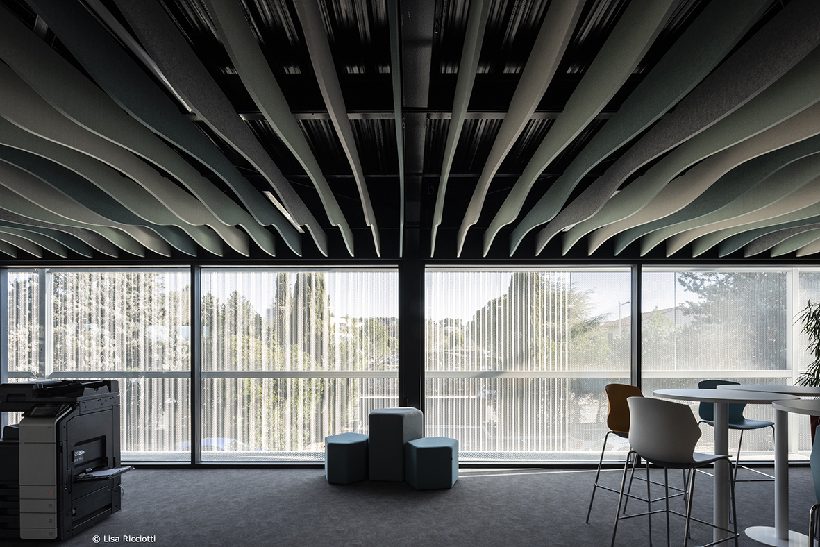 En façade, le projet exprime avec force le savoir-faire de l’entreprise. Le bardage joue d’un subtil jeu d’écrans entre intérieur et extérieur, entre planéité et profondeur. Selon les heures et les saisons, la façade devient surface mouvante, presque cinématographique. À l’intérieur, ce voile transforme la perception, créant un univers propice au rêve et à la liberté.