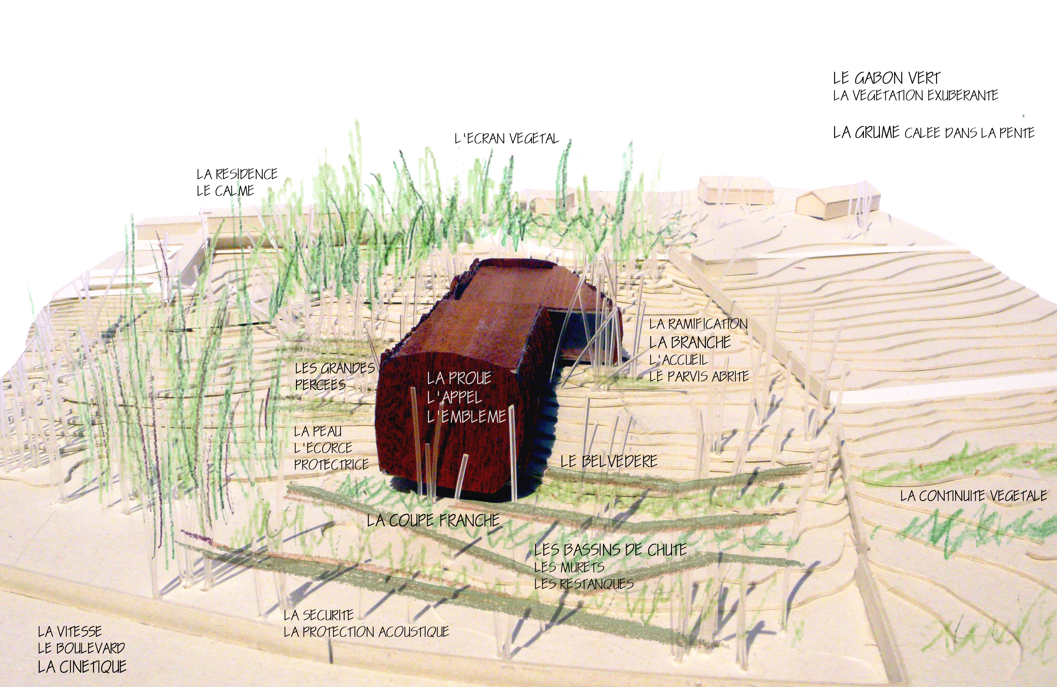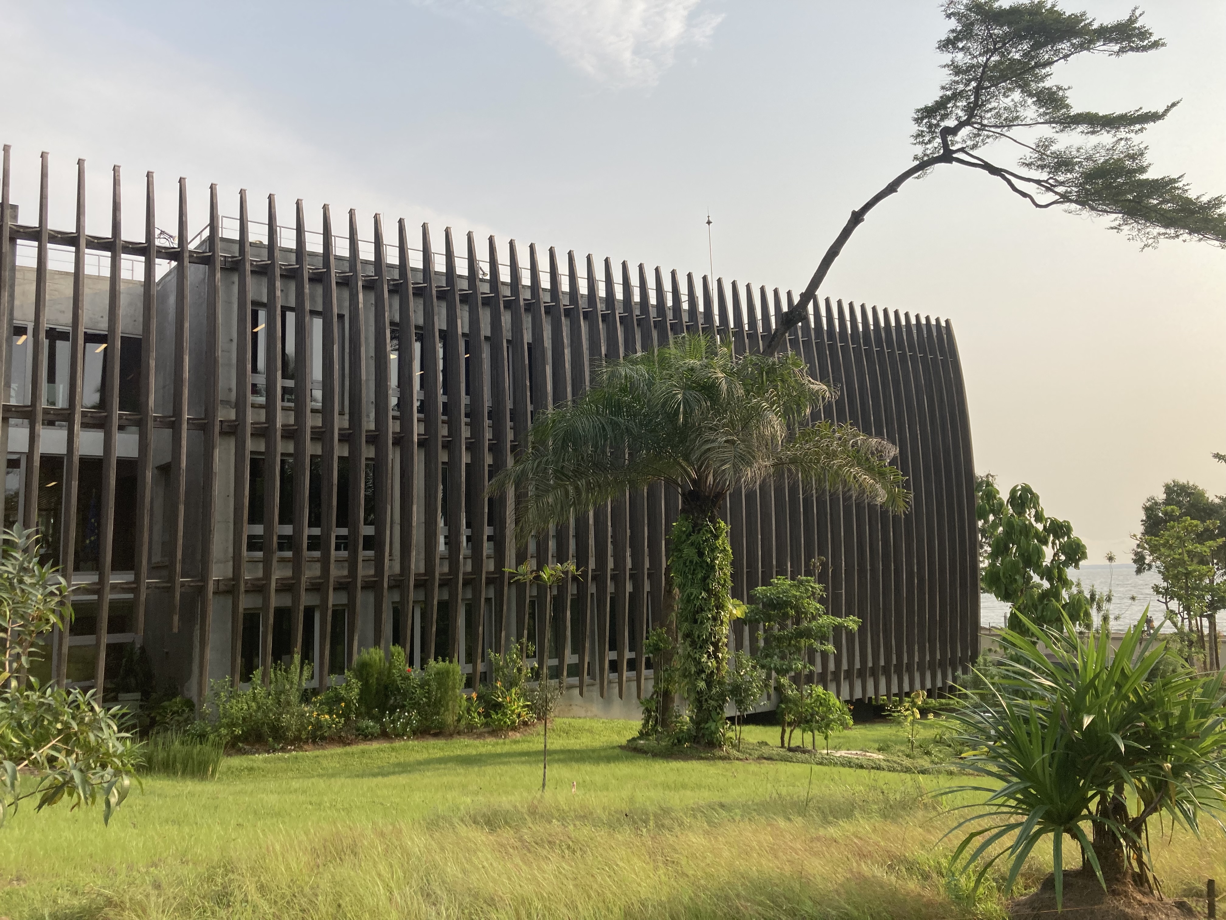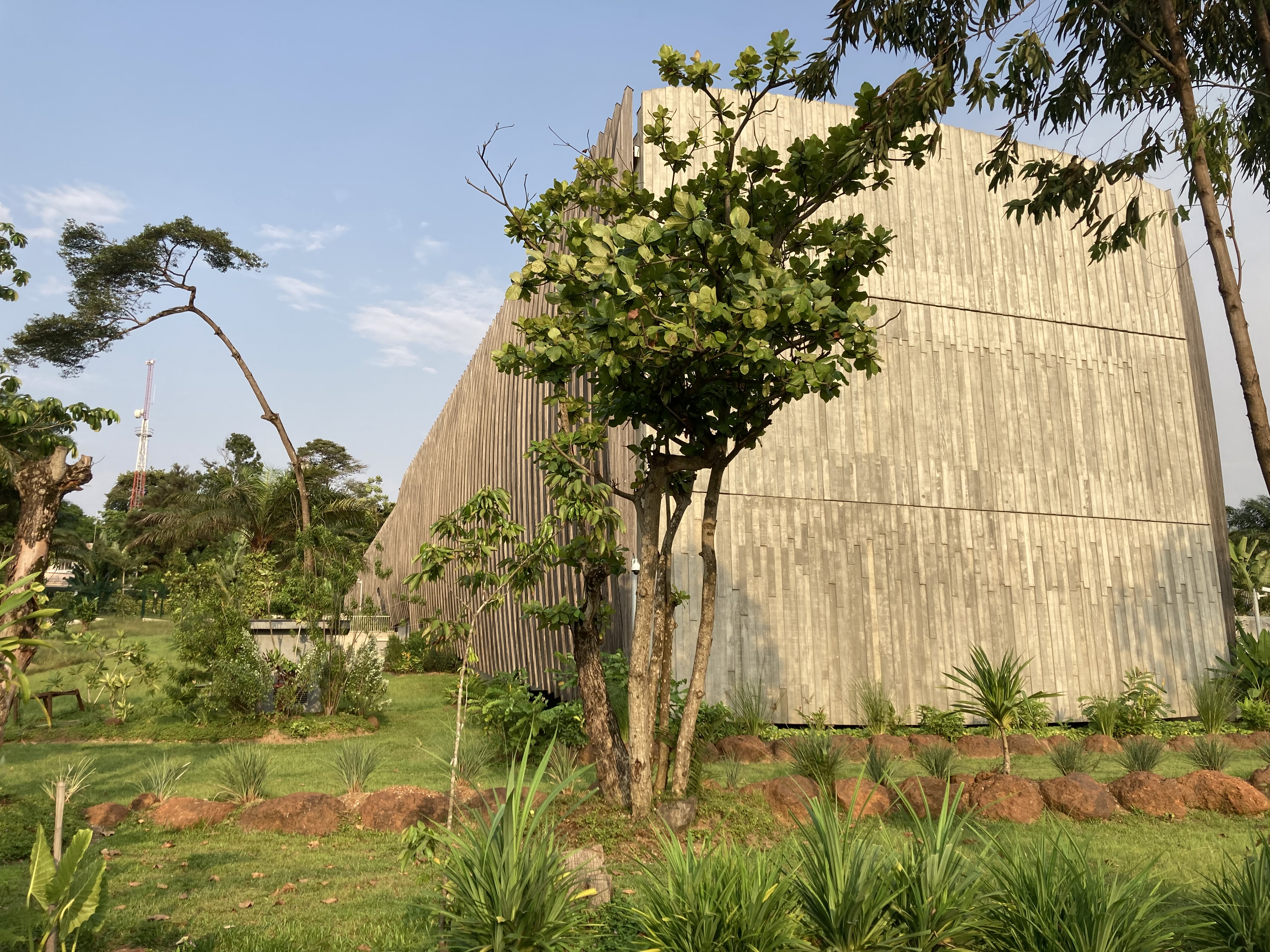 Une image sculpturale, suggestive comme peut l’être l’art africain, et appropriable par les deux cultures, gabonaise et française. Une image d’arbre abattu et couché dans la pente du sol, de grume dont l’ébranchage aurait juste laissé une ramification. Une image qui se construit pourtant en béton, pour répondre aux exigences sécuritaires comme aux contraintes climatiques, pour s’adapter aussi aux réalités constructives du pays, mais qui trouve son allégorie dans une peau de bois enveloppant ses flancs. Dans une écorce ciselée et ventrue, plus sophistiquée que brute, valorisant l’élégance organique d’un design industriel, calculant avec précision sa courbe oblongue.
