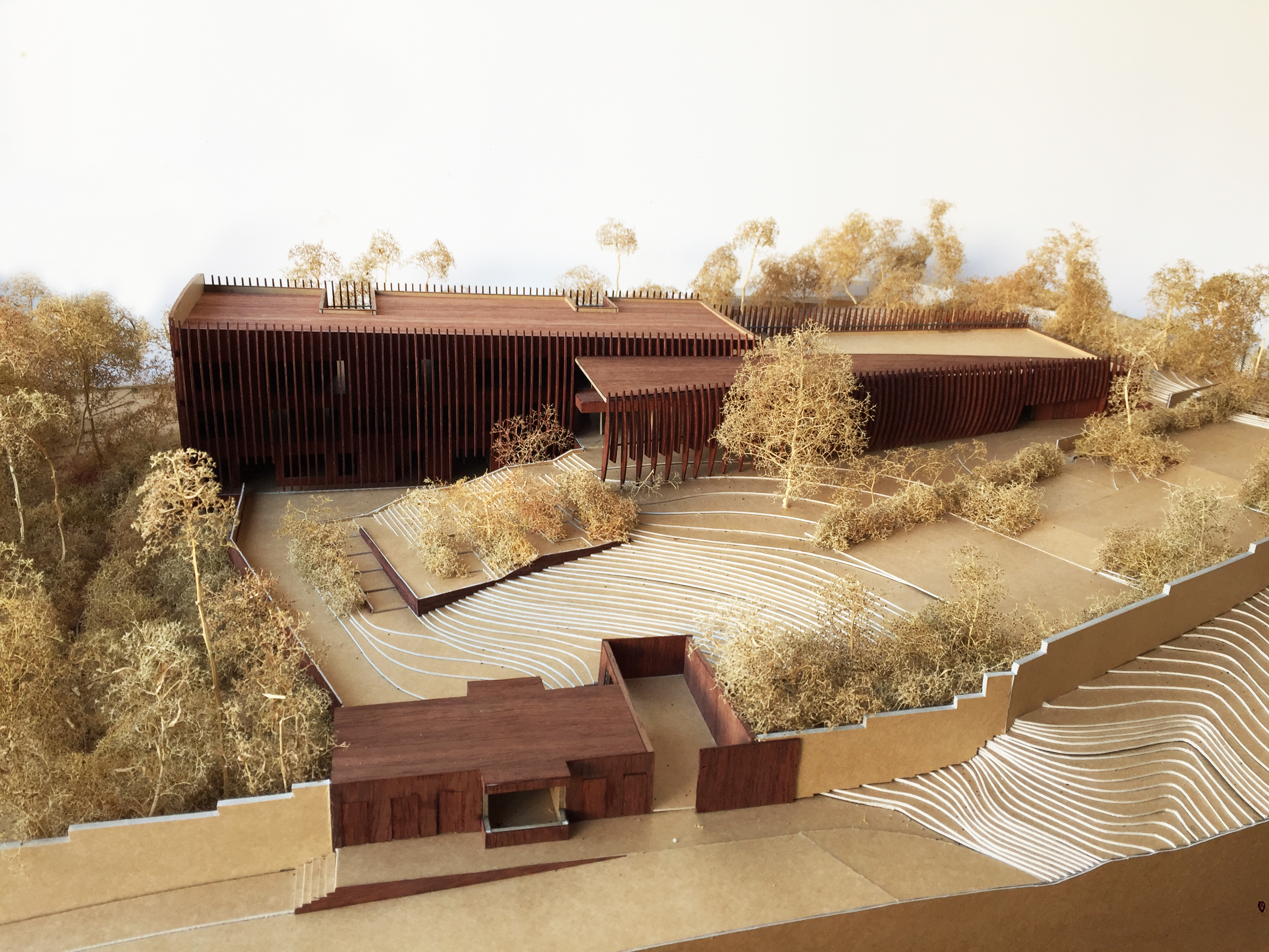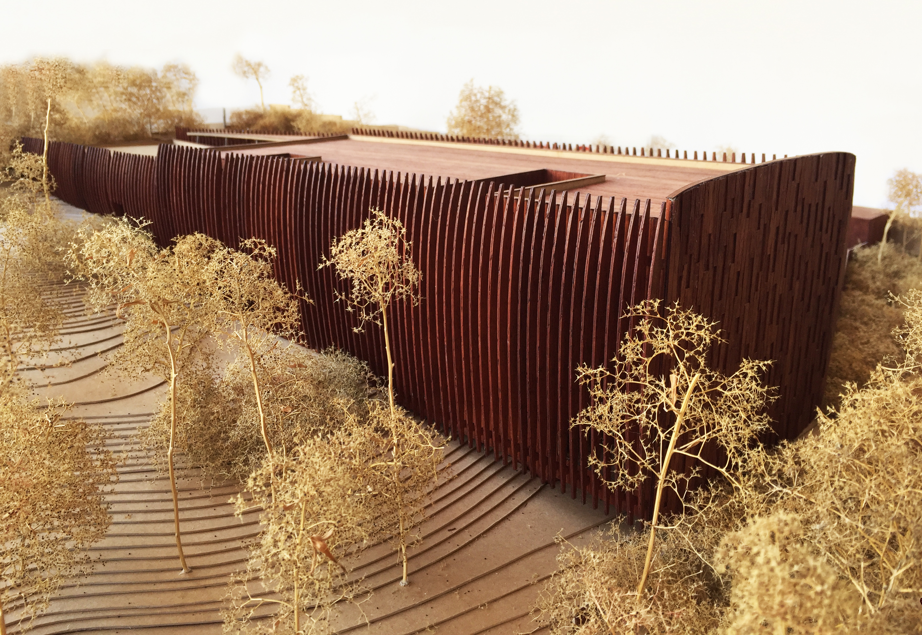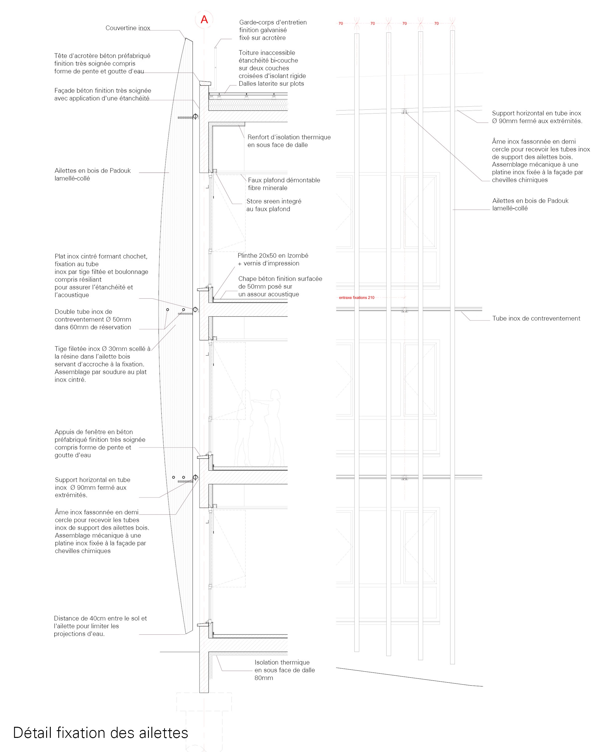 Une image sculpturale, suggestive comme peut l’être l’art africain, et appropriable par les deux cultures, gabonaise et française. Une image d’arbre abattu et couché dans la pente du sol, de grume dont l’ébranchage aurait juste laissé une ramification. Une image qui se construit pourtant en béton, pour répondre aux exigences sécuritaires comme aux contraintes climatiques, pour s’adapter aussi aux réalités constructives du pays, mais qui trouve son allégorie dans une peau de bois enveloppant ses flancs. Dans une écorce ciselée et ventrue, plus sophistiquée que brute, valorisant l’élégance organique d’un design industriel, calculant avec précision sa courbe oblongue.