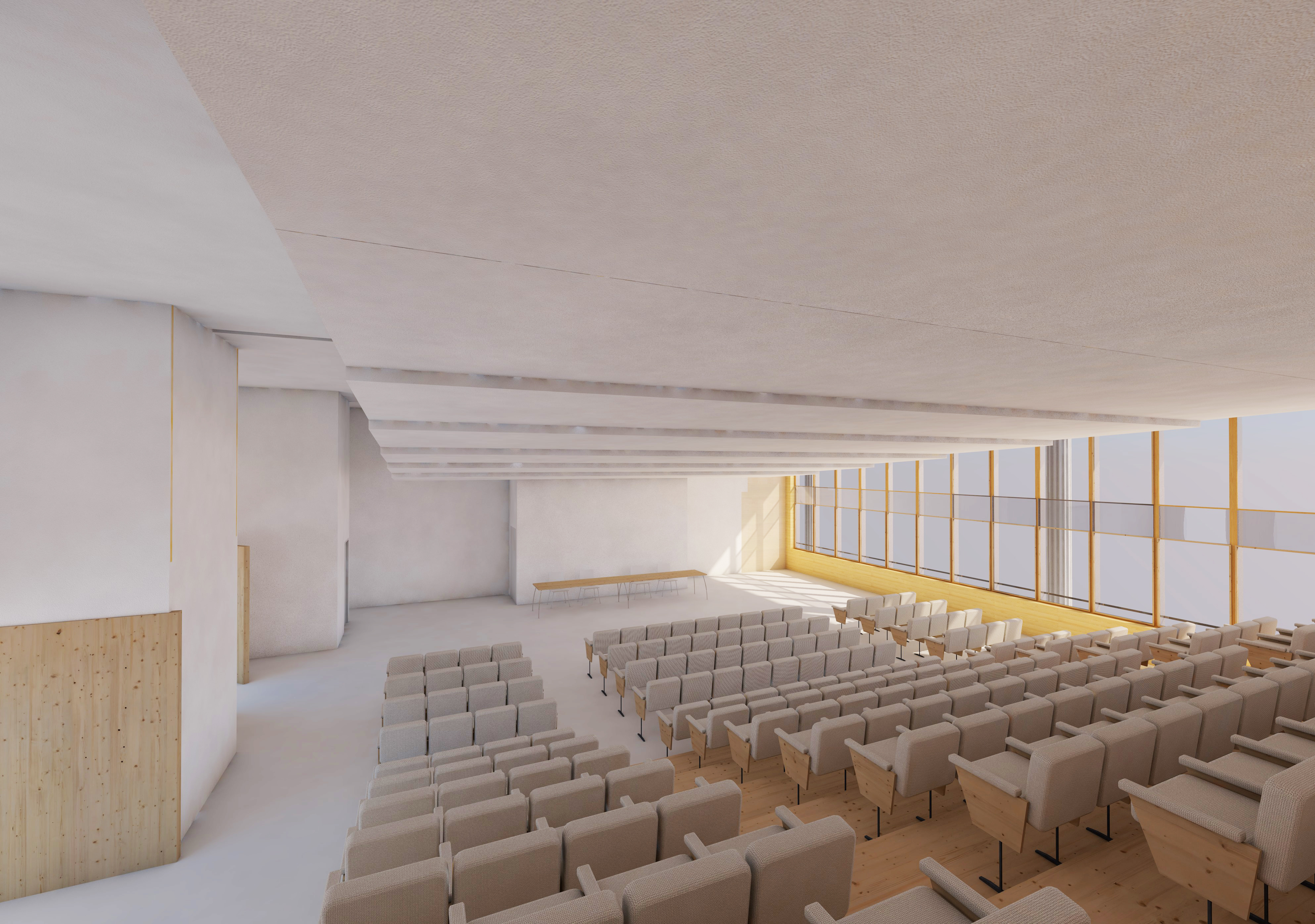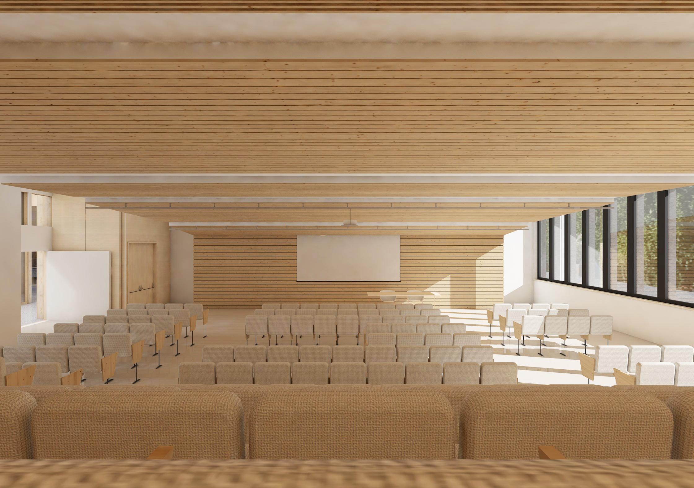 Le bâtiment se reconnaît à sa proue végétale, geste simple et fort qui l’ancre dans le site. Sa volumétrie, volontairement mesurée, traduit une posture d’humilité : il s’agit moins d’imposer que de s’intégrer, moins de monumentalité que d’ouverture. Ici, l’architecture refuse l’austérité des institutions traditionnelles et affirme une image claire, lisible, accueillante.