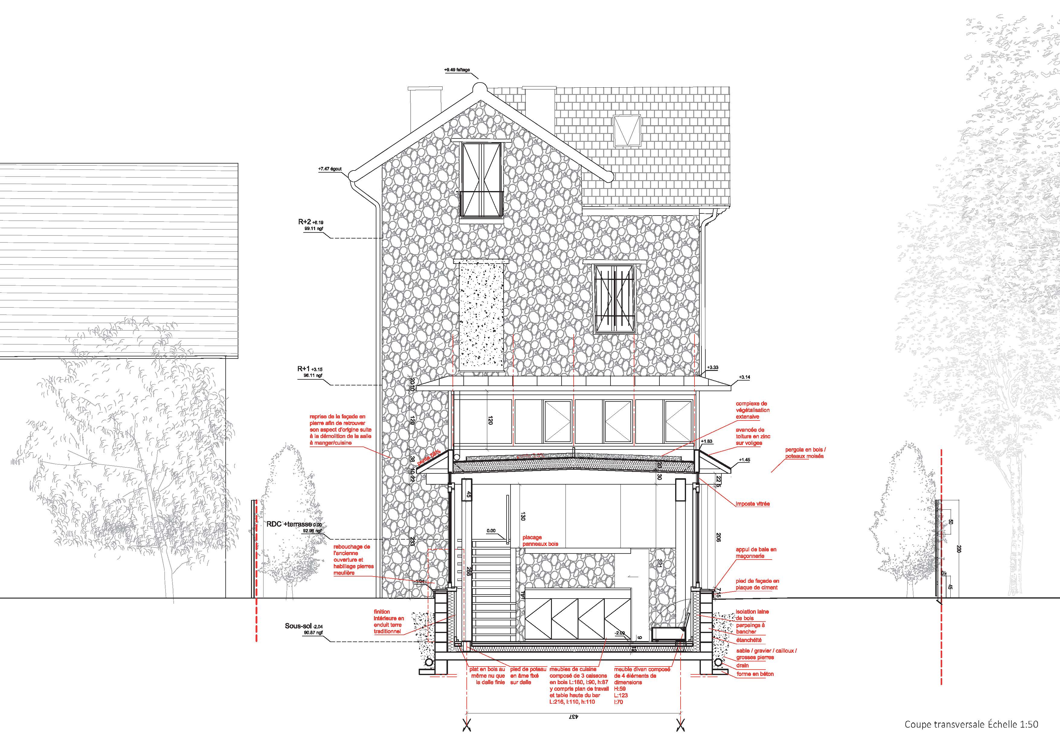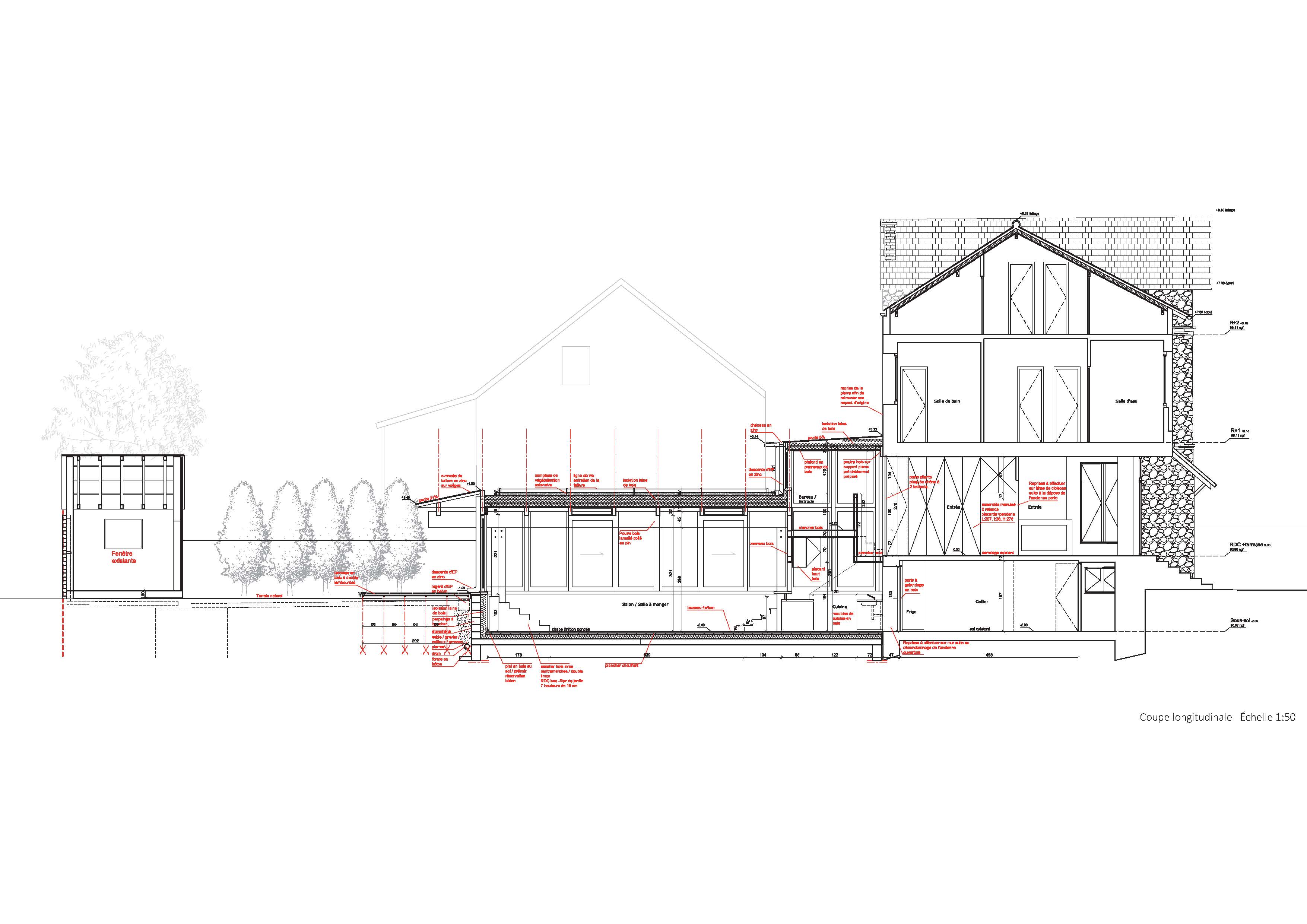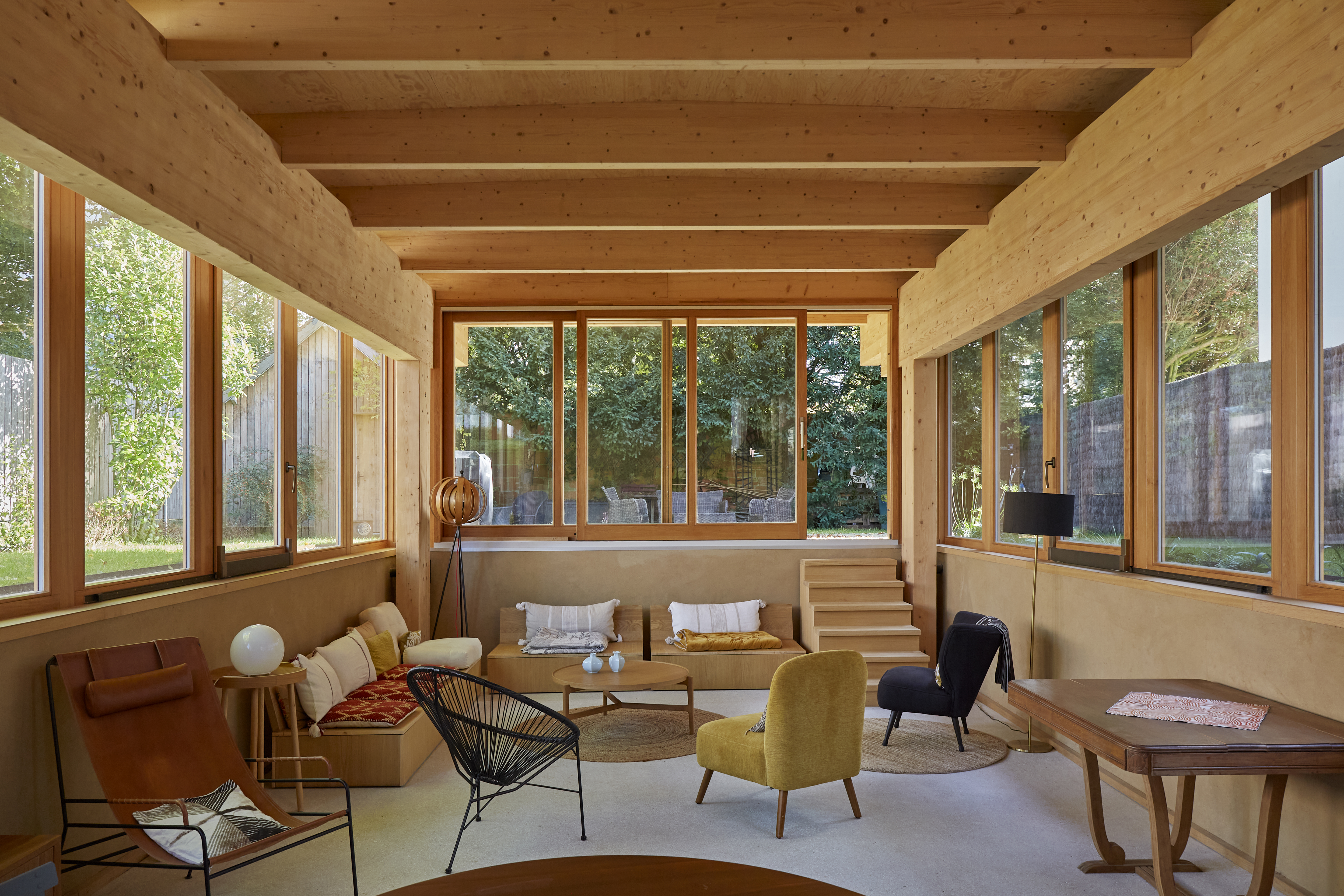 L’extension a été pensée comme un toit porté en lévitation au-dessus du sol du jardin via une structure simple en bois composée de poteaux et de poutres. Le sol creusé sur 1m de profondeur permet à l’extension de rester discrète vis à vis de son voisinage. La liaison avec l’existant se matérialise par une émergence verticale vitrée au-dessus de l’escalier qui assure une transition douce, transparente et lumineuse avec l’existant. Le toit de l’extension présente de légers débords permettant de renforcer l’intériorité du projet et assure une protection solaire satisfaisante.
