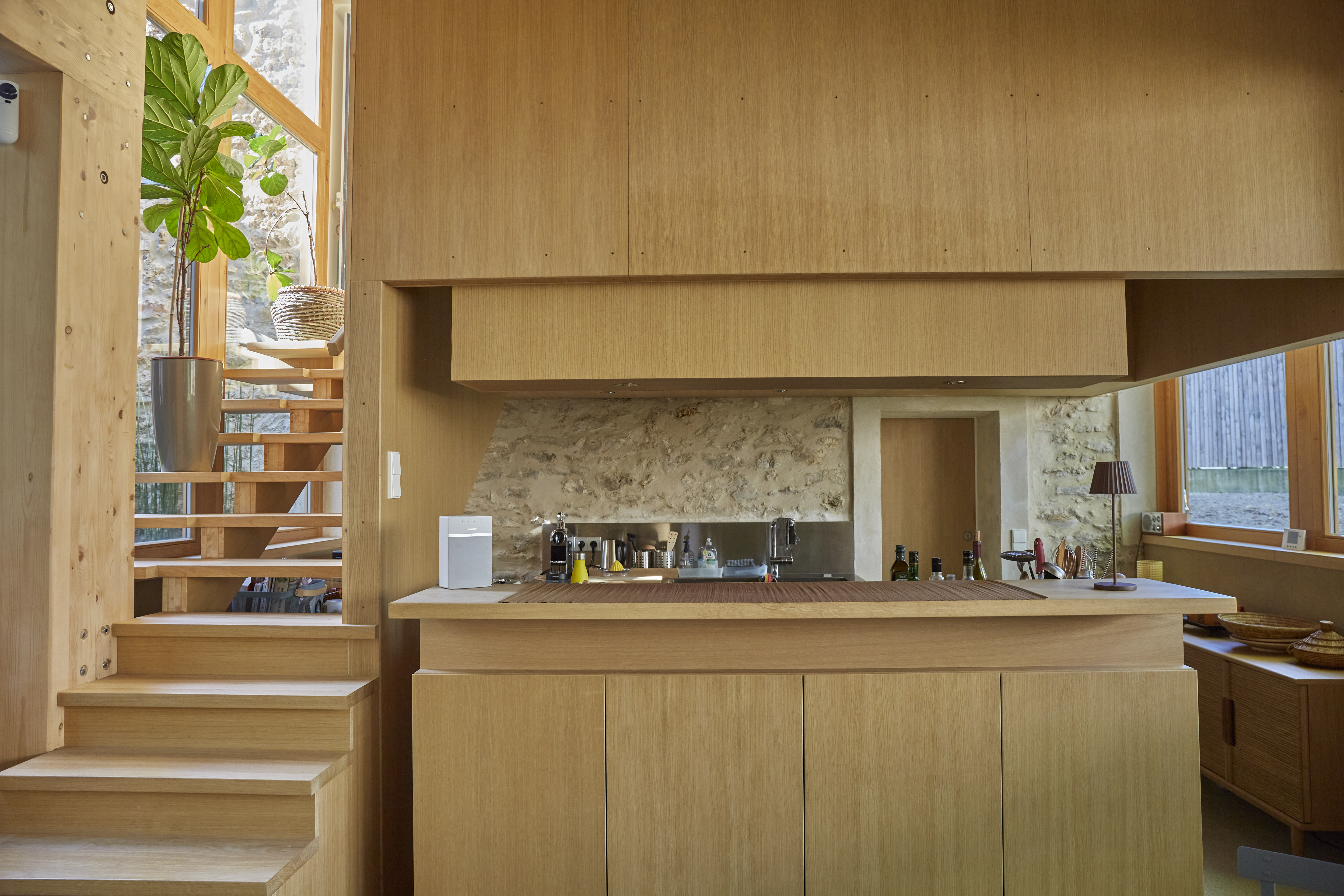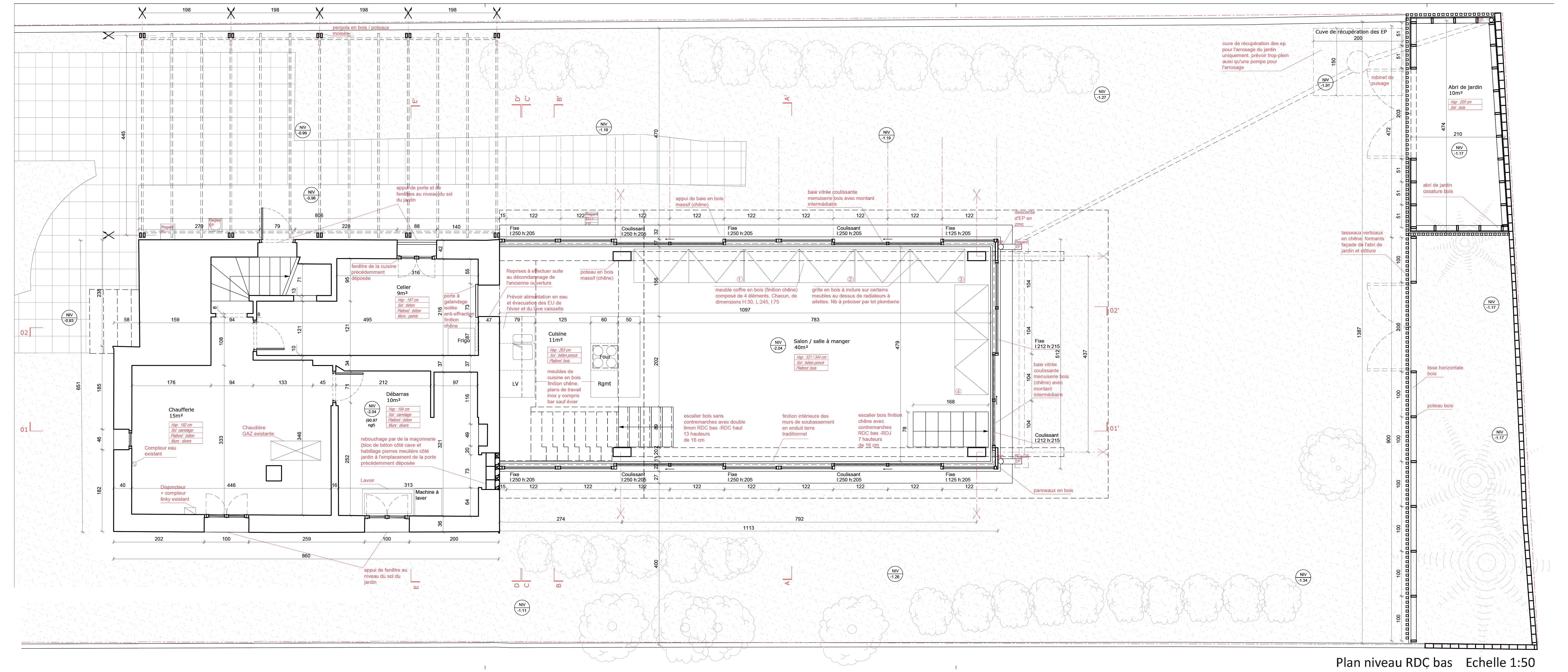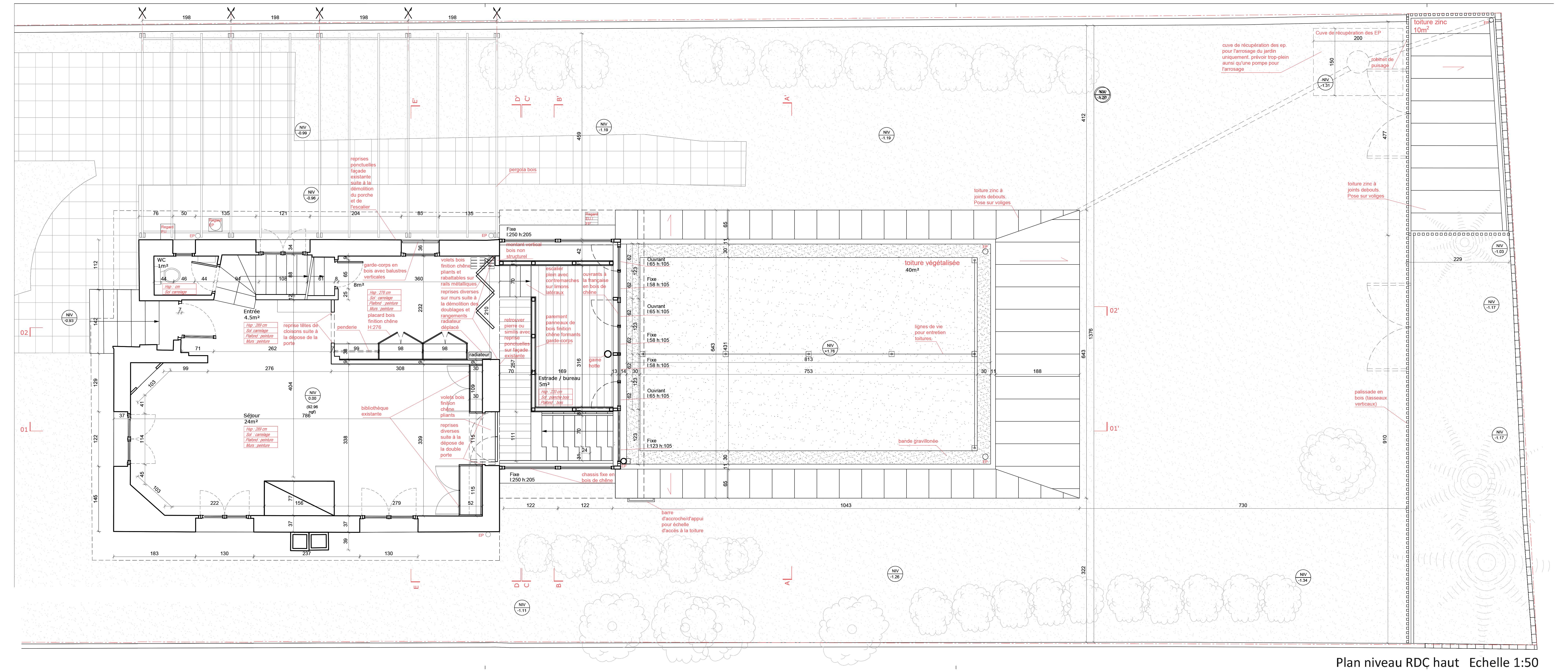 L’extension a été pensée comme un toit porté en lévitation au-dessus du sol du jardin via une structure simple en bois composée de poteaux et de poutres. Le sol creusé sur 1m de profondeur permet à l’extension de rester discrète vis à vis de son voisinage. La liaison avec l’existant se matérialise par une émergence verticale vitrée au-dessus de l’escalier qui assure une transition douce, transparente et lumineuse avec l’existant. Le toit de l’extension présente de légers débords permettant de renforcer l’intériorité du projet et assure une protection solaire satisfaisante.