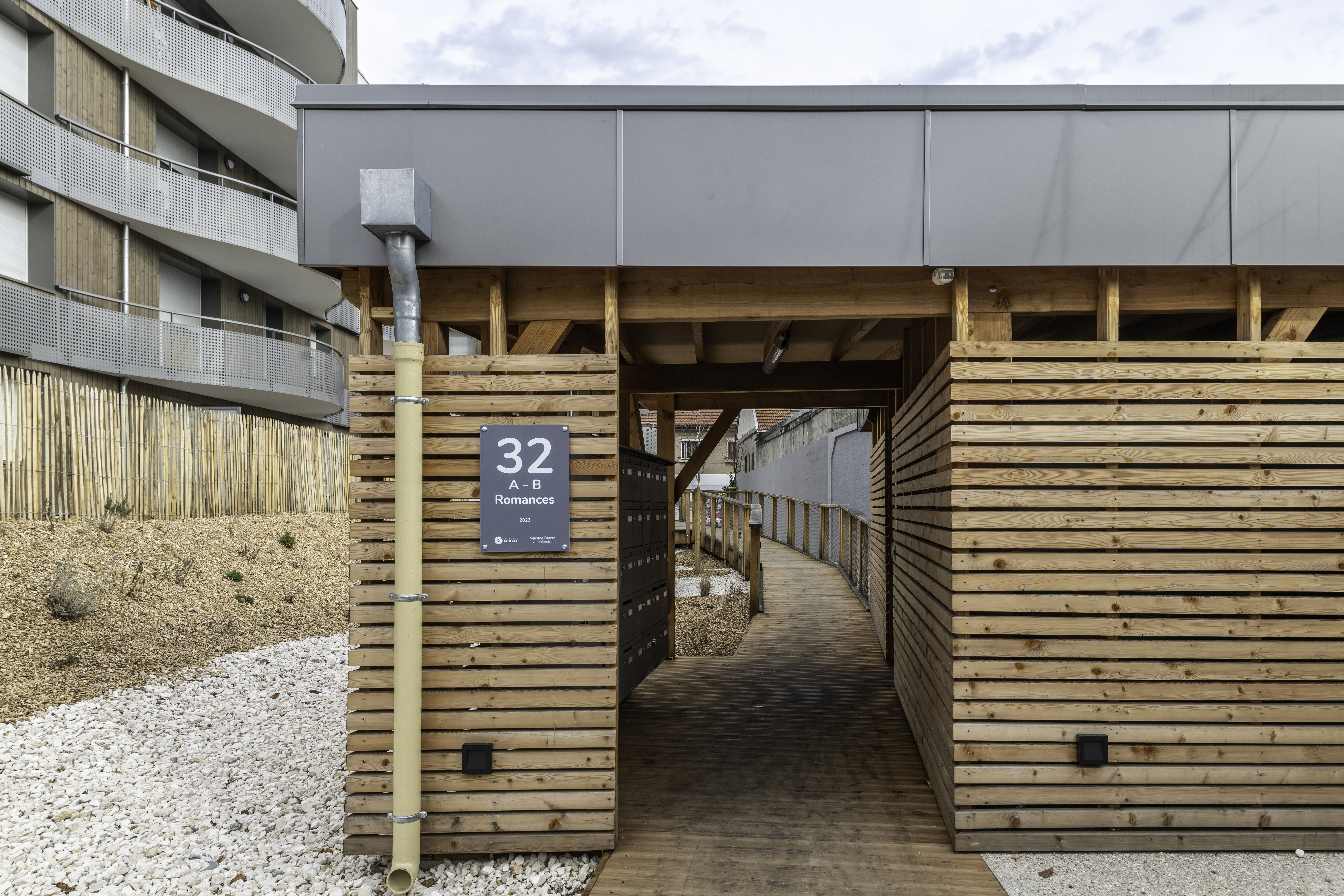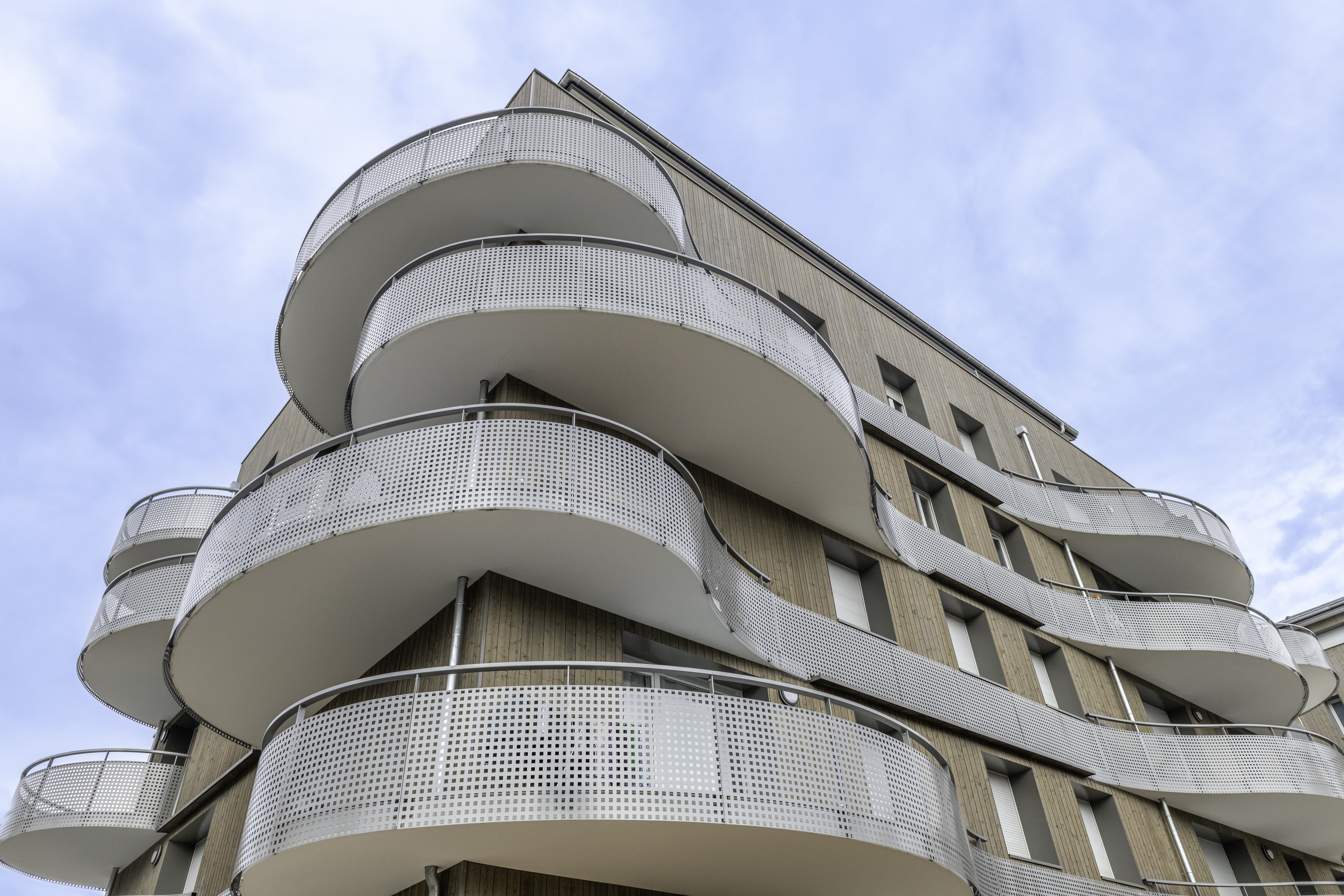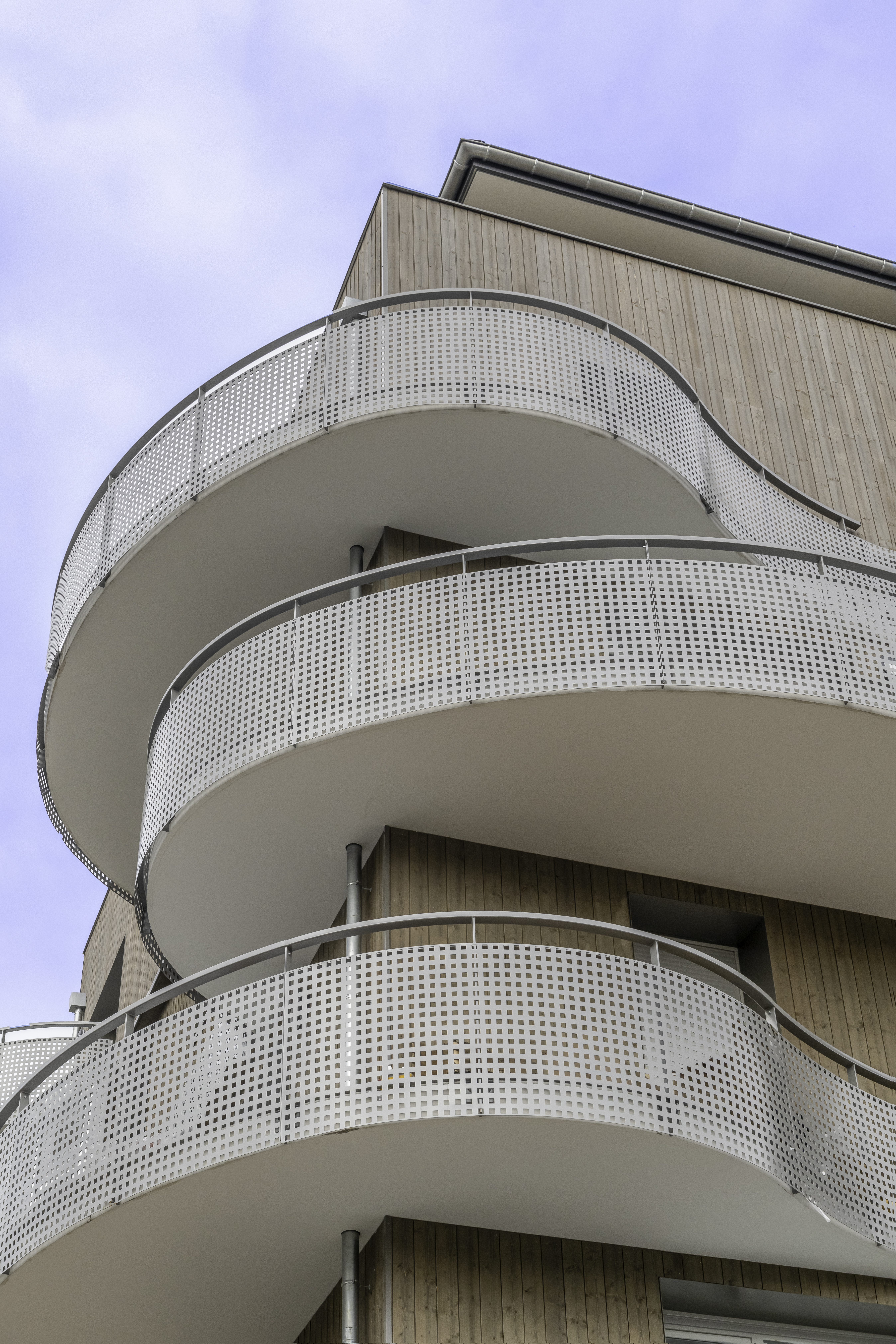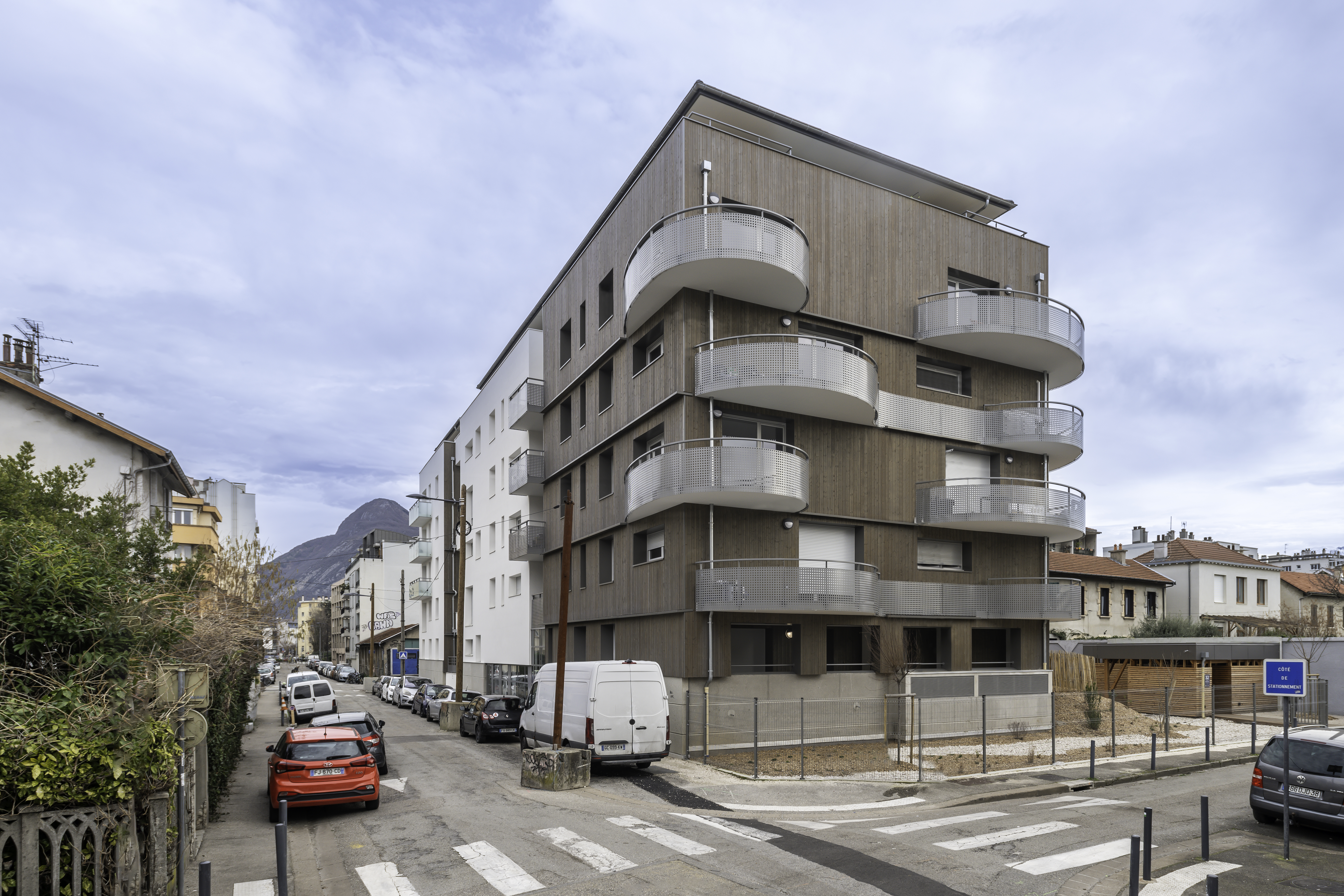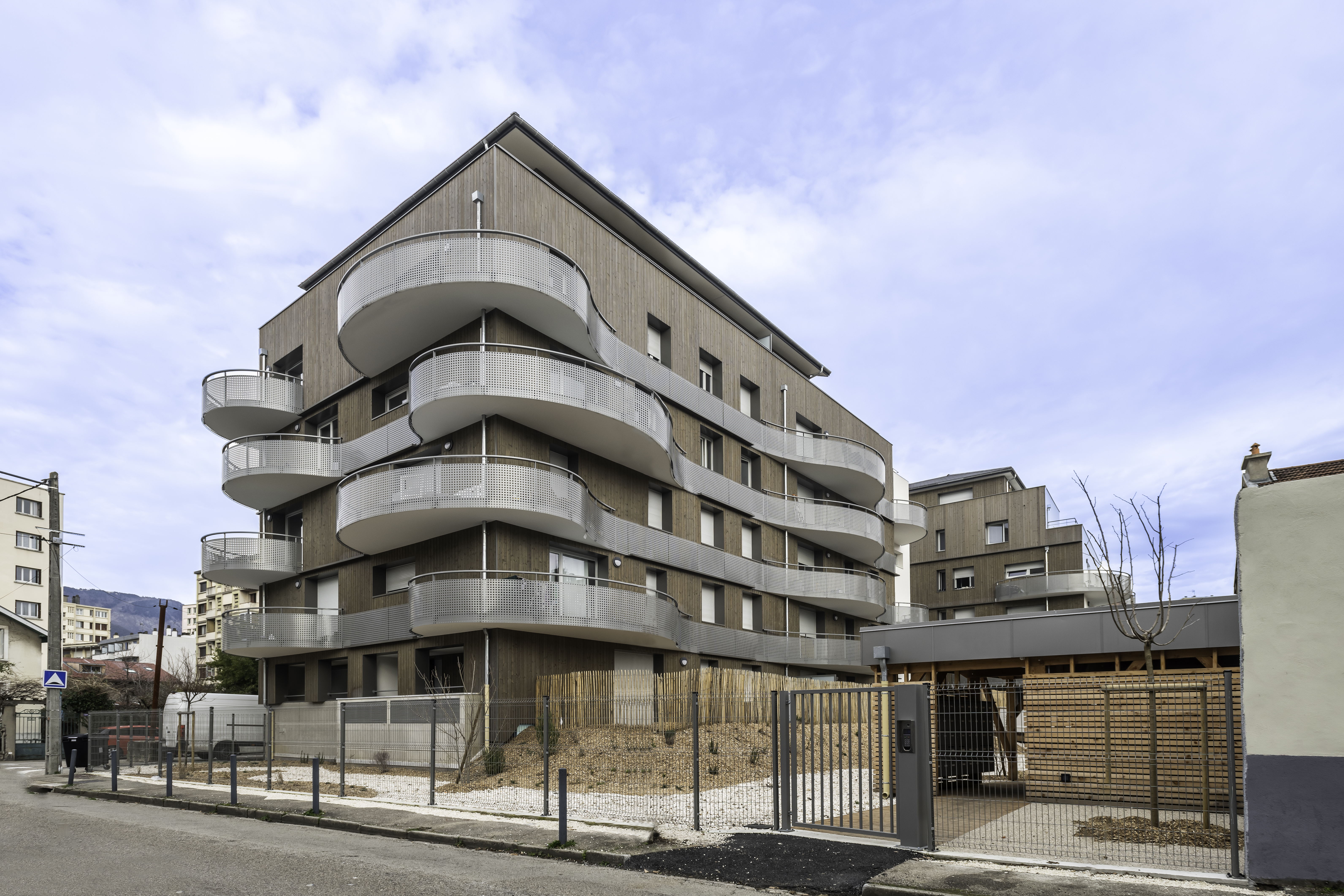 Entre deux rues calmes de la ville, l’architecture surgit comme une respiration nouvelle. D’un côté, la blancheur minérale, découpée par la rigueur des lignes, dialogue avec la clarté du ciel alpin. De l’autre, la chaleur du bois et les balcons ondoyants qui semblent suivre le rythme des montagnes au loin. Les façades se répondent : l’une discrète, protectrice, presque silencieuse ; l’autre ouverte, vibrante, animée par des courbes légères, comme une partition musicale. Les passerelles et l’entrée en bois invitent à franchir un seuil, à passer du tumulte de la rue à l’intimité d’un espace partagé, doux et accueillant. Ici, l’habitat se tisse entre contraste et continuité : entre la rigueur urbaine et la fluidité organique, entre la mémoire du béton et la tendresse du bois, entre le collectif et l’intime. C’est une architecture qui ne se contente pas d’abriter, mais qui propose un rythme de vie, une manière d’habiter, attentive au paysage et au quotidien.