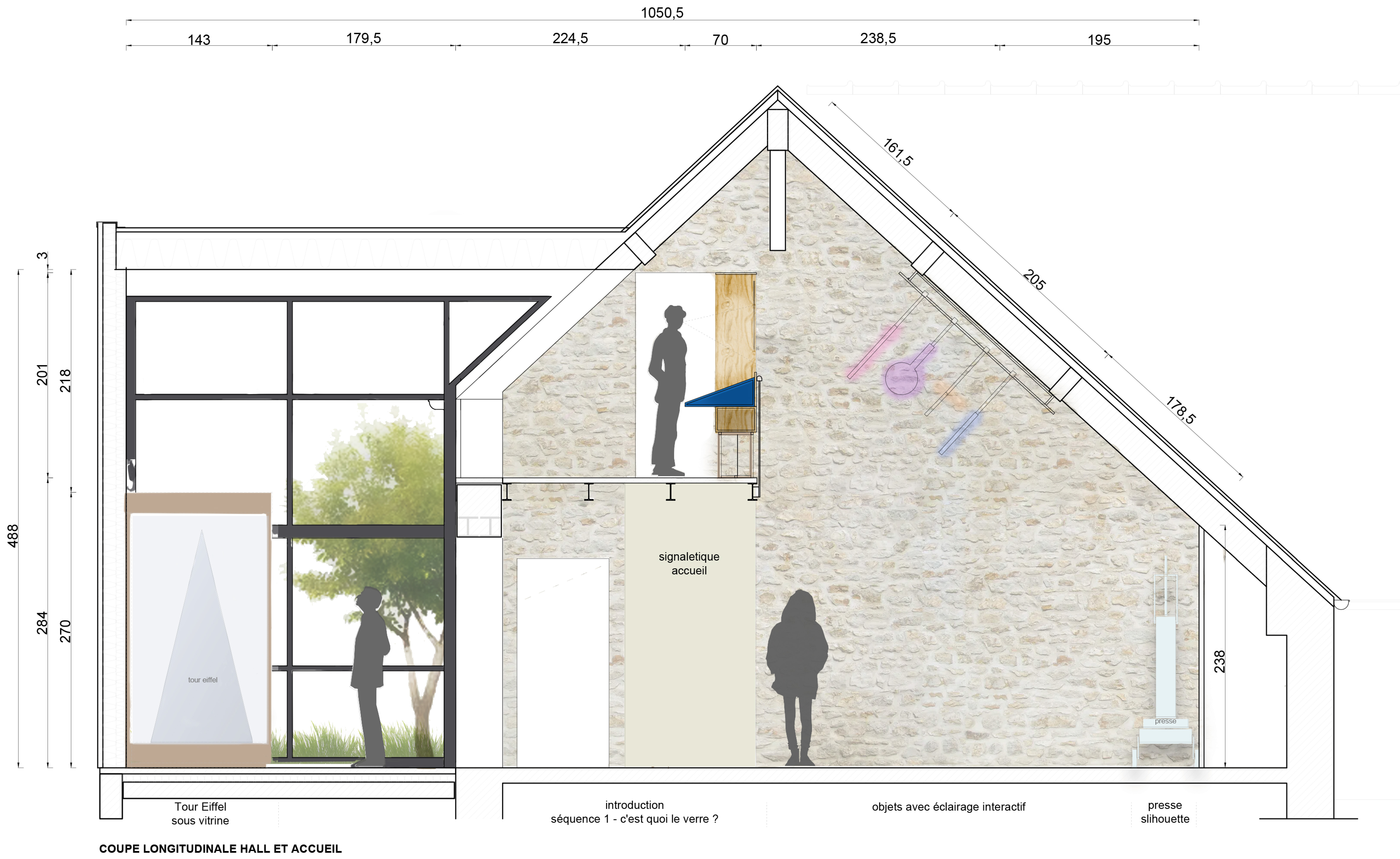 Le Musée est enfin un espace architectural que la scénographie a investi pour en révéler les volumes, sans intrusion structurelle, préservant le caractère dual du bâtiment entre grange fermière associé à des extensions contemporaines. La scénographie dans cette écriture duale s’inspire de la préciosité du souvenir et du verre et de l’esthétique industrielle des usines pour offrir au nouveau parcours permanent un écrin propice à la découverte de ce patrimoine fragile.
