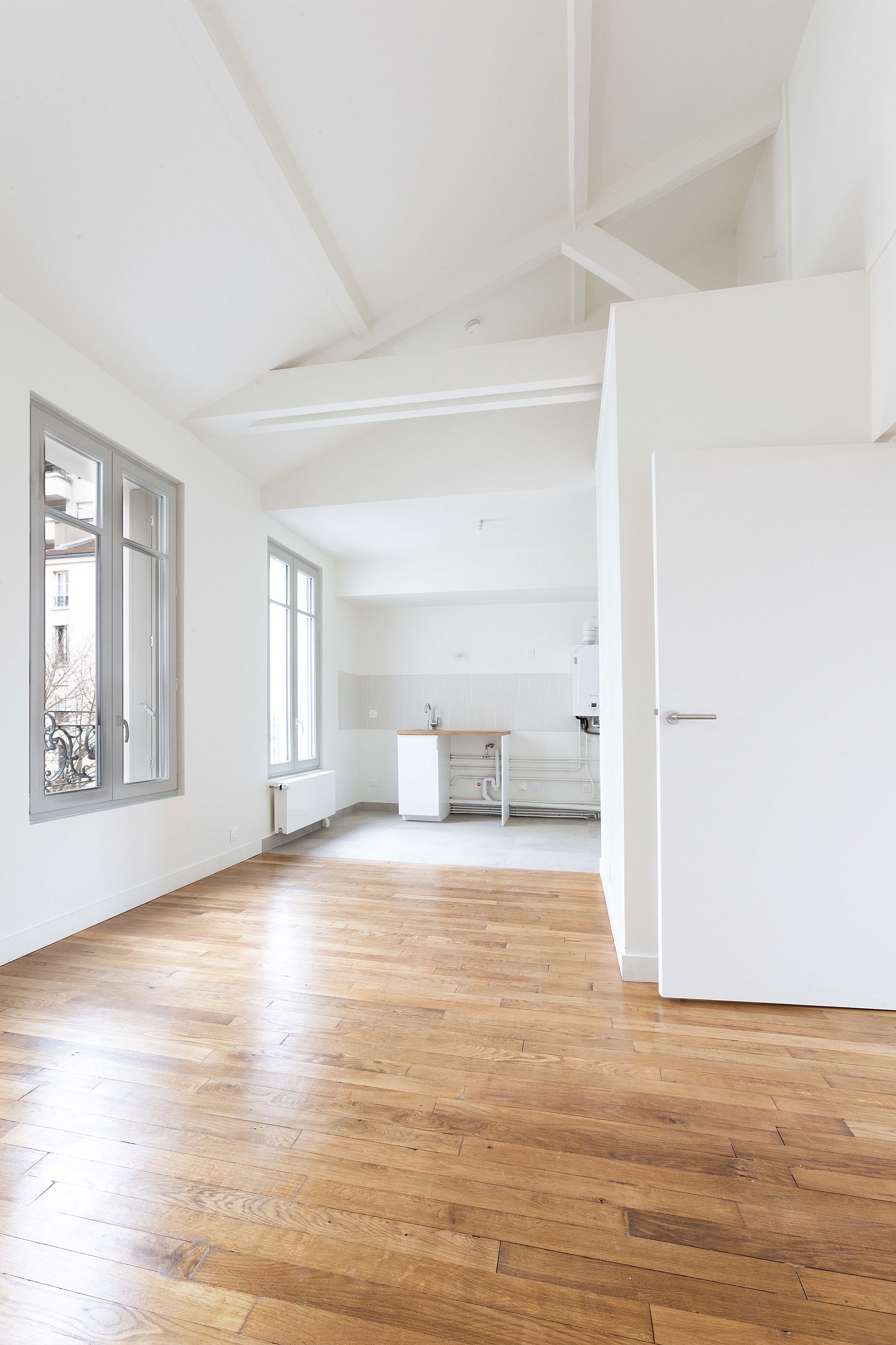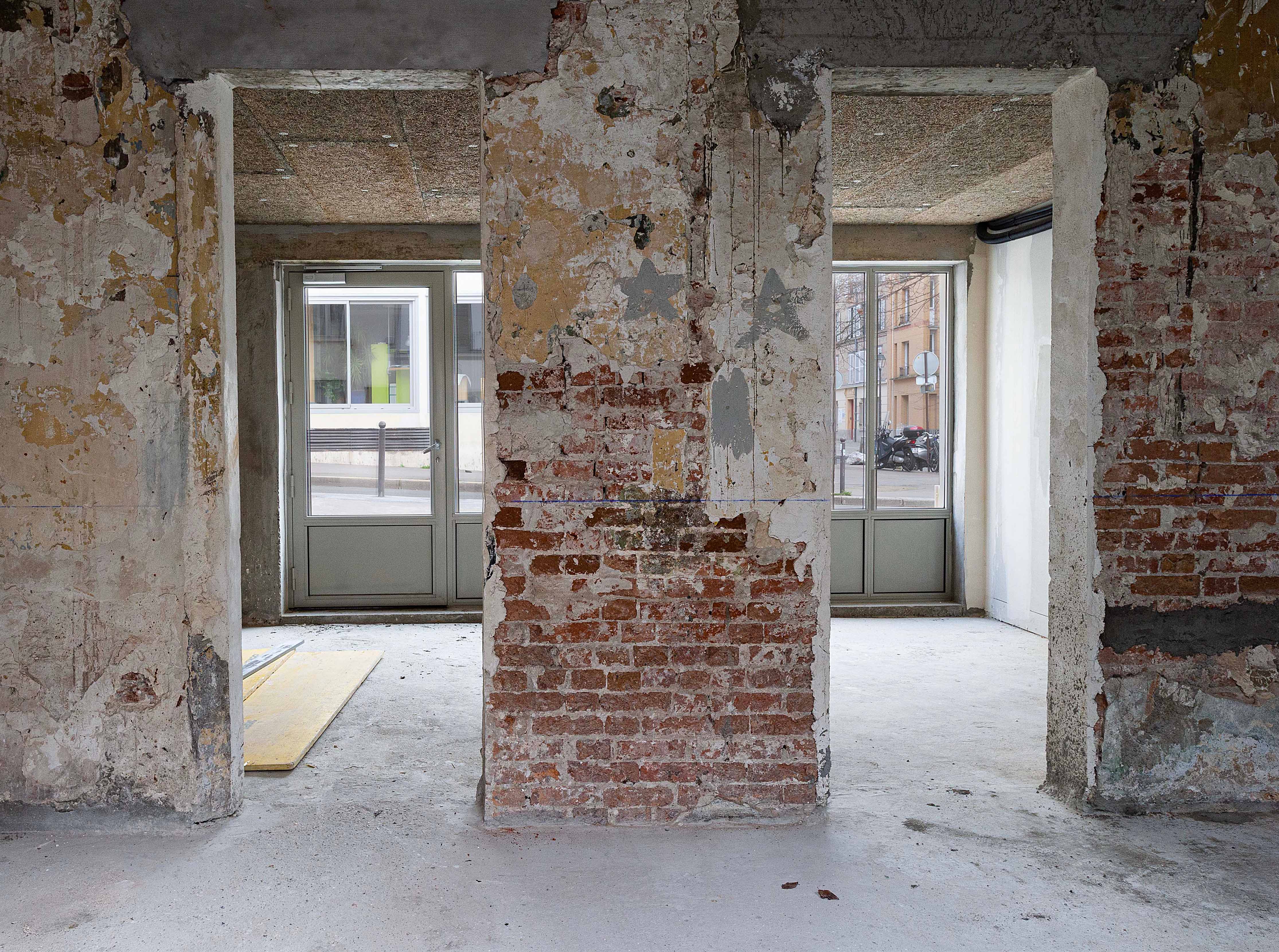 L’ensemble du bâtiment est curé et les planchers sont repris afin d’en garantir la stabilité. La façade et l’escalier sont conservés, adaptés et mis en valeur. Le projet développe un appartement T2 traversant, spacieux et lumineux par niveau ainsi qu’un commerce et un hall au RDC du bâtiment sur rue.
