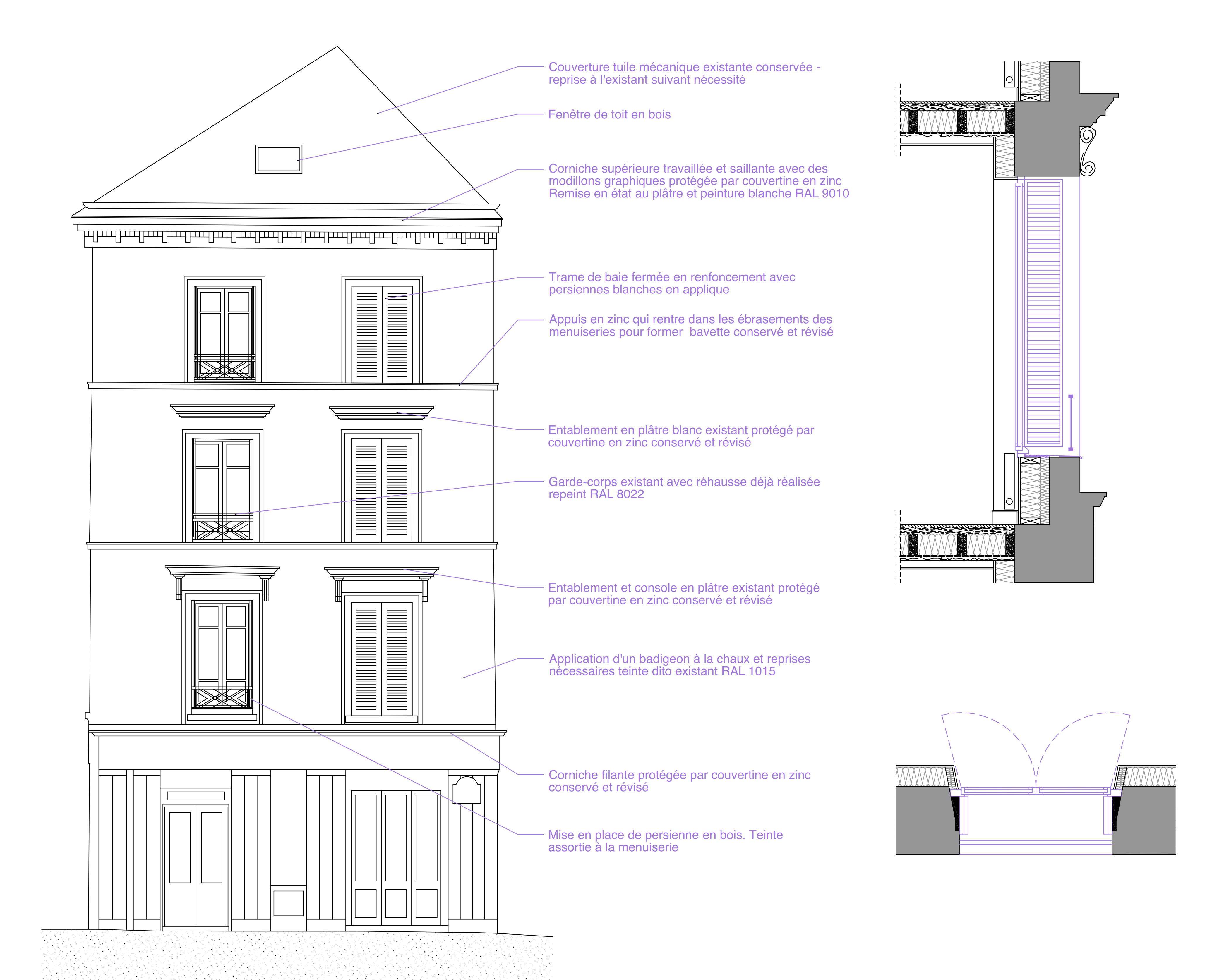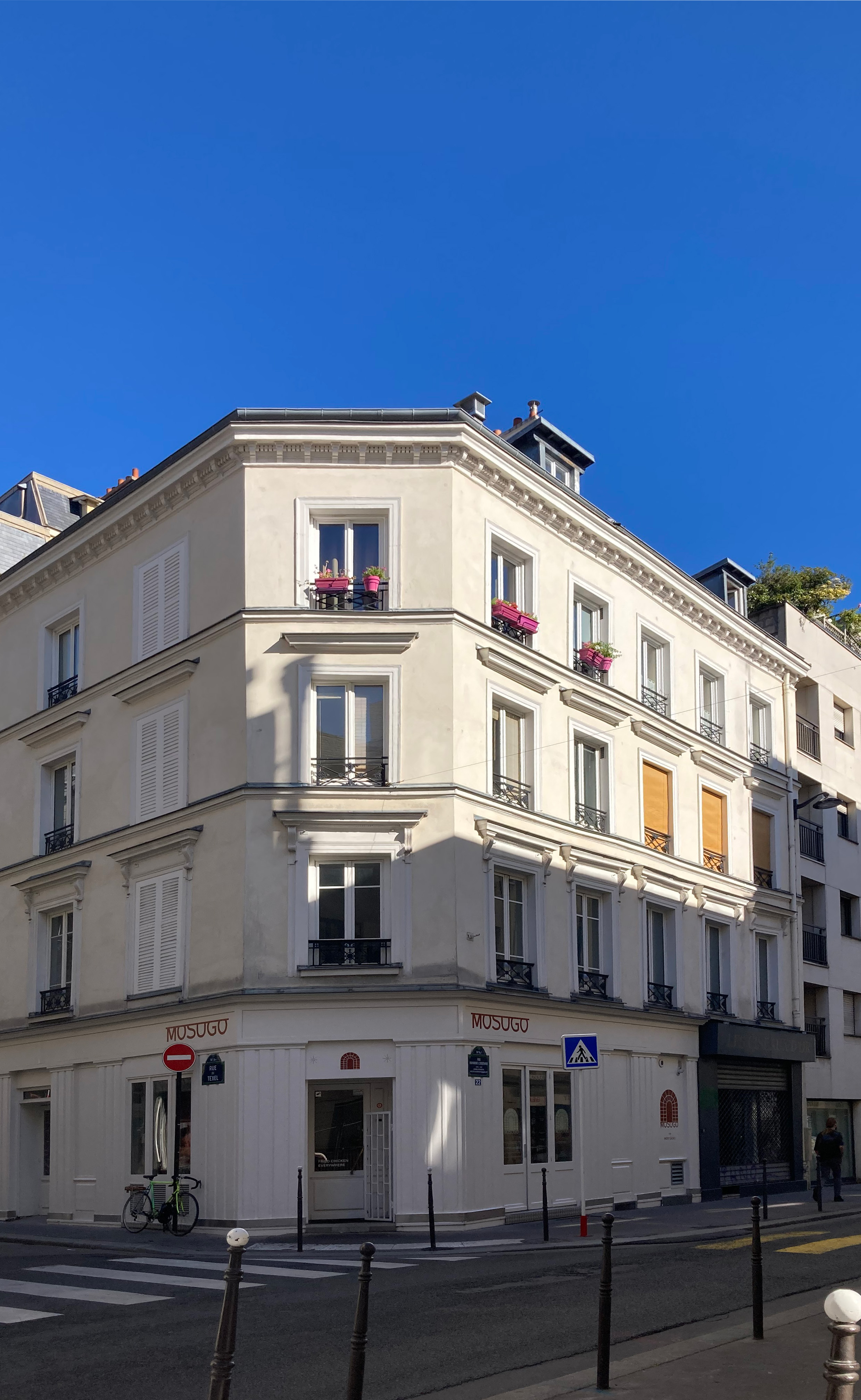 Construit au début du XIXe siècle, le bâtiment du 31 rue du Texel arbore fièrement ses façades d’angles, ornées de détails architecturaux remarquables tels que des moulures, encadrements, entablements, corniches simples et à modillons. L’ensemble est remis en état avec des techniques traditionnelles et harmonies de couleurs.