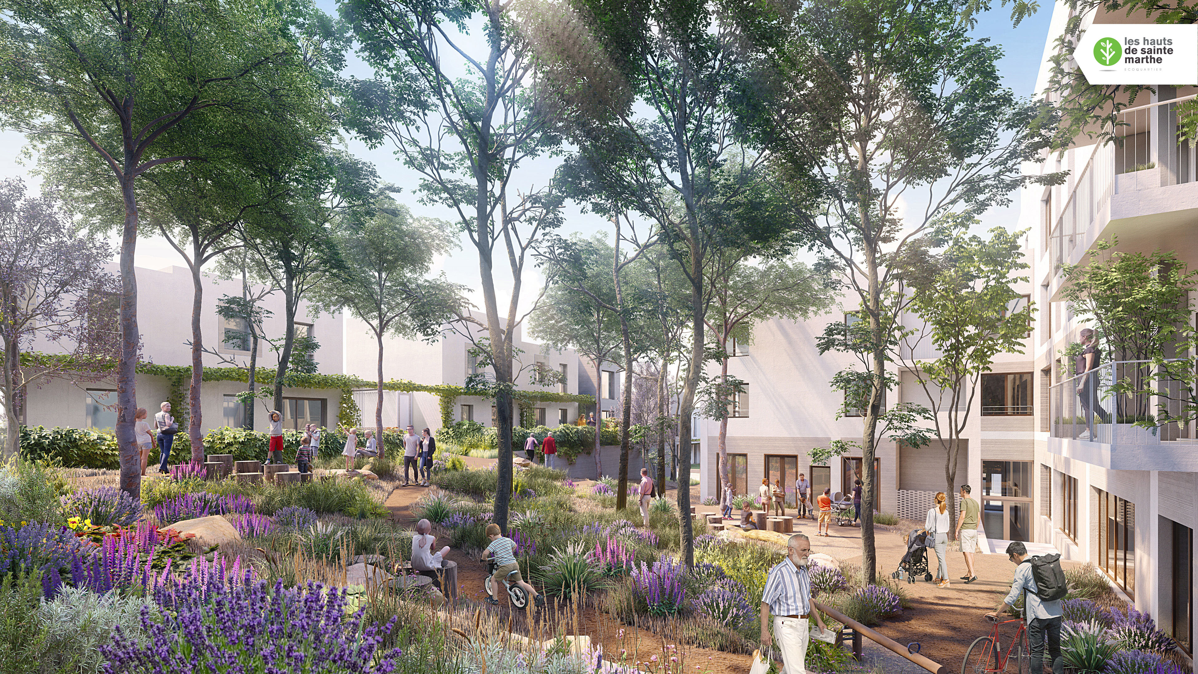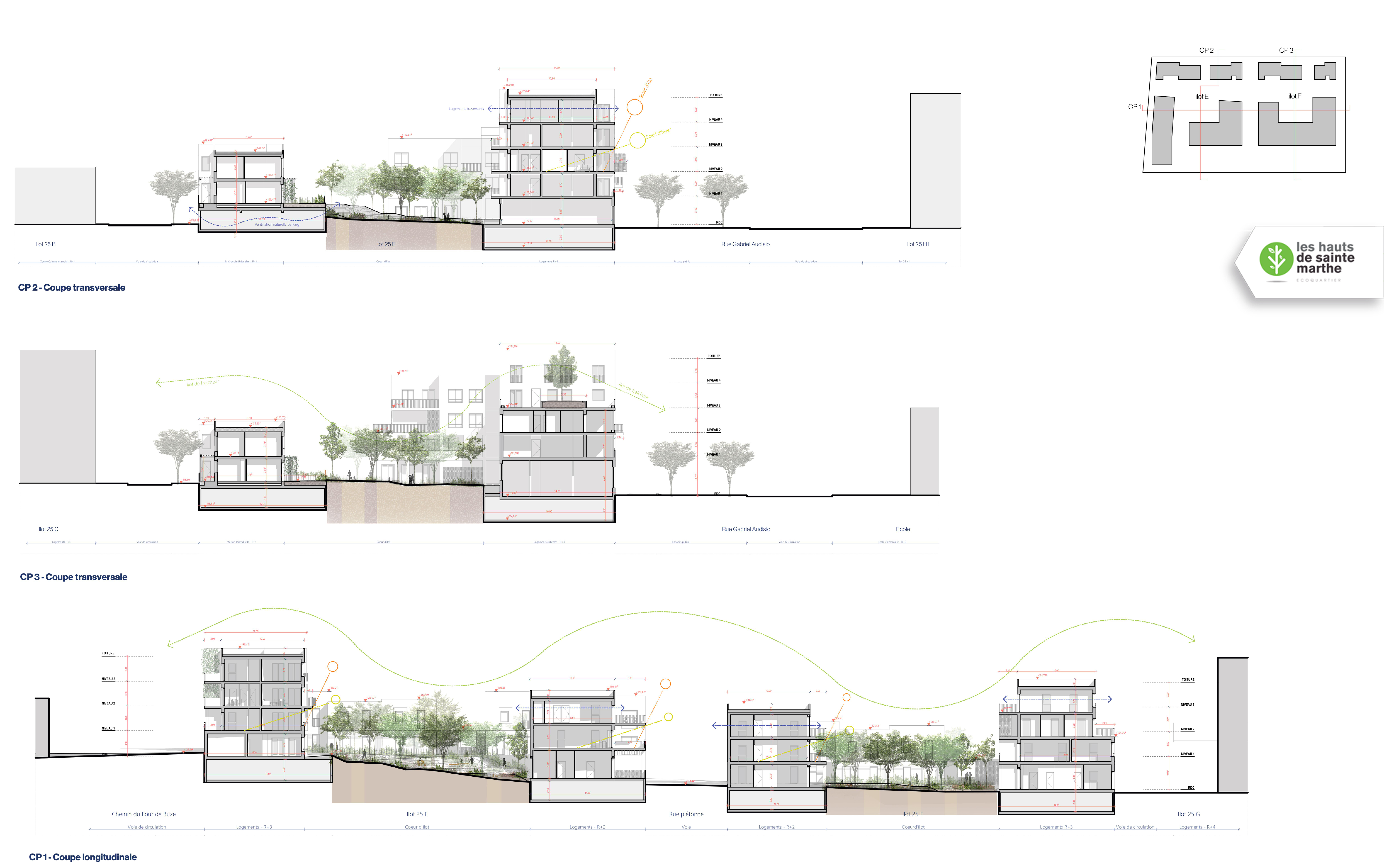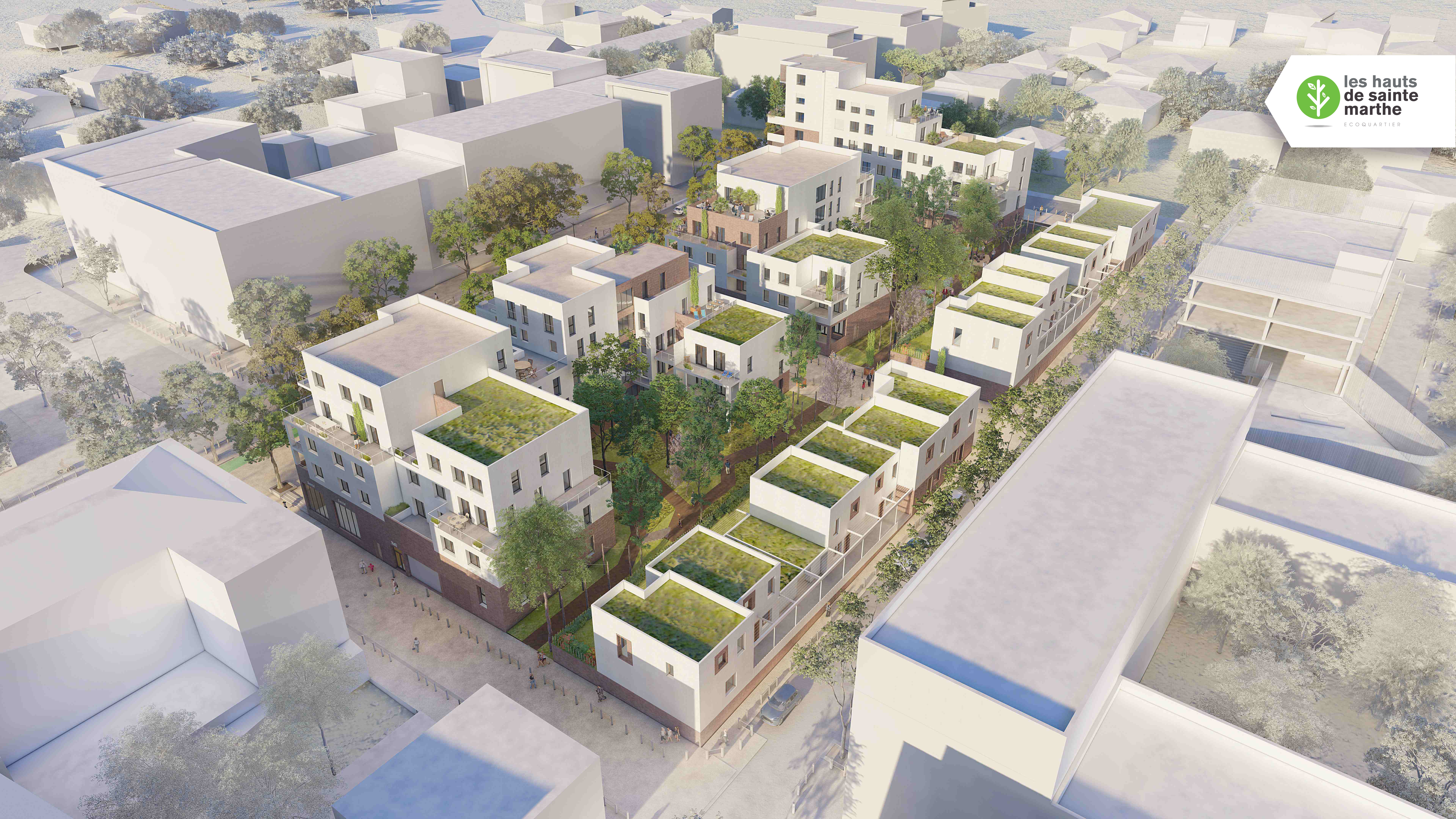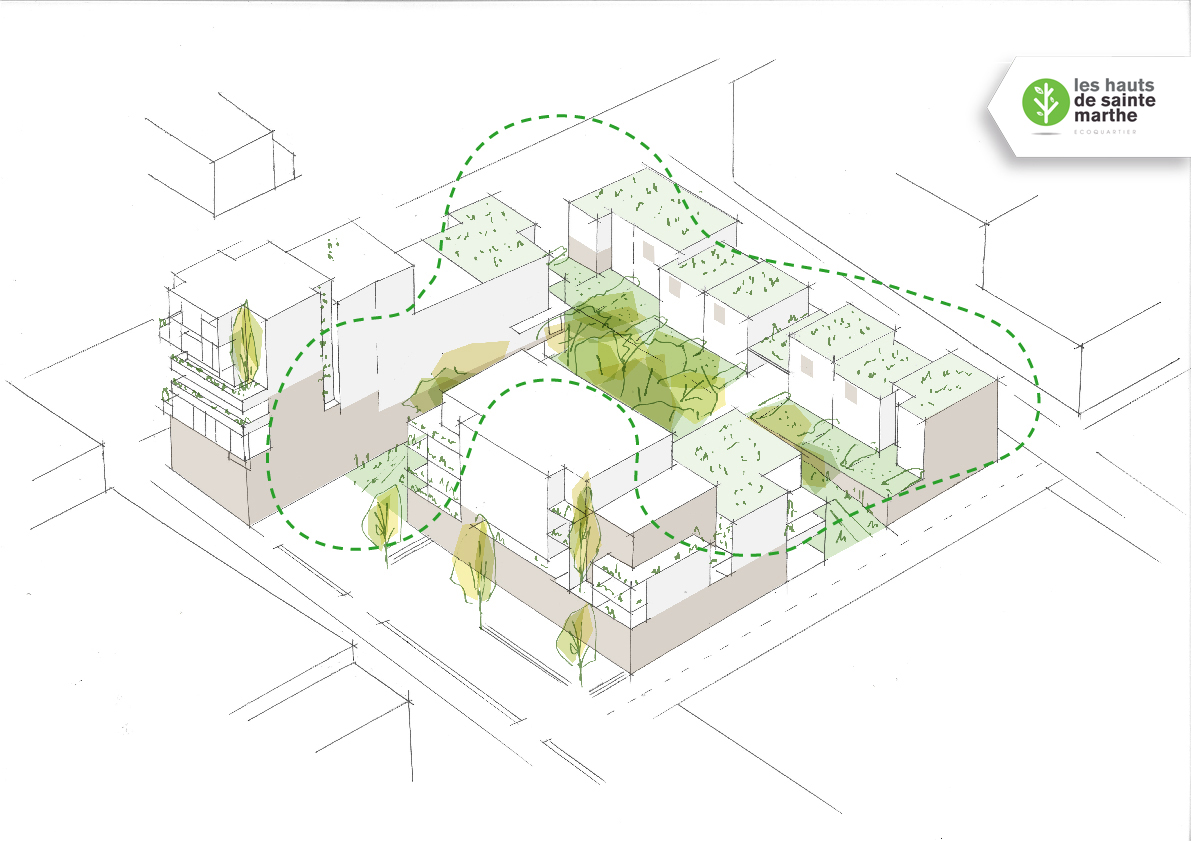 Le projet s’inscrit pleinement dans le futur cœur d’un Écoquartier, conciliant respect du patrimoine, qualité paysagère et gestion hydraulique exemplaire. Son implantation a été pensée pour créer un véritable dialogue avec le tissu urbain existant et les futurs espaces publics, affirmant ainsi son rôle structurant au sein du quartier. Un socle, terre de nouveau paysage, lie l’ensemble du projet et marque l’identité du site. L’hétérogénéité de l’épannelage agit comme vecteur d’une échelle de voisinage, tout en offrant des vues dégagées et sans vis-à-vis.