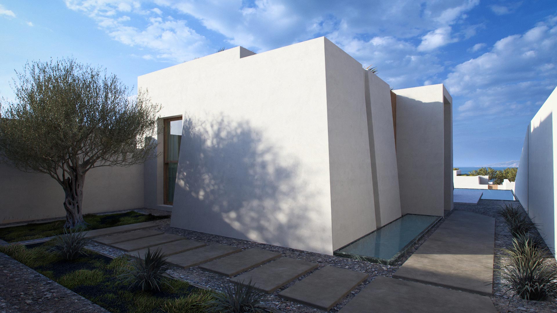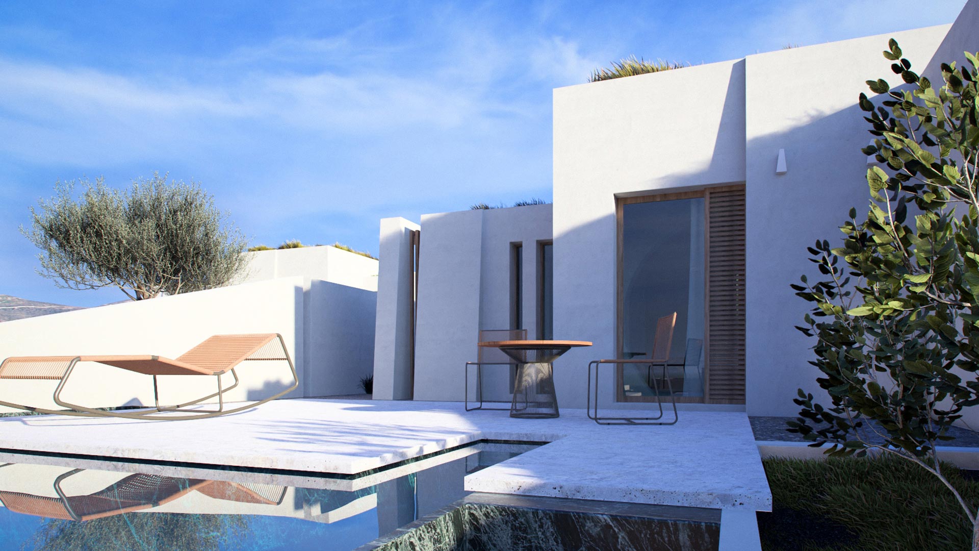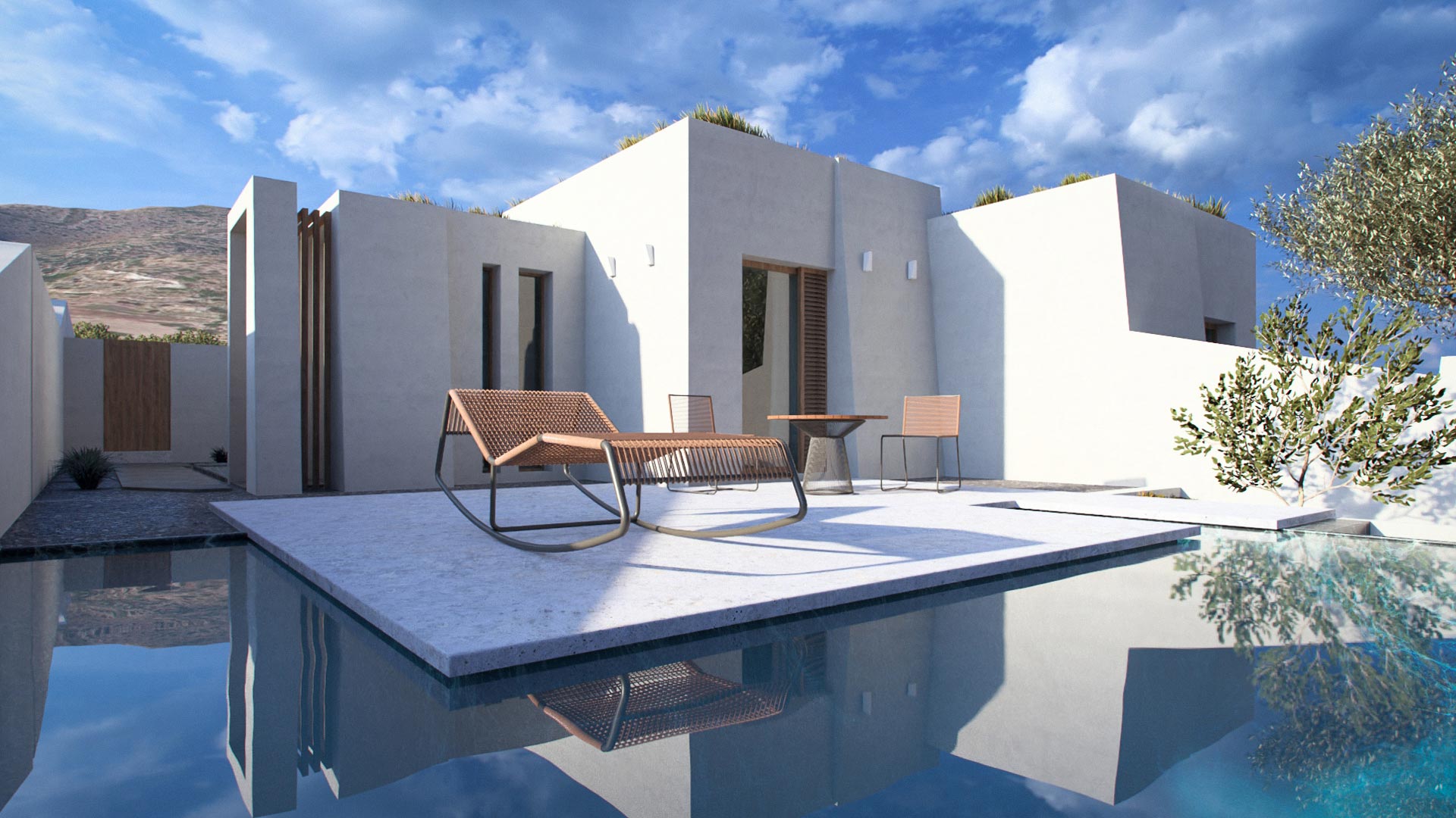 The hotel hosts 14 self-contained double rooms, each covering 35 sqm and 11 villas of 120 sqm. The layout strategically positions large room openings on the southeast side, offering views of the island and the sea. Smaller openings on the north side connect guests with the mountain landscape. Every unit is complemented by a private swimming room of 17 sqm, a front yard overlooking a communal garden and a back private yard, shielded by high walls for protection against wind and intense sun exposure.