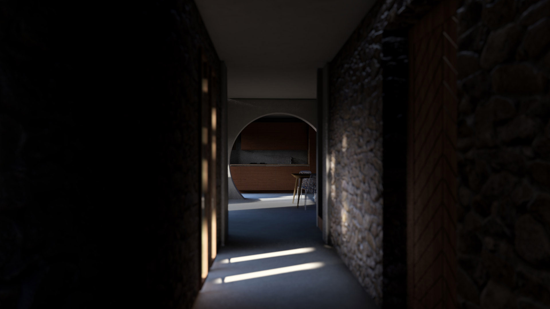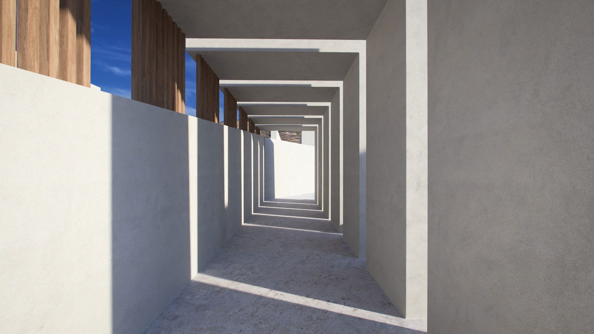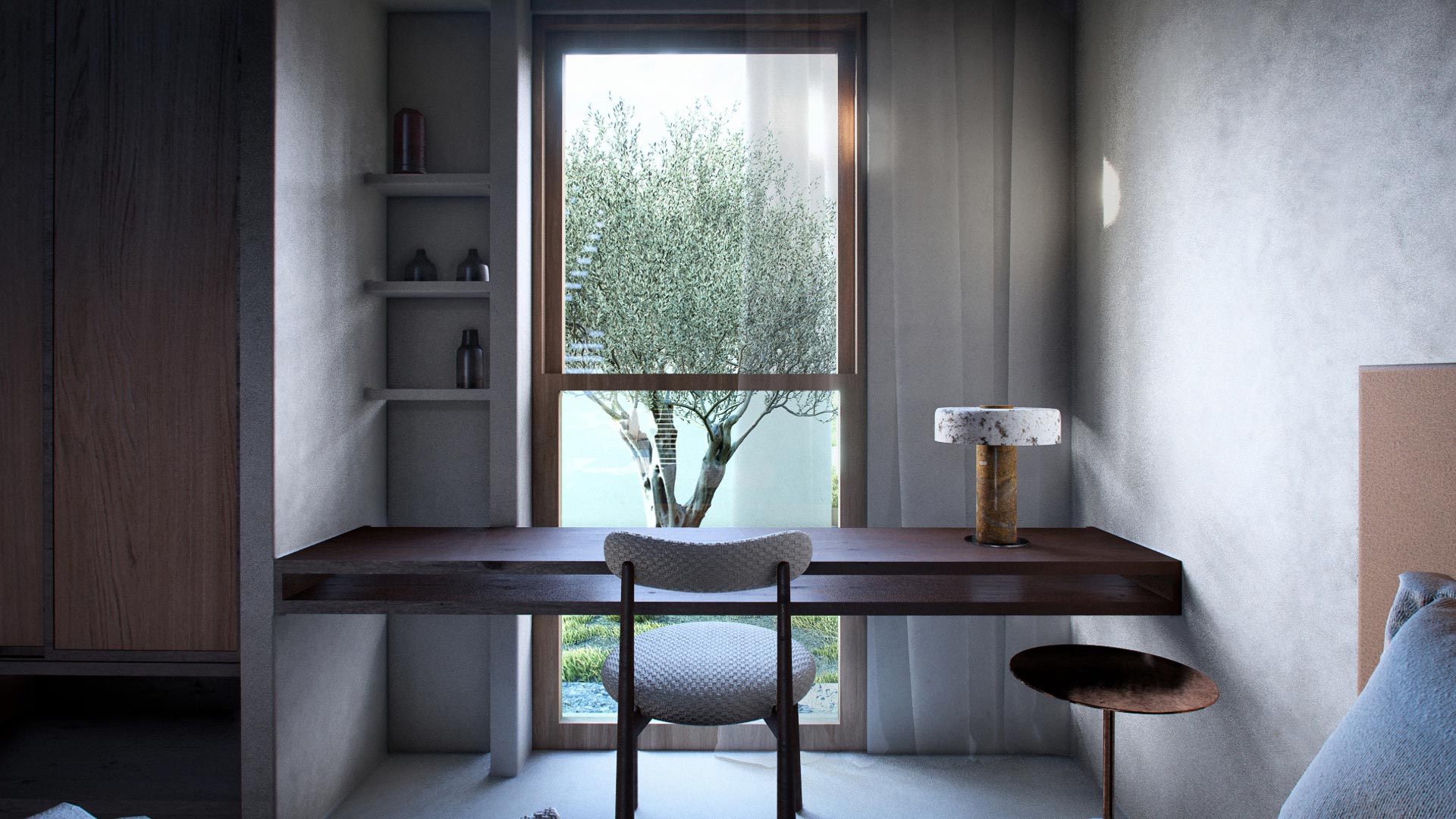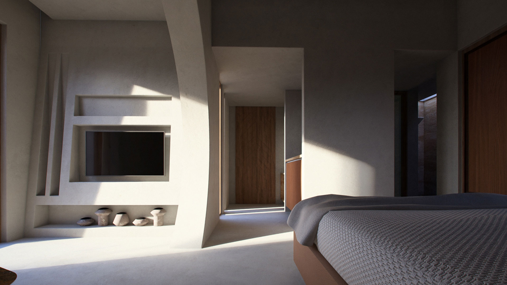 The hotel hosts 14 self-contained double rooms, each covering 35 sqm and 11 villas of 120 sqm. The layout strategically positions large room openings on the southeast side, offering views of the island and the sea. Smaller openings on the north side connect guests with the mountain landscape. Every unit is complemented by a private swimming room of 17 sqm, a front yard overlooking a communal garden and a back private yard, shielded by high walls for protection against wind and intense sun exposure.