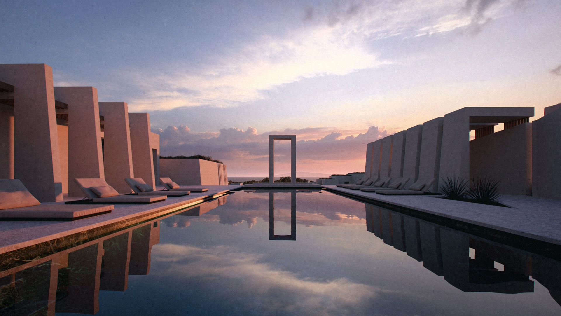 The focal point of the hotel is the central pool, situated on two levels along the main axis facing the sea. A symbolic geometric frame is placed at the pool’s edge, guiding the gaze towards the island landscape and the open sea. This design element adds a touch of elegance and serves as a visual gateway for visitors.