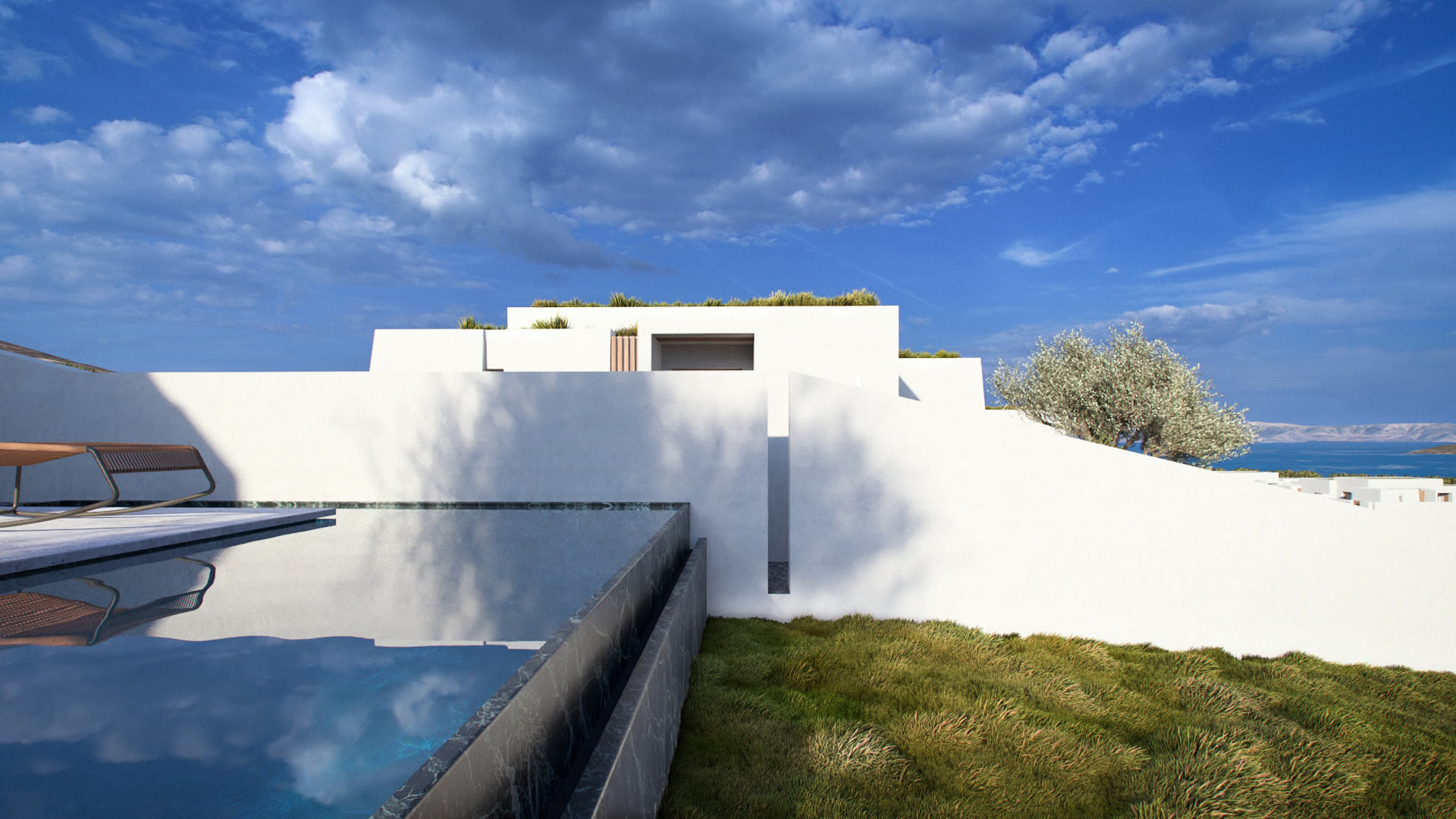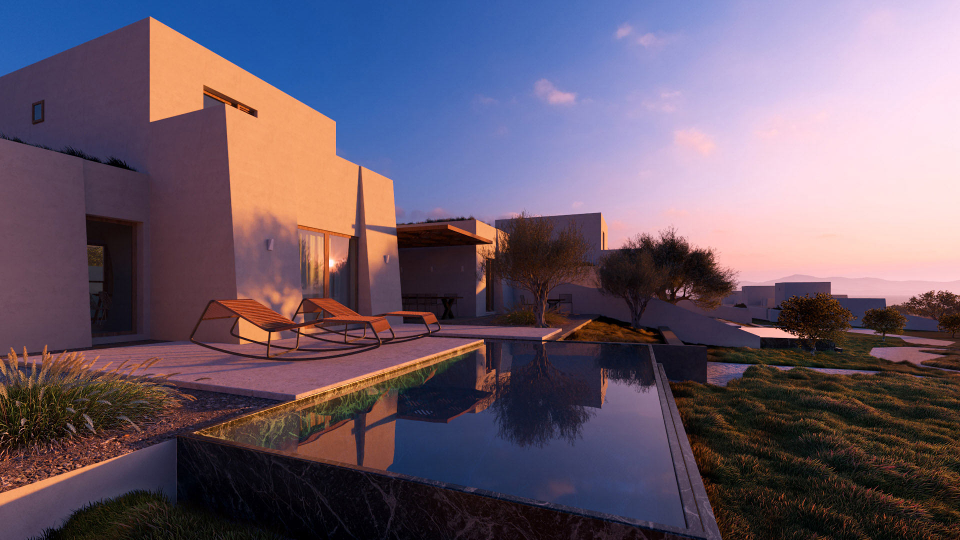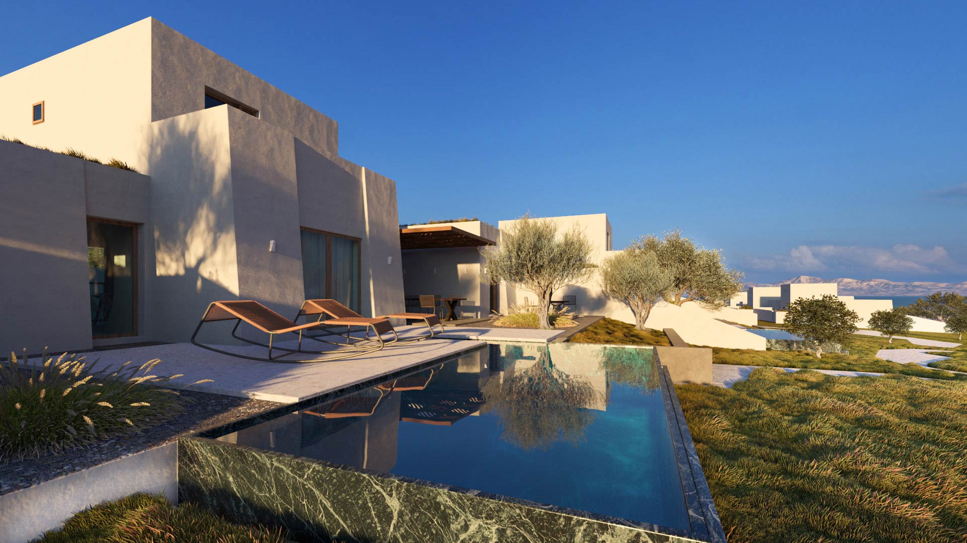 The commitment to sustainability is evident in the choice of materials. Ecological plaster, marble, and natural stone are used, emphasizing a harmonious coexistence with the environment. The pools, covered with greenish-blue marble, mimic the color of the Aegean Sea.