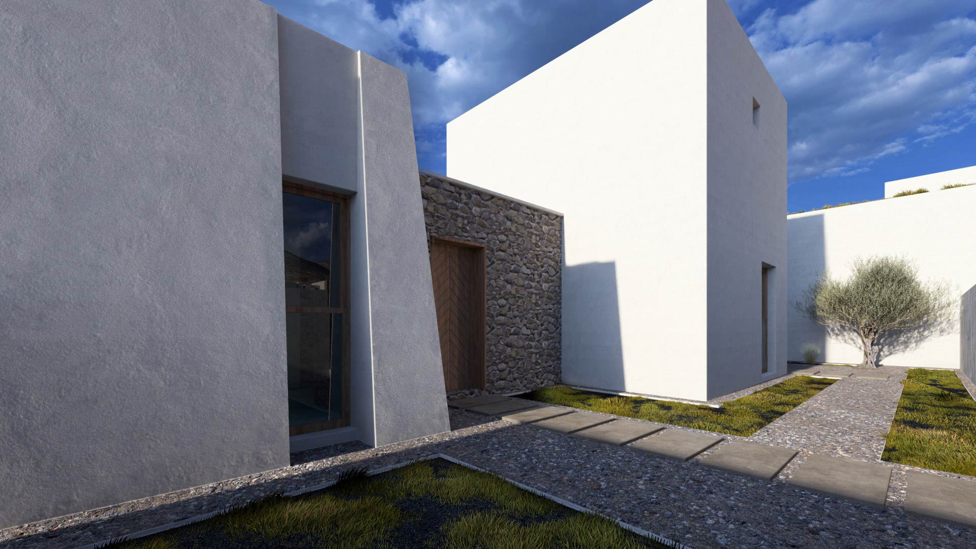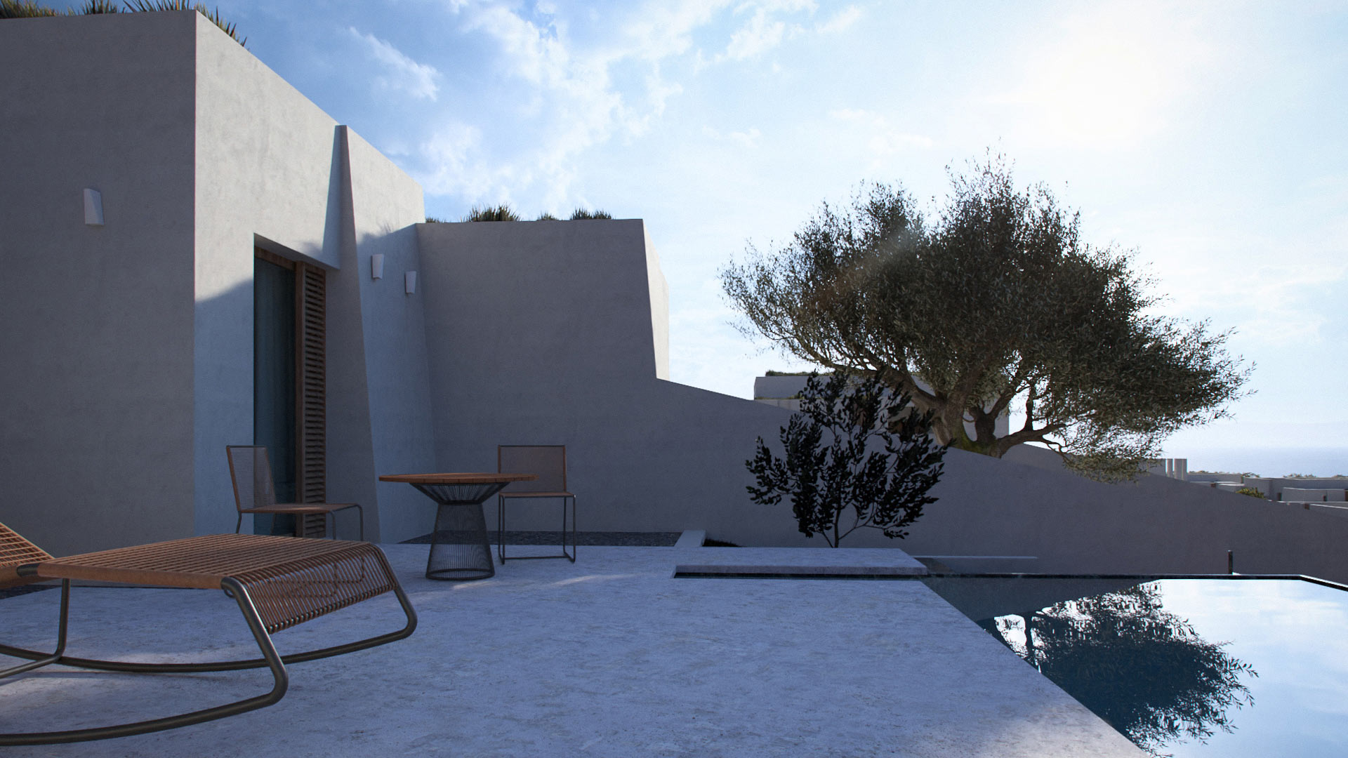The hotel’s buildings feature white cubist volumes of varying heights, paying homage to traditional Cycladic architecture. Modern additions, such as diagonal walls that protrude from the main volumes, add relief to the surfaces. Vertical and diagonal walls with slits of different sizes create galleries and passages, playing with light and shade in a visually engaging manner.