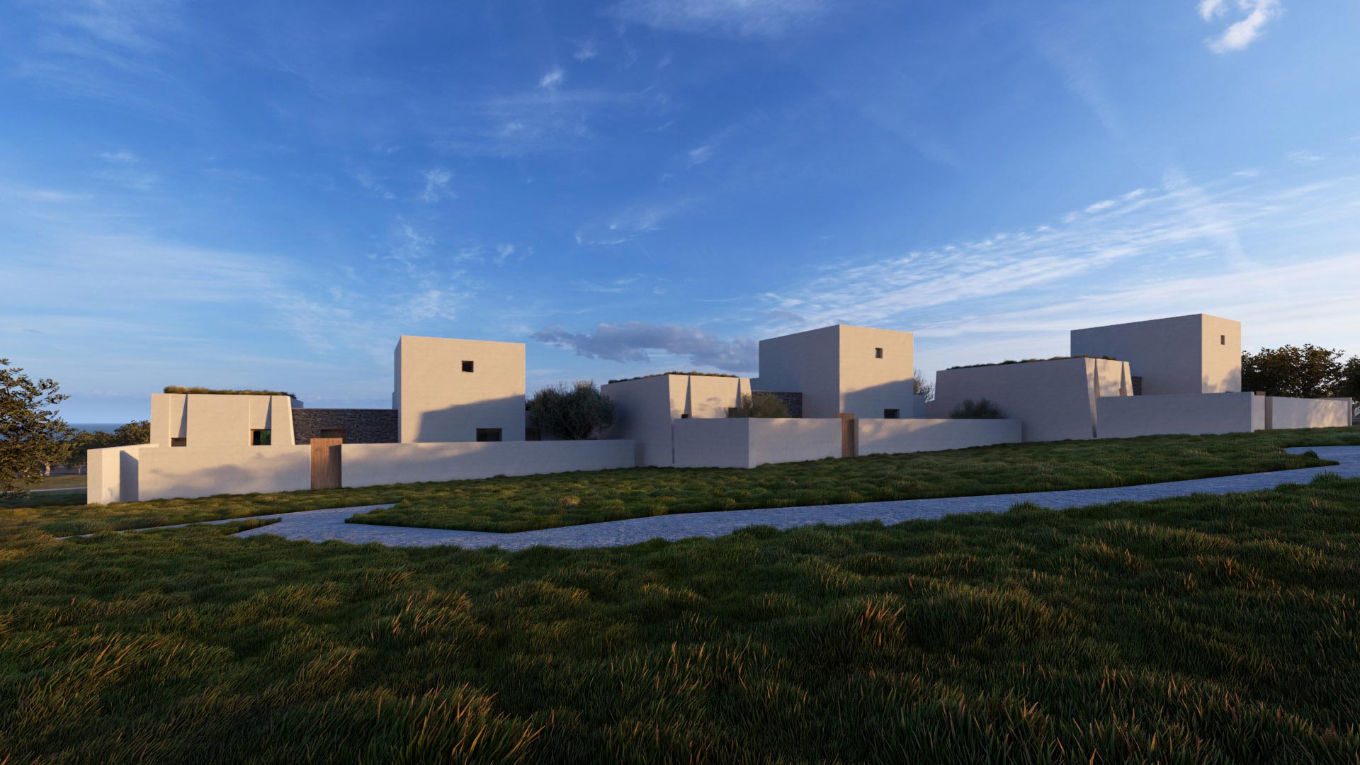 Surrounding the hotel is a landscaped garden featuring Mediterranean herbaceous shrubs, olive trees, lemon trees, fig trees, and pedestrian pathways. The green roofs on the buildings contribute to a sense of continuity with the landscape, creating a harmonious blend between architecture and nature.