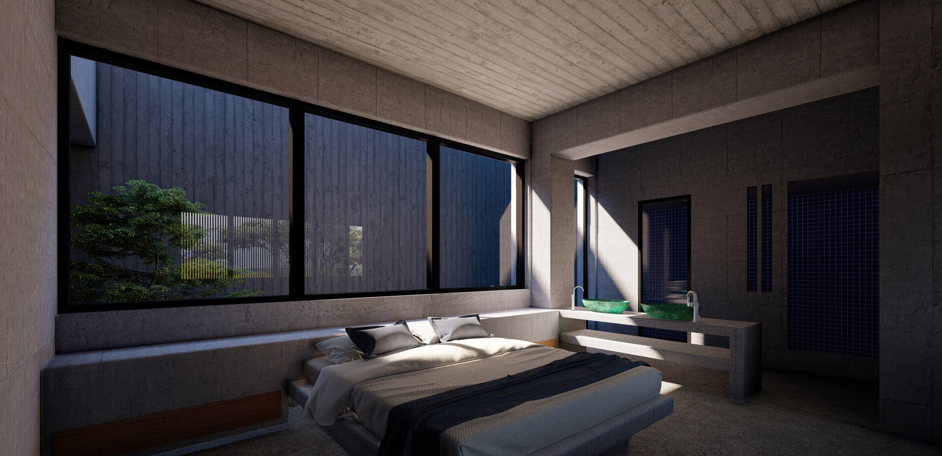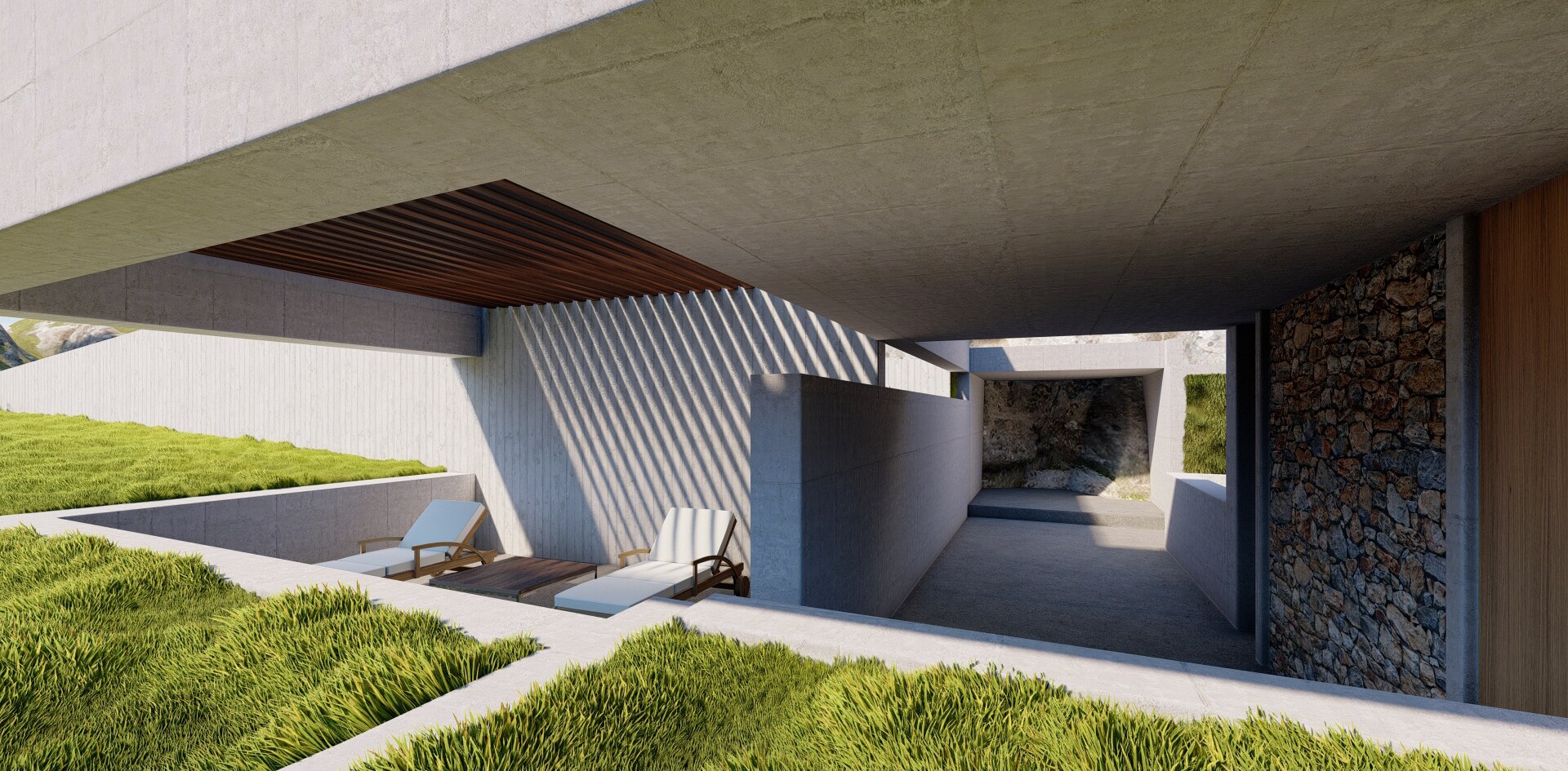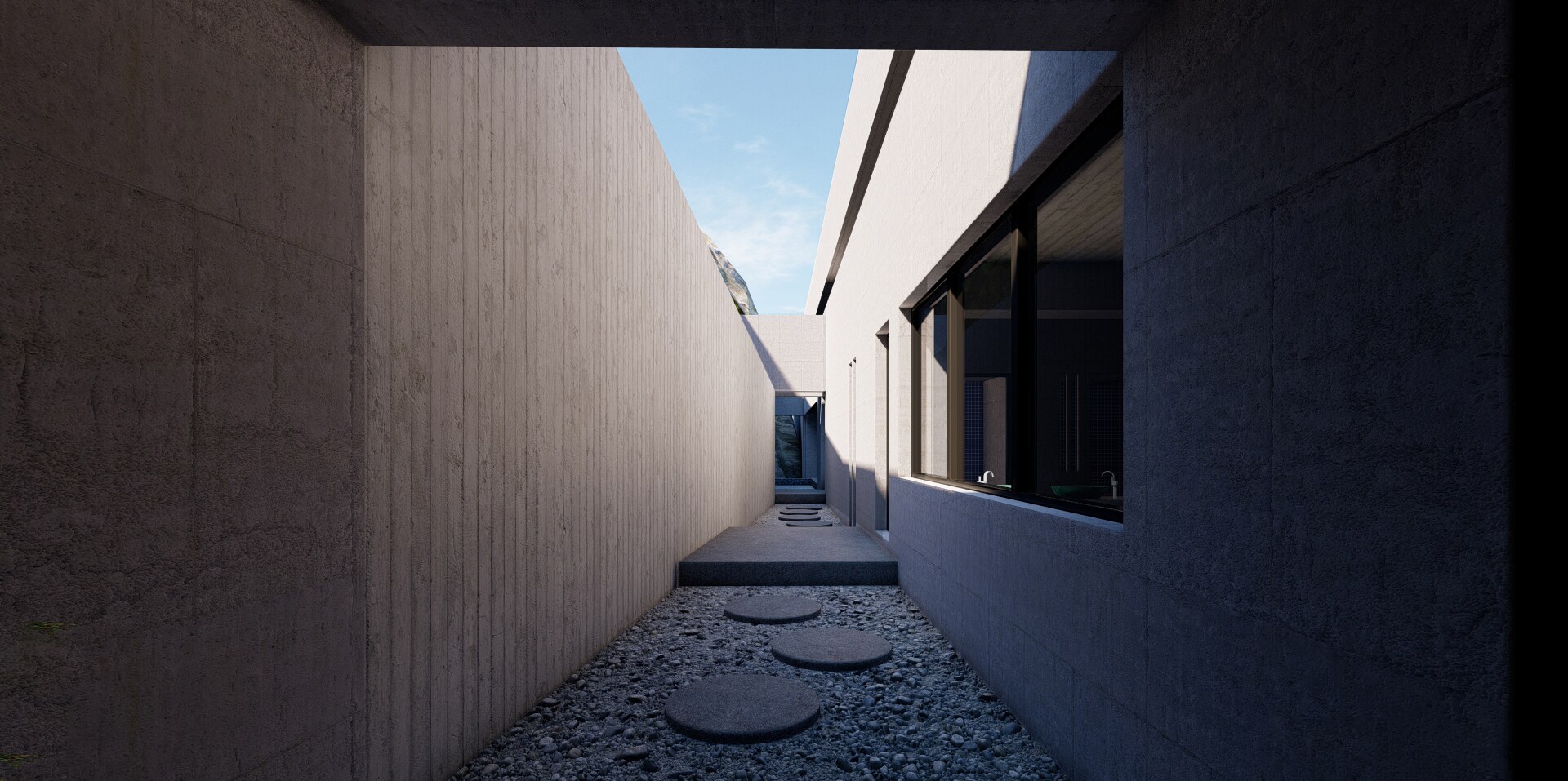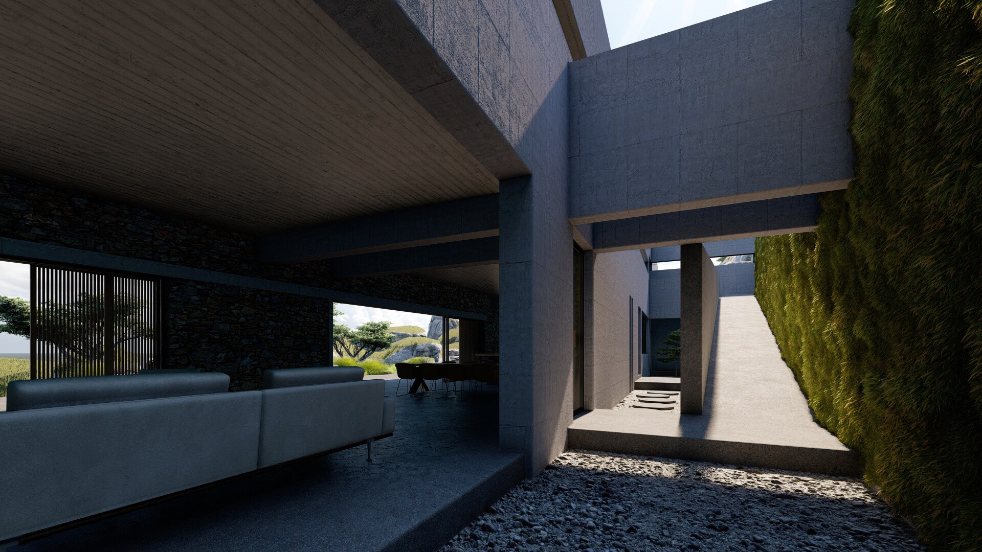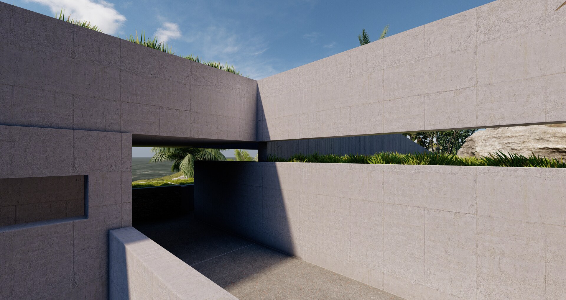 A long concrete wall supports the rock and the house. Between the two, an inner backyard is formed, that contributes in indirect ambient lighting, natural ventilation of the rooms, privacy and isolation. Japanese architecture, based on nature and spiritualism, is often designed for introspective time. This characteristic is often carried over into contemporary residential design. In the project, introspection is achieved in a variety of ways, such as the view of the single tree outside the master bedroom in the backyard (from which only the sky is visible).