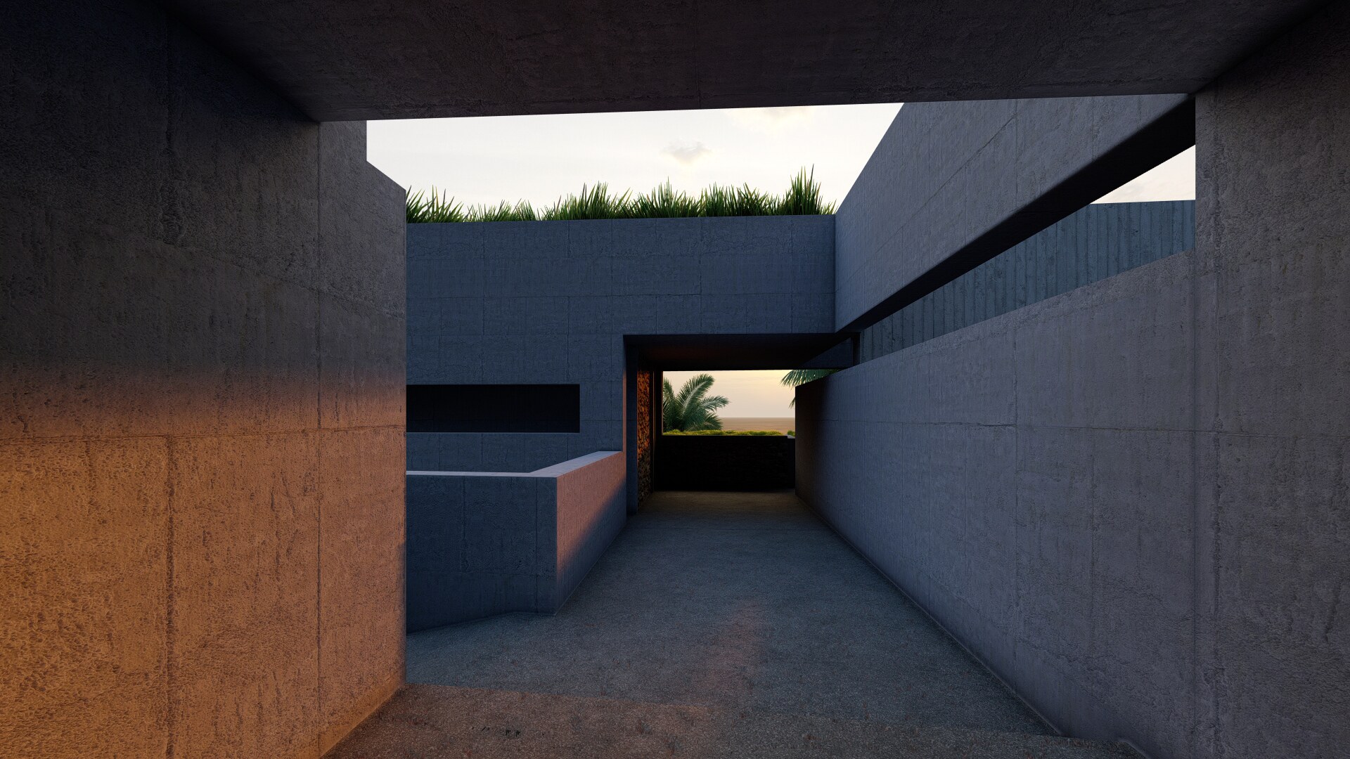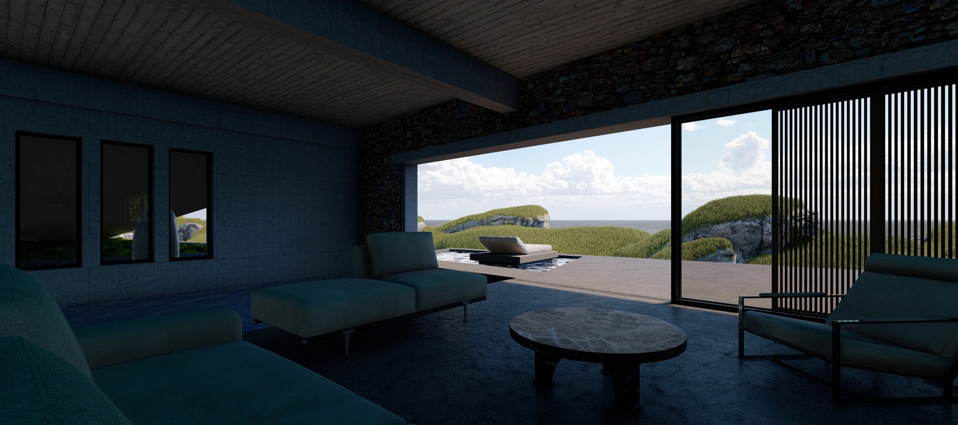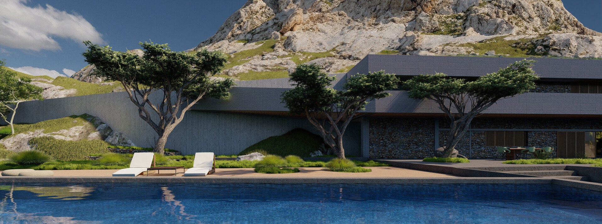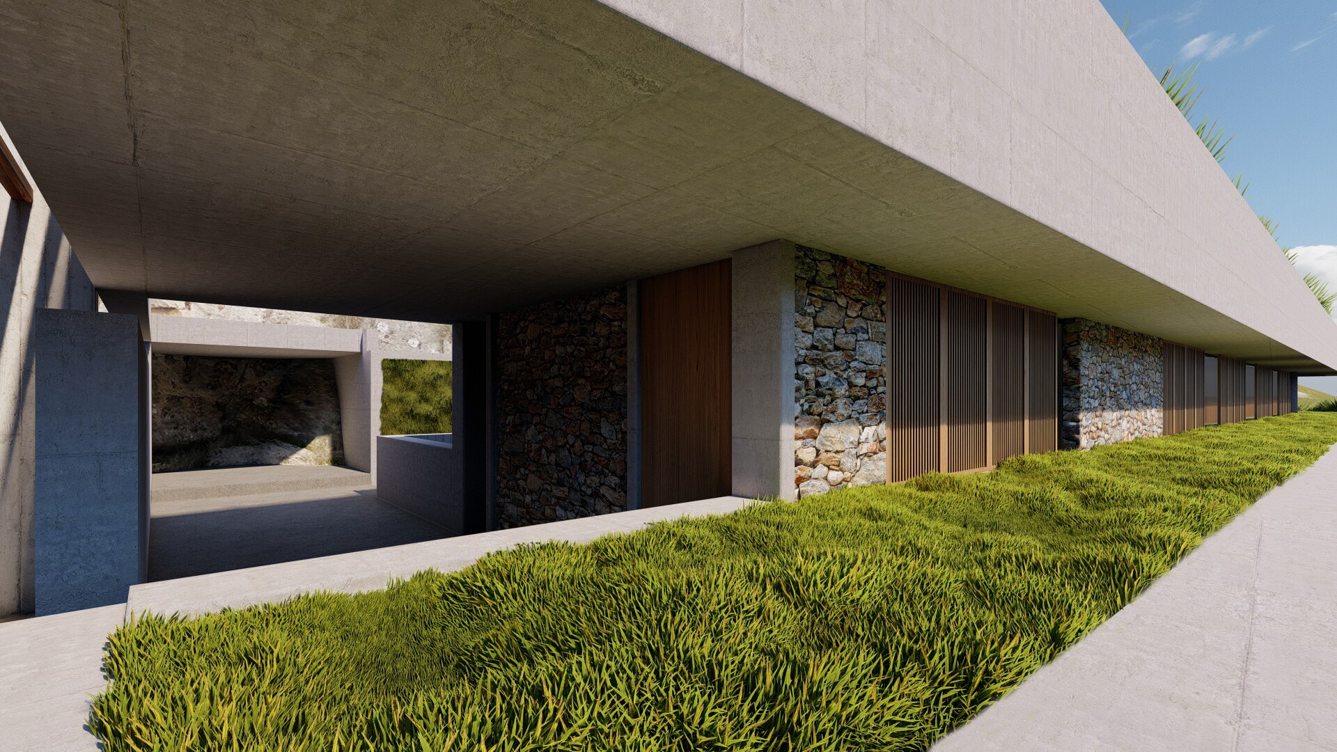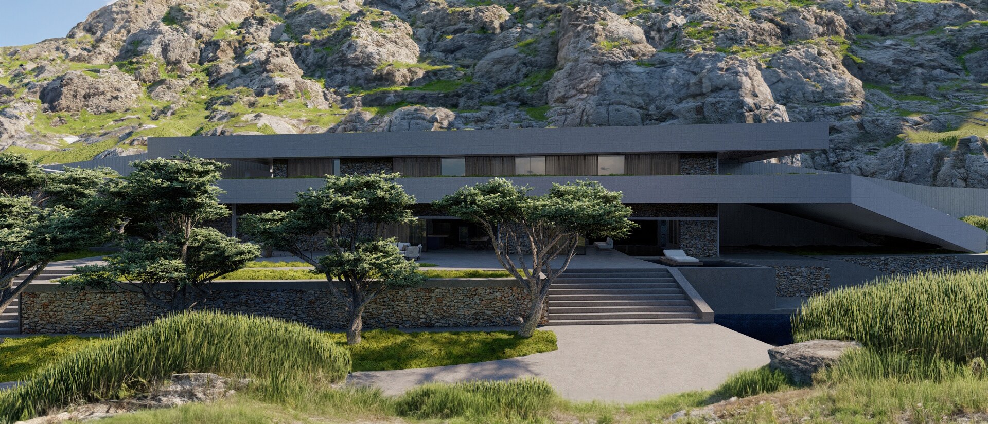 A long concrete wall supports the rock and the house. Between the two, an inner backyard is formed, that contributes in indirect ambient lighting, natural ventilation of the rooms, privacy and isolation. Japanese architecture, based on nature and spiritualism, is often designed for introspective time. This characteristic is often carried over into contemporary residential design. In the project, introspection is achieved in a variety of ways, such as the view of the single tree outside the master bedroom in the backyard (from which only the sky is visible).