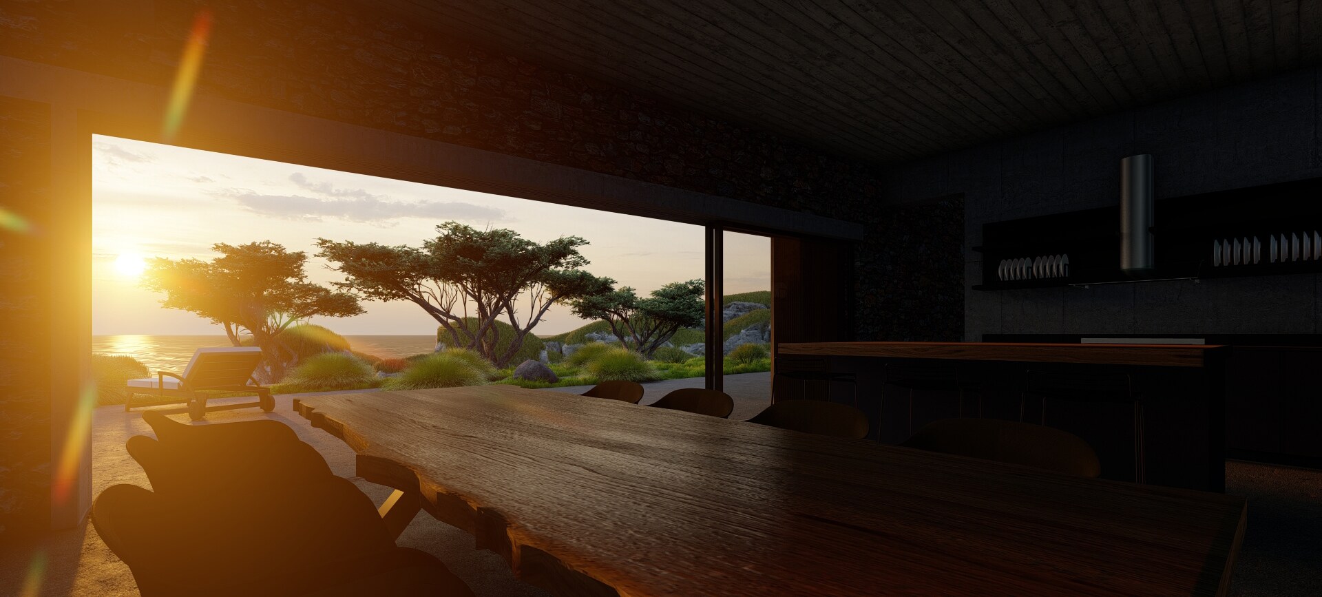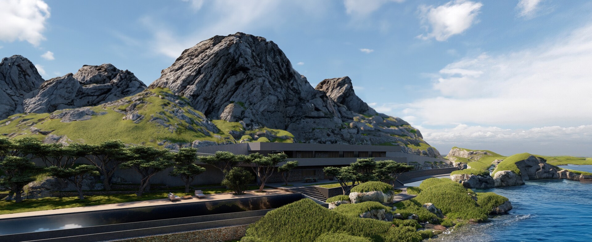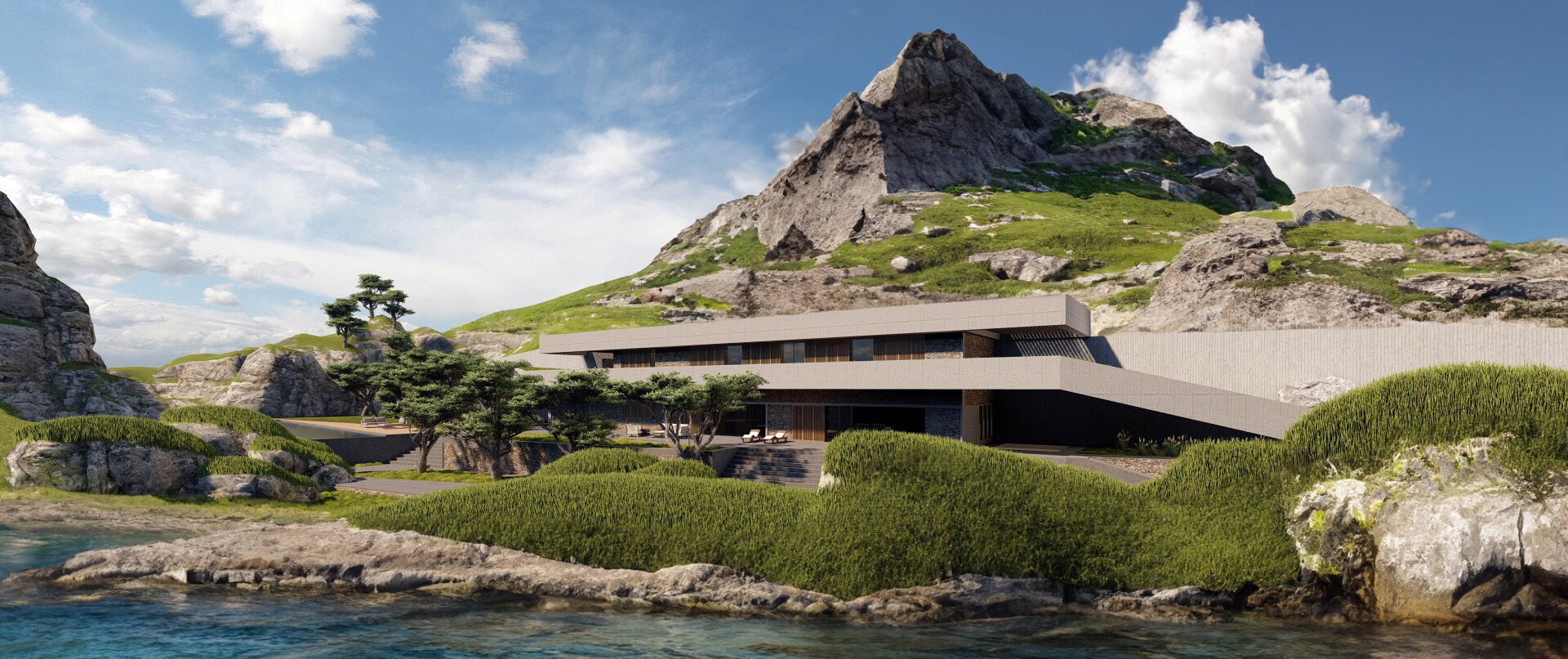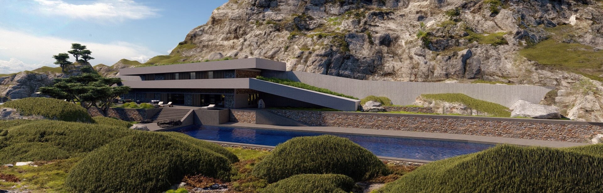 On a small island in the Japanese archipelago iraisynn attinom studio designed a modern retreat. Basically the building is two cantilevers following the lines of the landscape, made by concrete, emerged from the ground, projected from the rocky mountain and facing towards the ocean. The design follows some of the modern Japanese architecture principles such as the simplicity, functionalism, straightforward expression of materials and construction, geometric composition devoid of superficial ornamentation, standardization of parts, unity of house and garden.