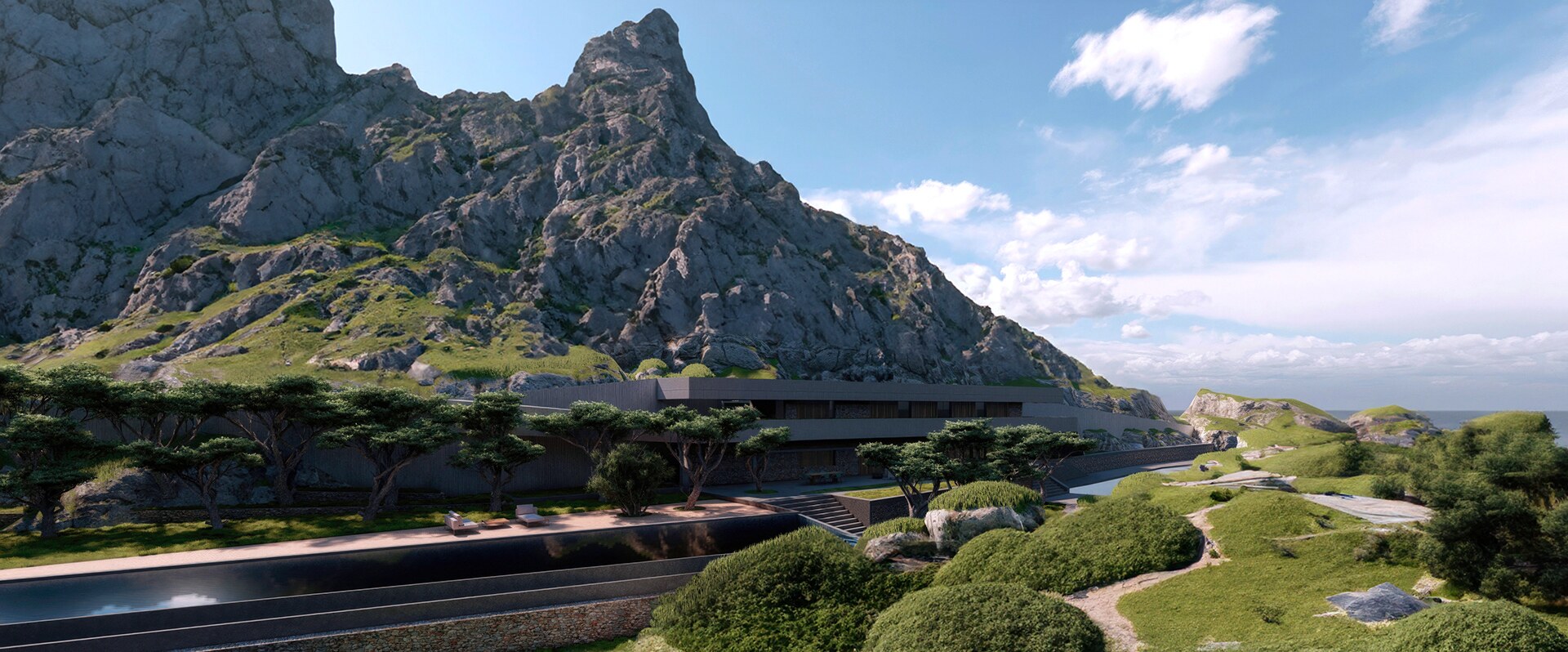 The project is characterized by clean lines, the design of complex spatial circulation while maintaining the principle of simplicity, the mix of natural materials (stone, wood, metal, glass) with concrete, large openings, open floor plans, green roofs and a subdued color palette. Japanese design emphasizes the concept of “ma,” which refers to the space between objects and the importance of negative space in creating balance and harmony. The Japanese garden and the natural rocky environment that surround the construction aim to create tranquil reflection and visually pleasure for the residents. Green roofing is used for pollution and heat absorption, storm-water management, and general air quality improvement.